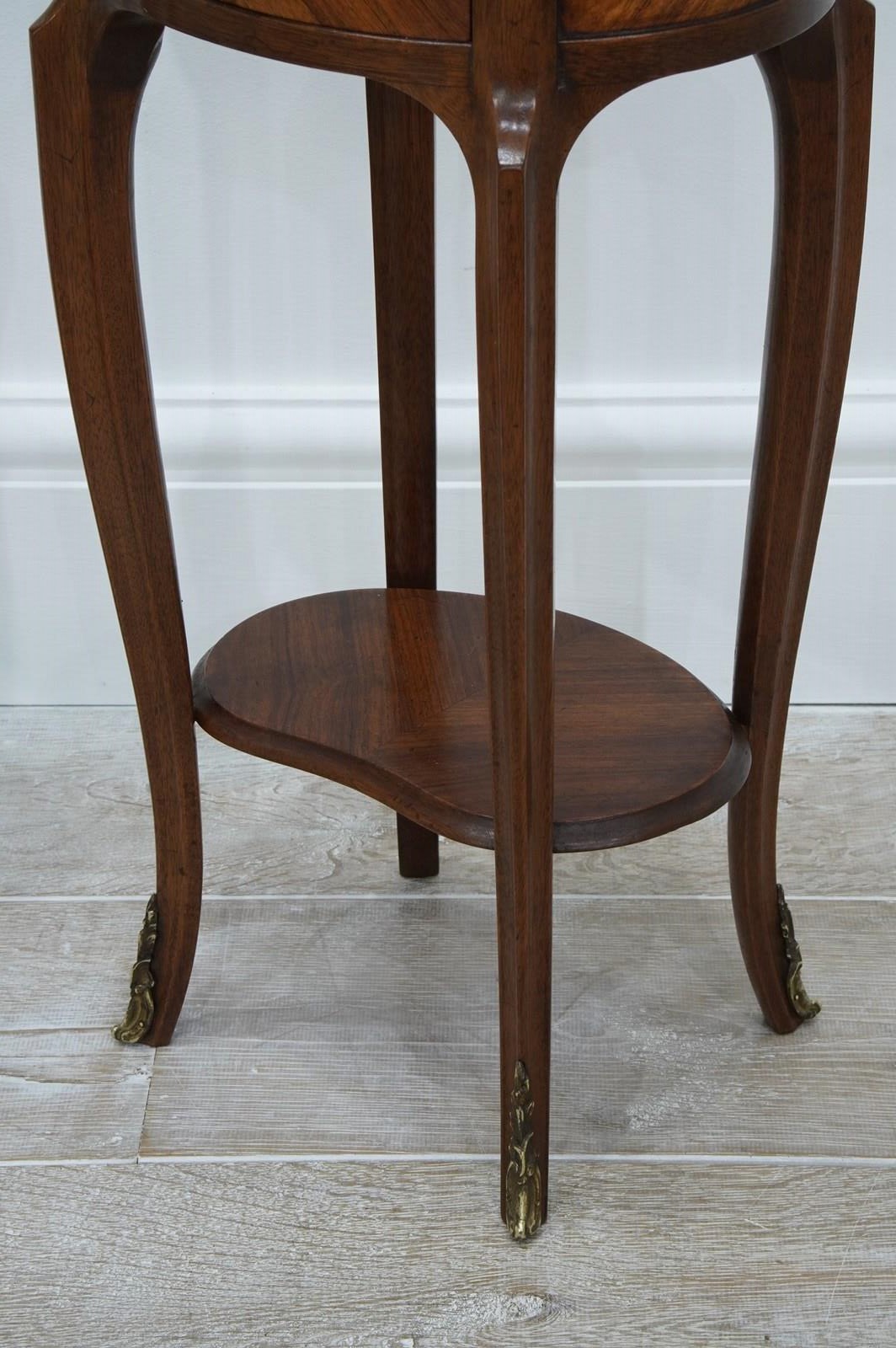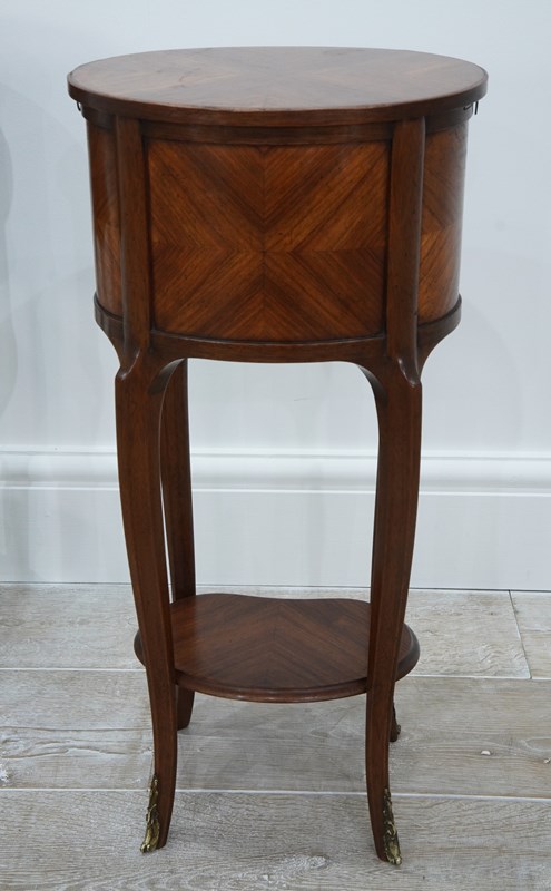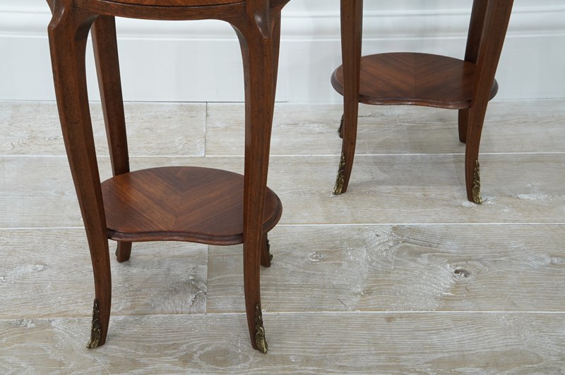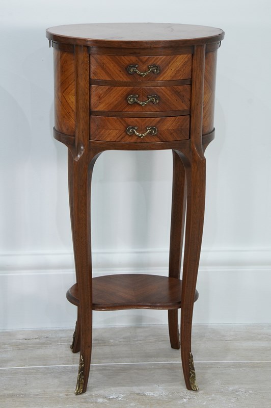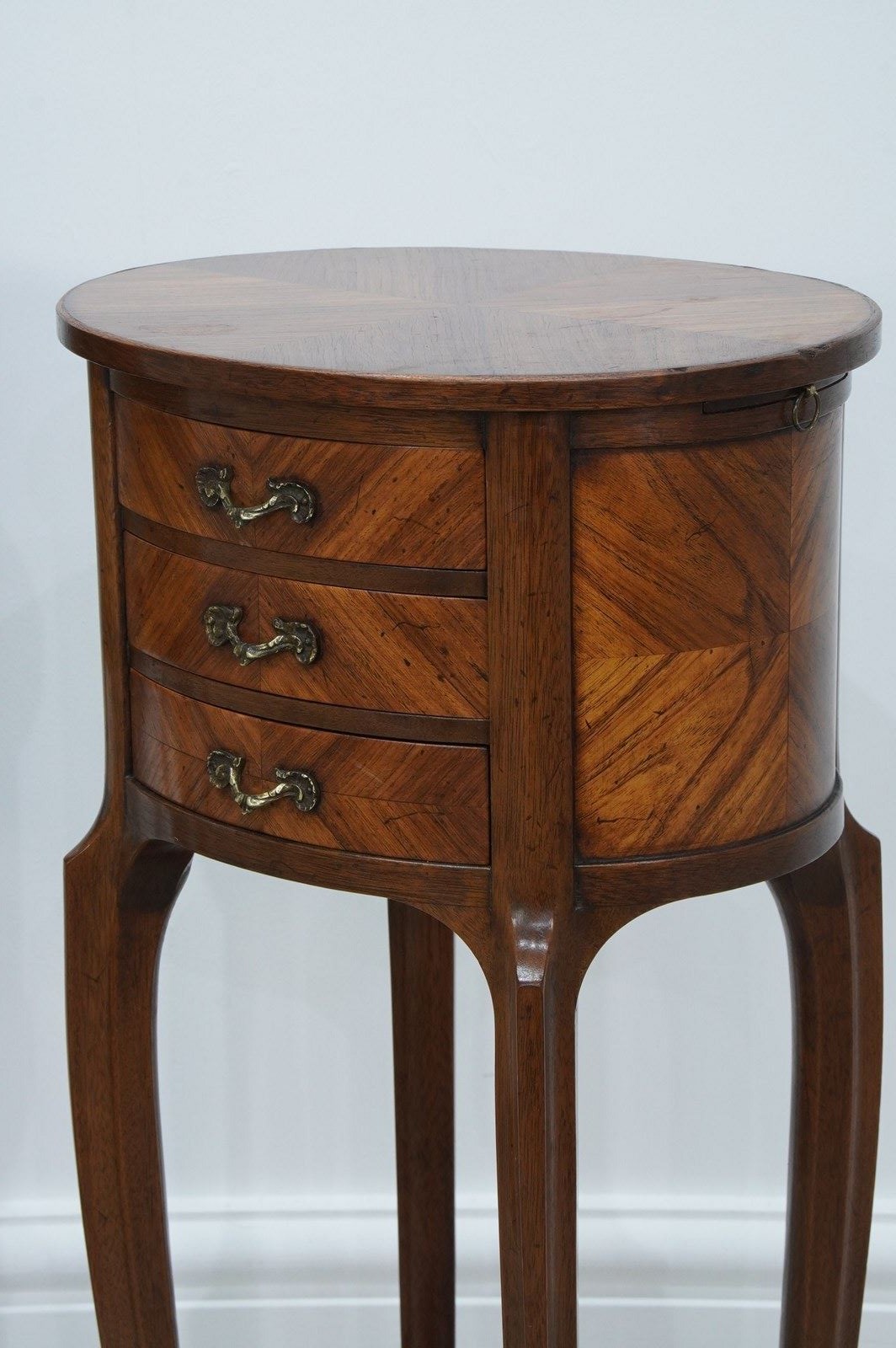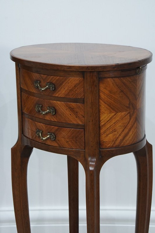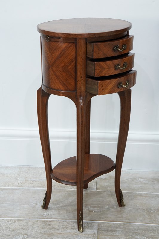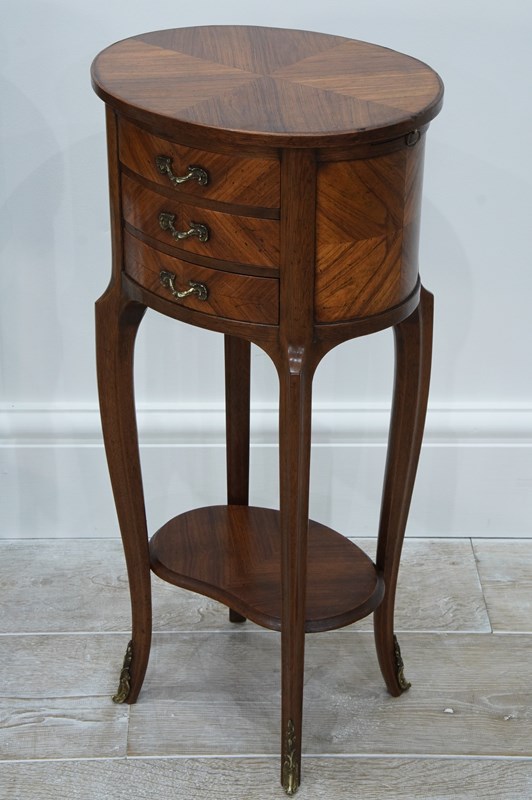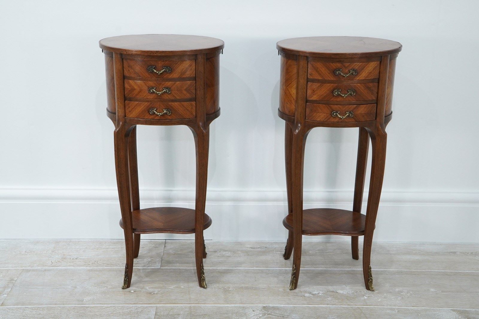A neat pair of French bedside tables with shelves beneath. The oval tops to these pretty bedsides boast a series of walnut veneers creating a uniform chevron design this being repeated on the sides, backs and drawer fronts. Each bedside has the advantage of two small pull out trays to the tops, perfect for the morning beverage! Below are three drawers, each with the original polished French brass handle.