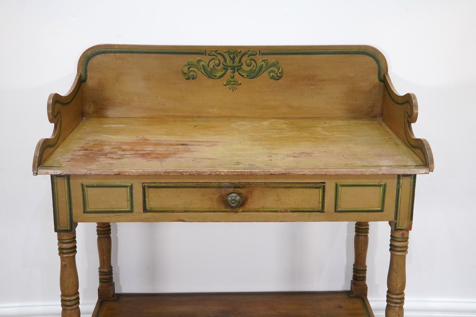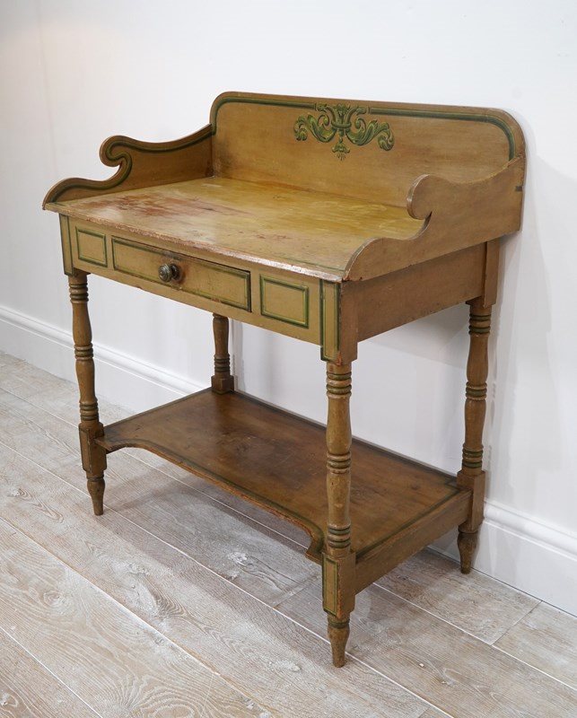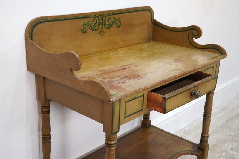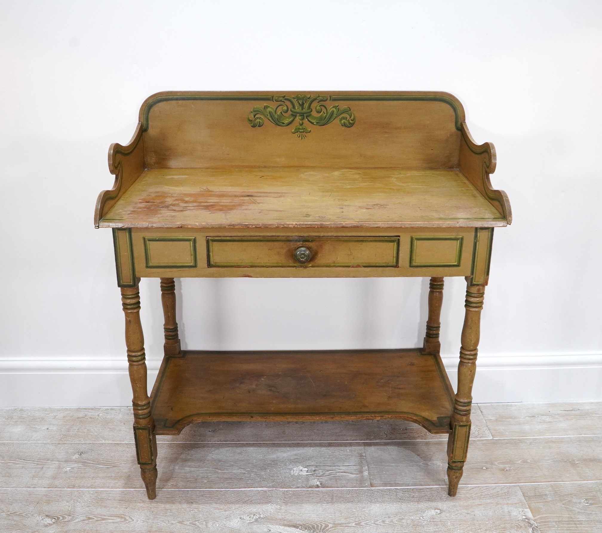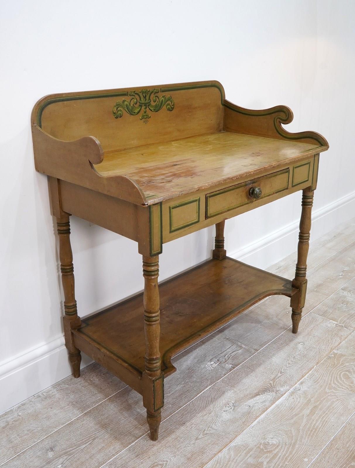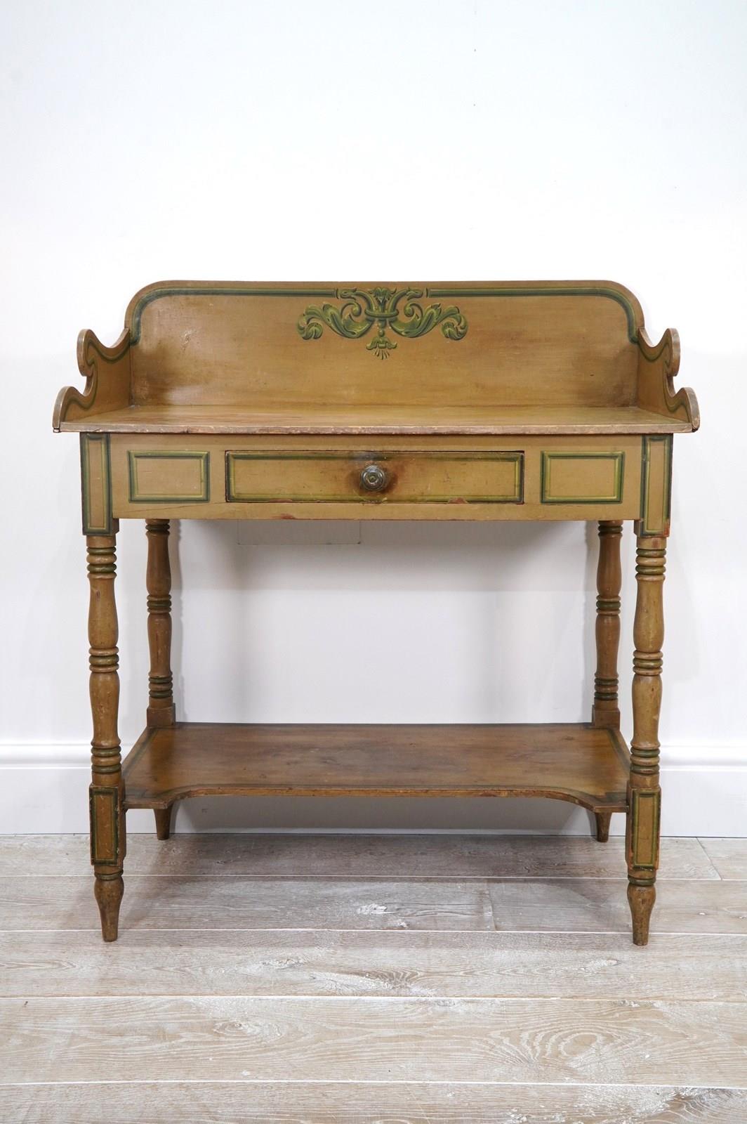 A mid 19th century washstand side table. The legs and main body are decorated with green lines together with an intricate hand painted design to a raised gallery all displayed prominently against a buff background. There some minor rub marks and natural wear only enhancing the authenticity and history of this pretty table. Original painted washstand / side table circa 1860.