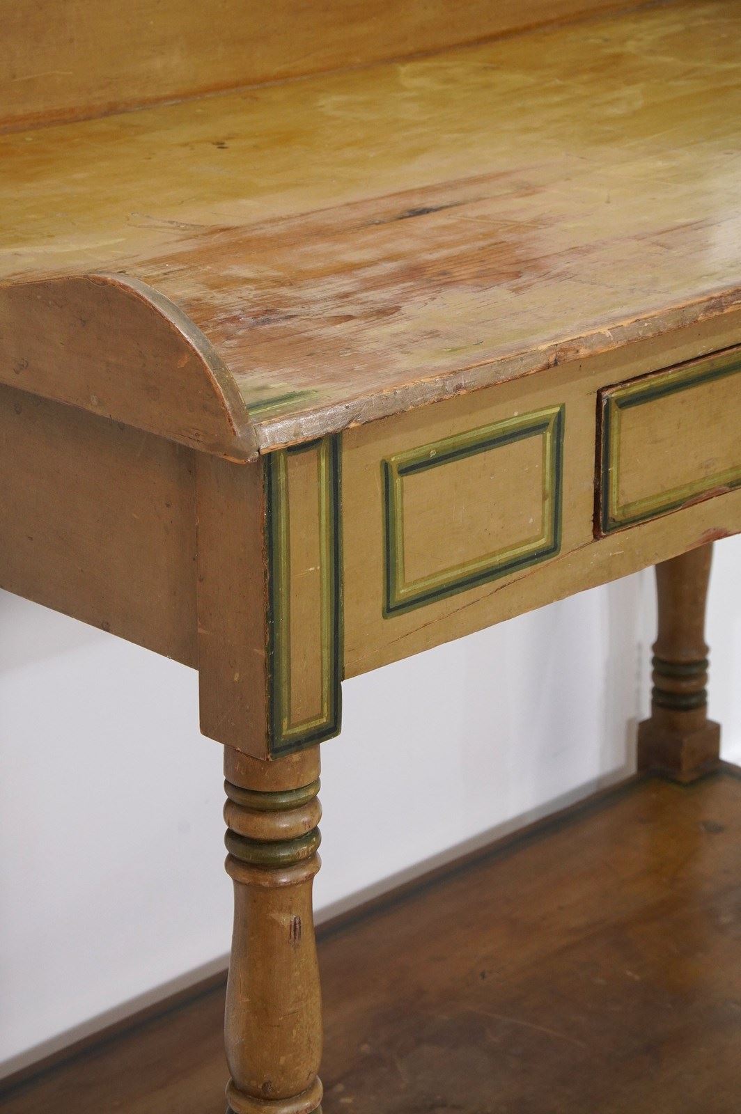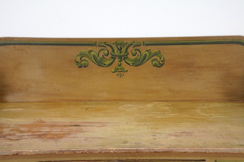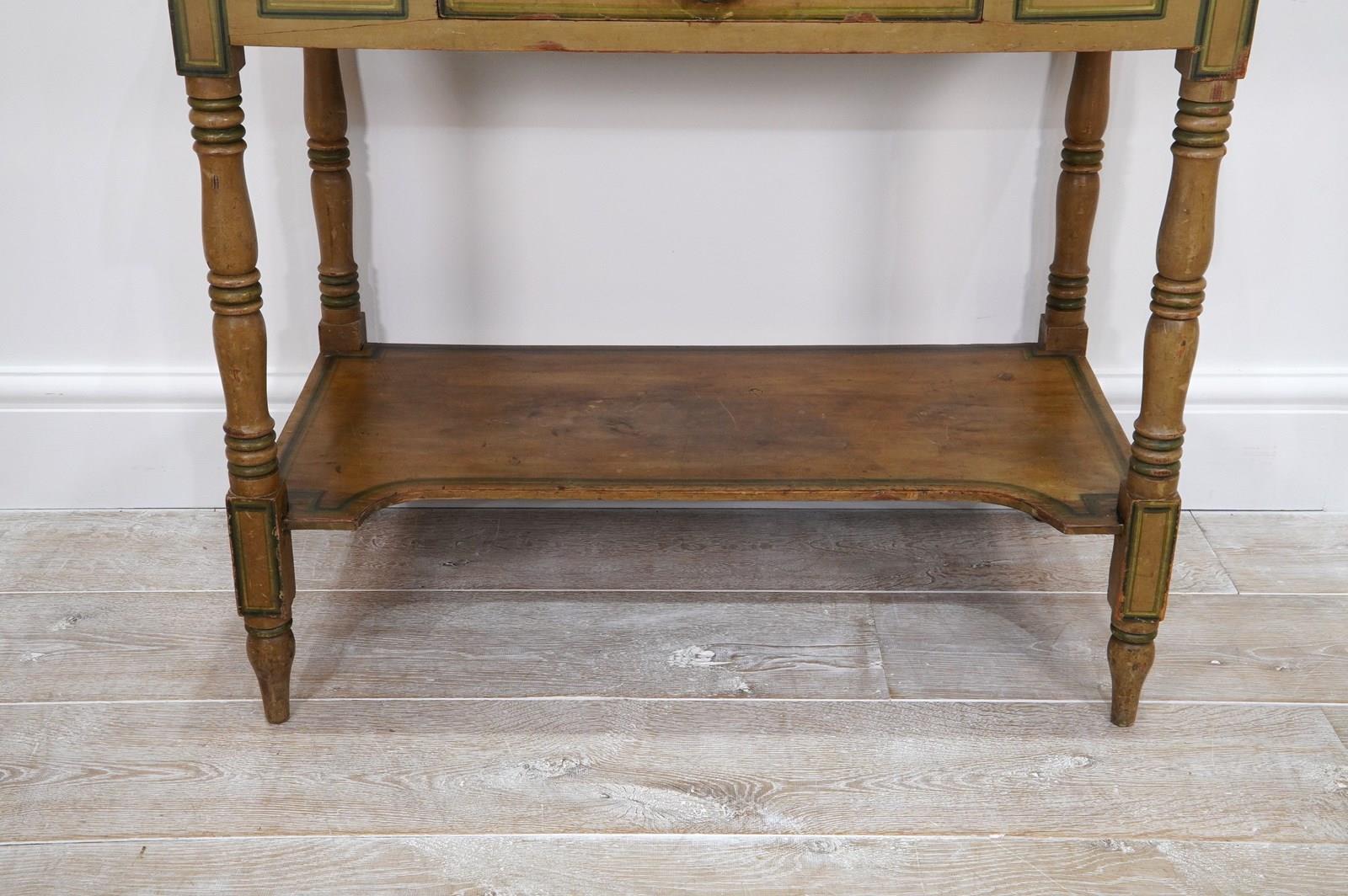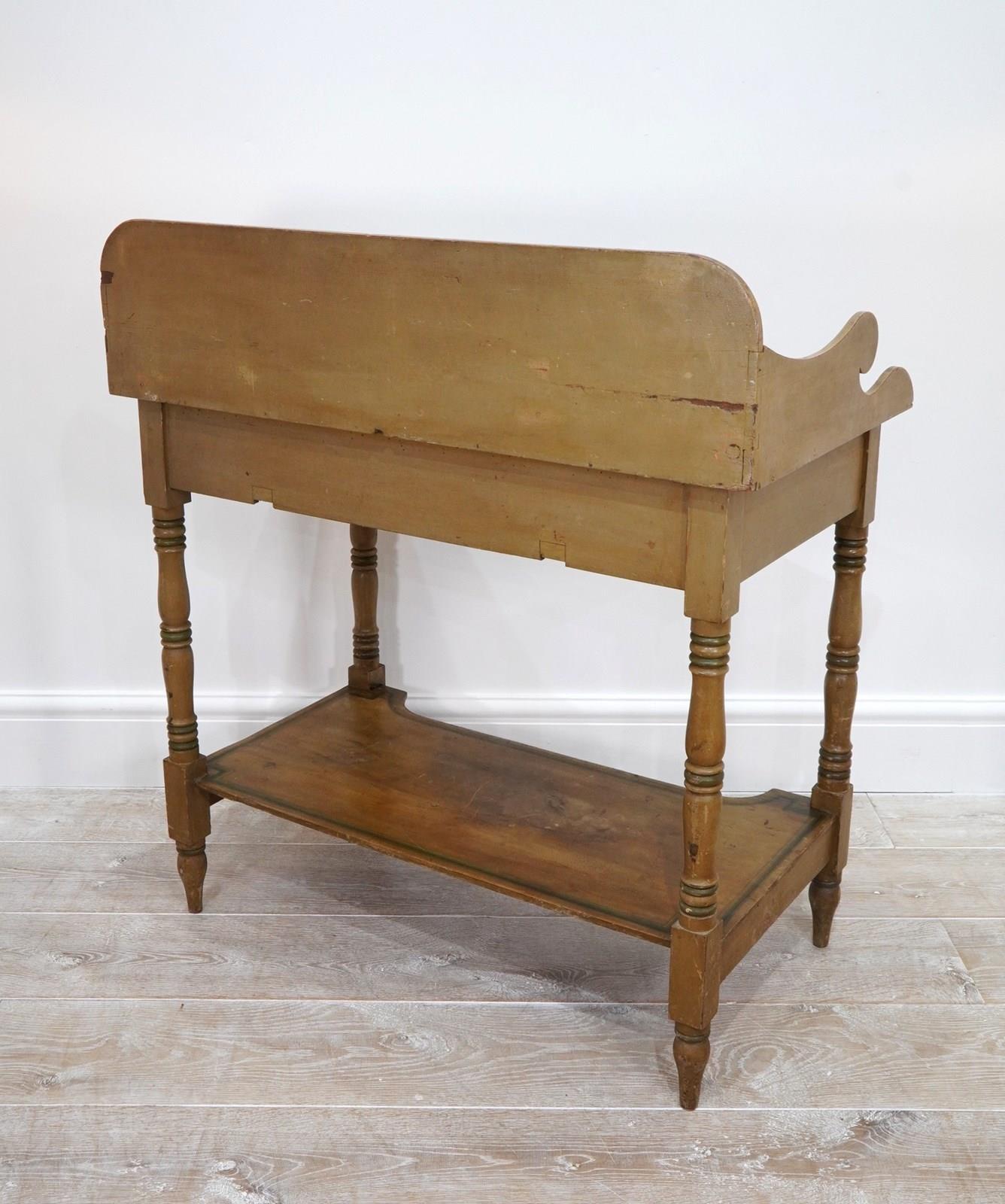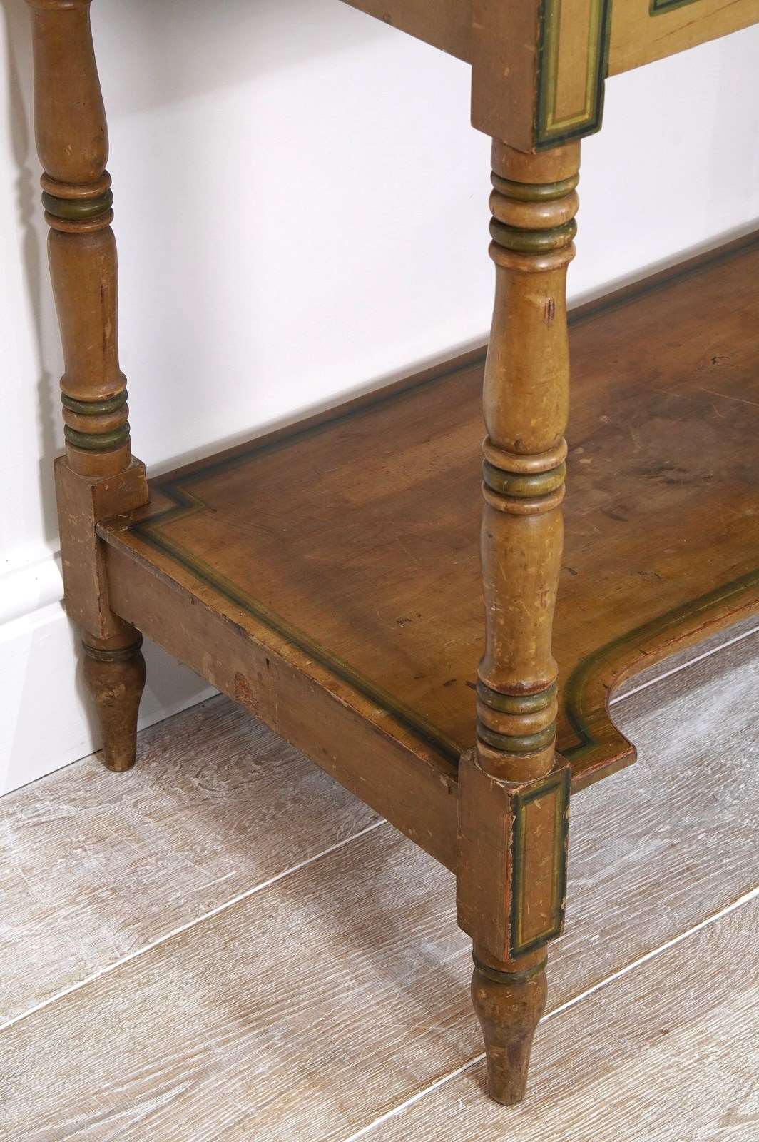 A mid 19th century washstand side table. The legs and main body are decorated with green lines together with an intricate hand painted design to a raised gallery all displayed prominently against a buff background. There some minor rub marks and natural wear only enhancing the authenticity and history of this pretty table. Original painted washstand / side table circa 1860.