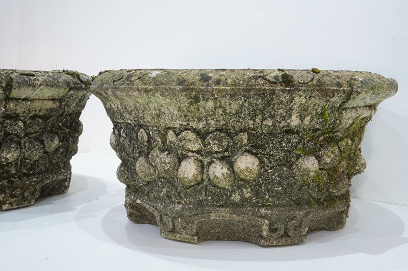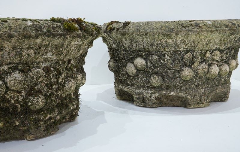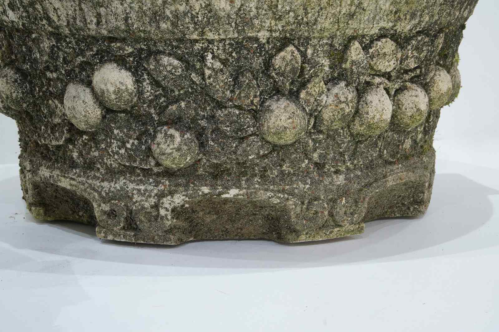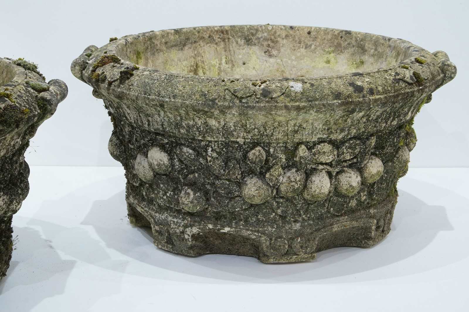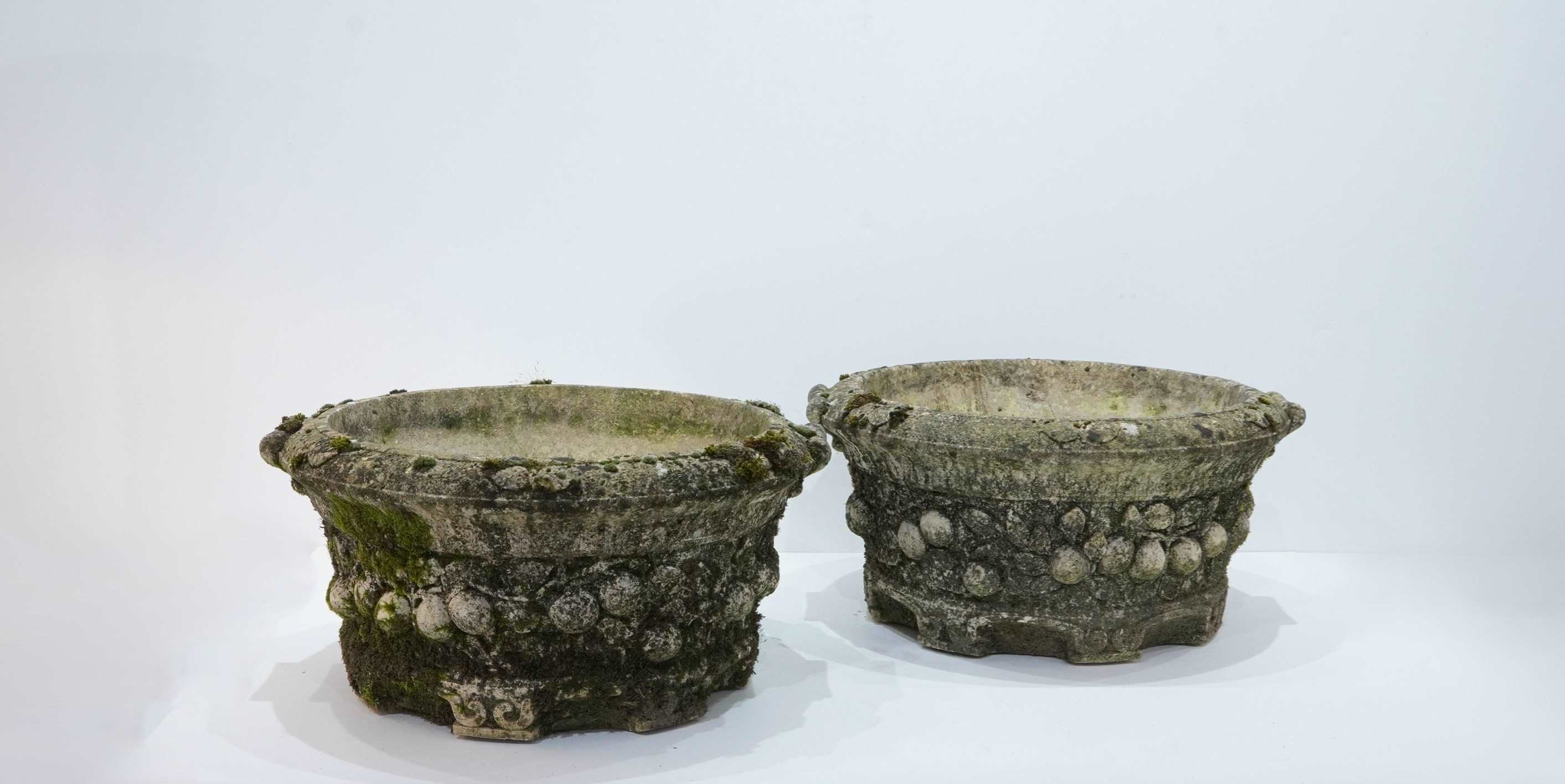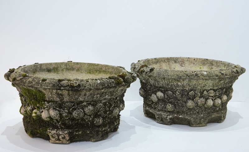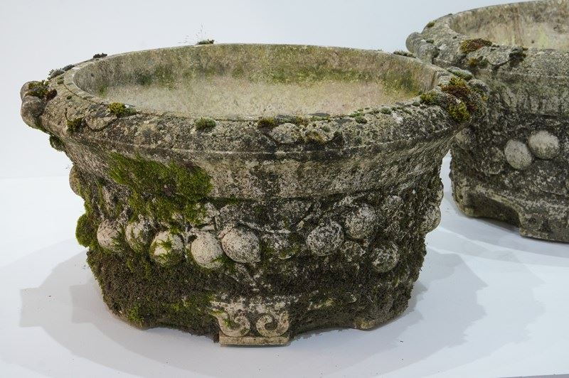 A large pair of cast stone circular garden planters. These decorative planters have good scale and good depth with plenty of space for maximum planting. Each planter is decorated with a raised design of fruits and leaves entwining around the entire outer surface. Raised on low evenly spaced feet. Superb original condition with no cracks or faults. Nicely weathered with decades of moss and lichen. English garden planters. Circa 1960.