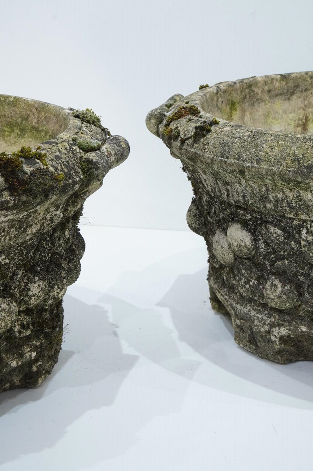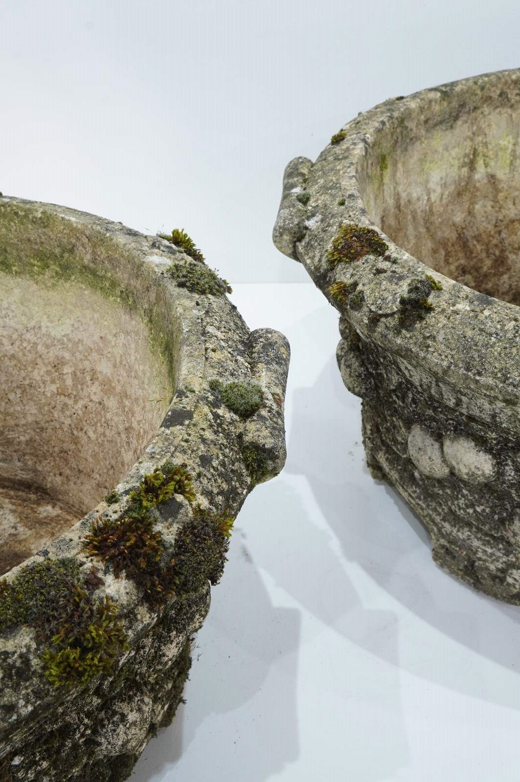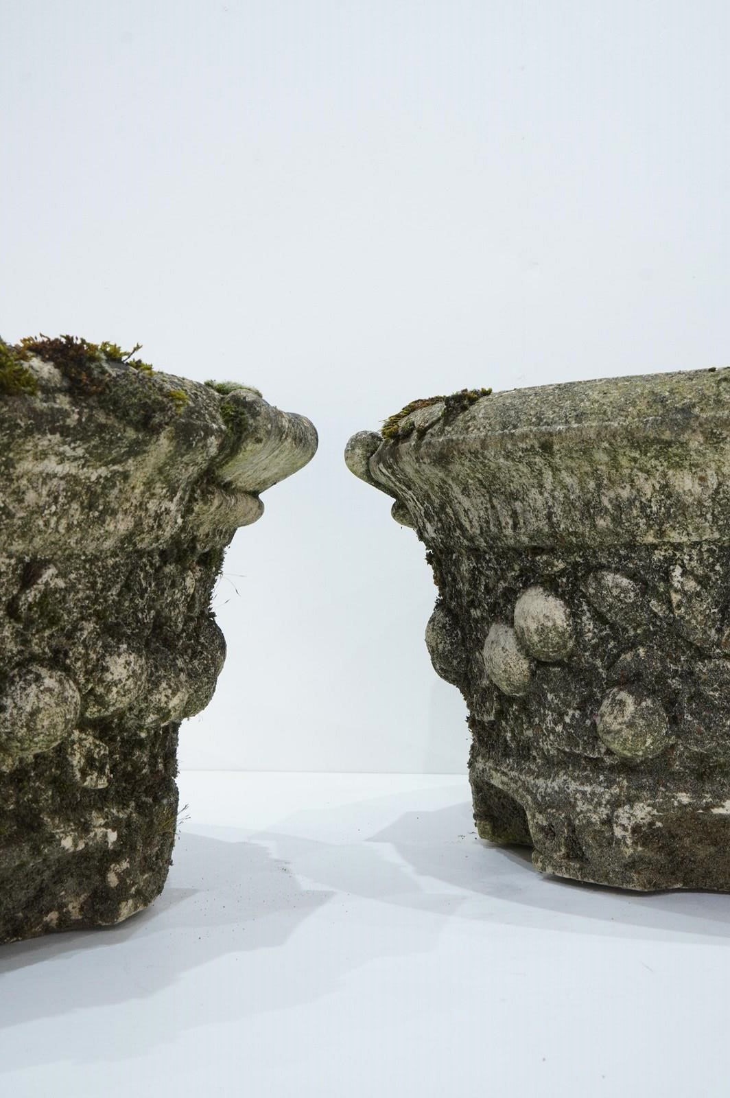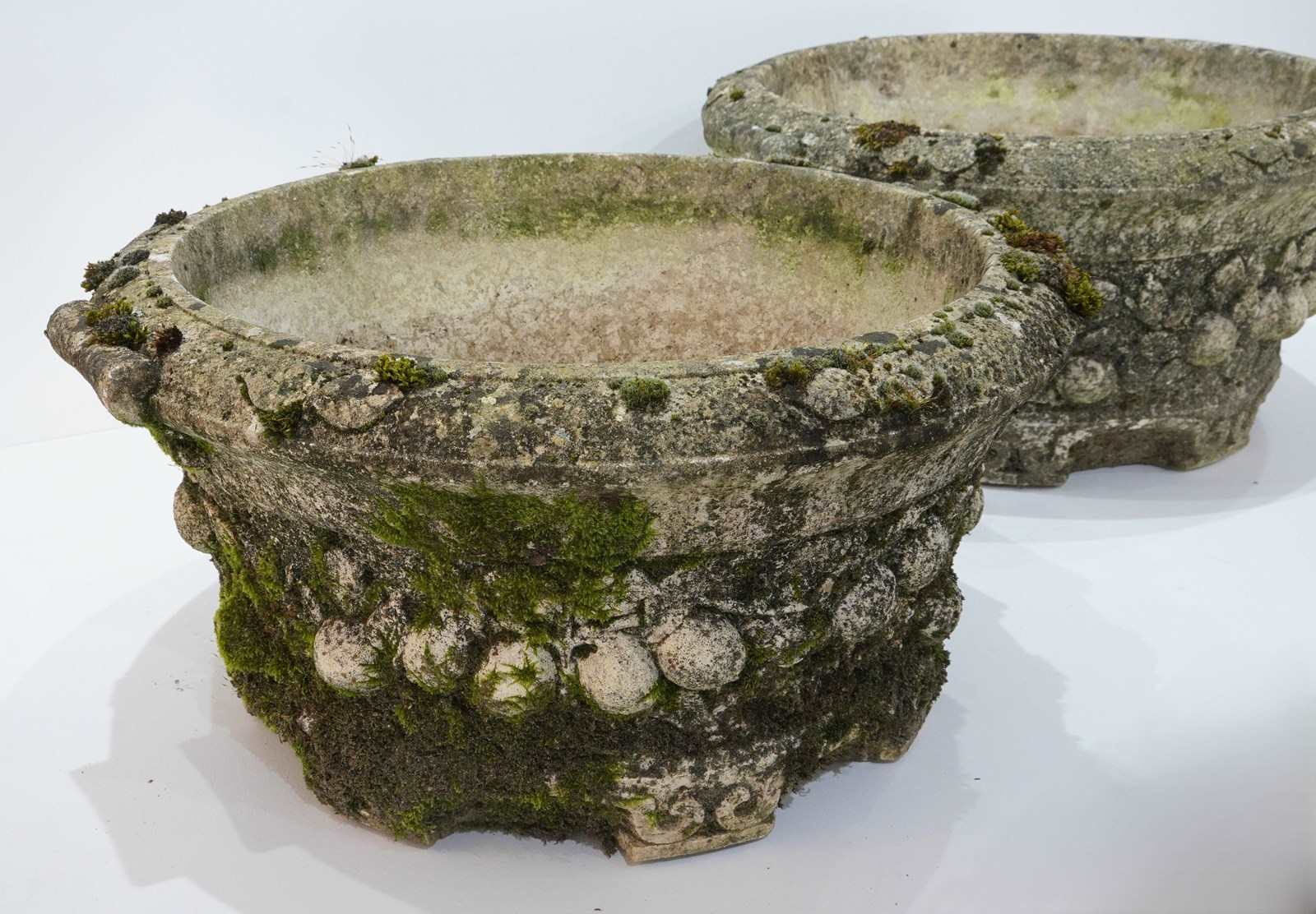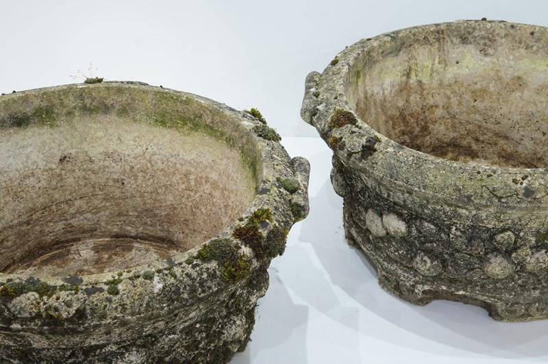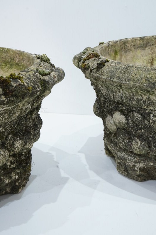 A large pair of cast stone circular garden planters. These decorative planters have good scale and good depth with plenty of space for maximum planting. Each planter is decorated with a raised design of fruits and leaves entwining around the entire outer surface. Raised on low evenly spaced feet. Superb original condition with no cracks or faults. Nicely weathered with decades of moss and lichen. English garden planters. Circa 1960.