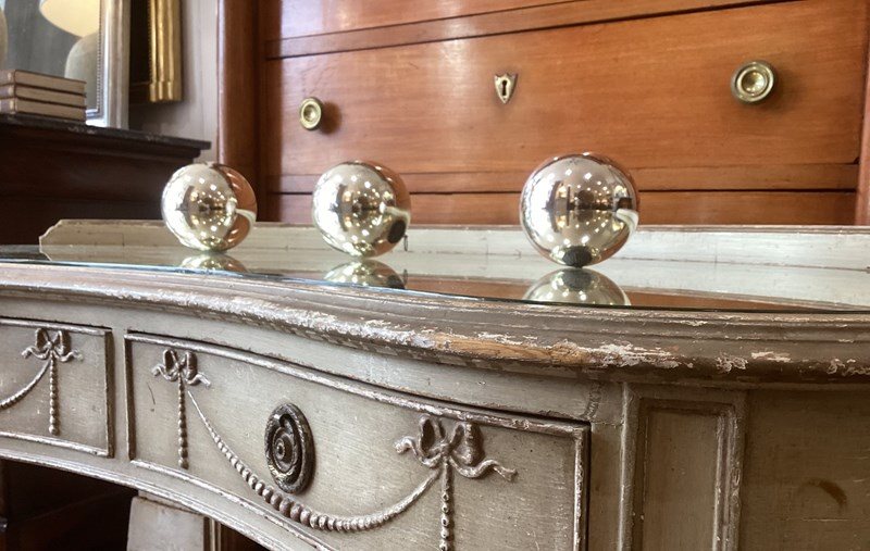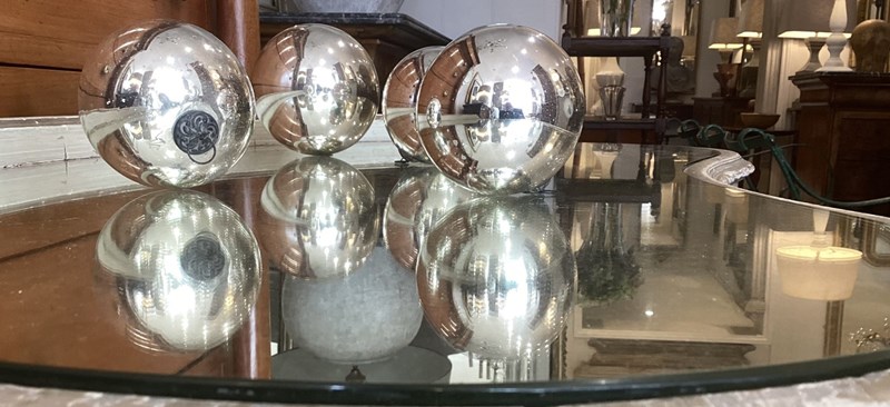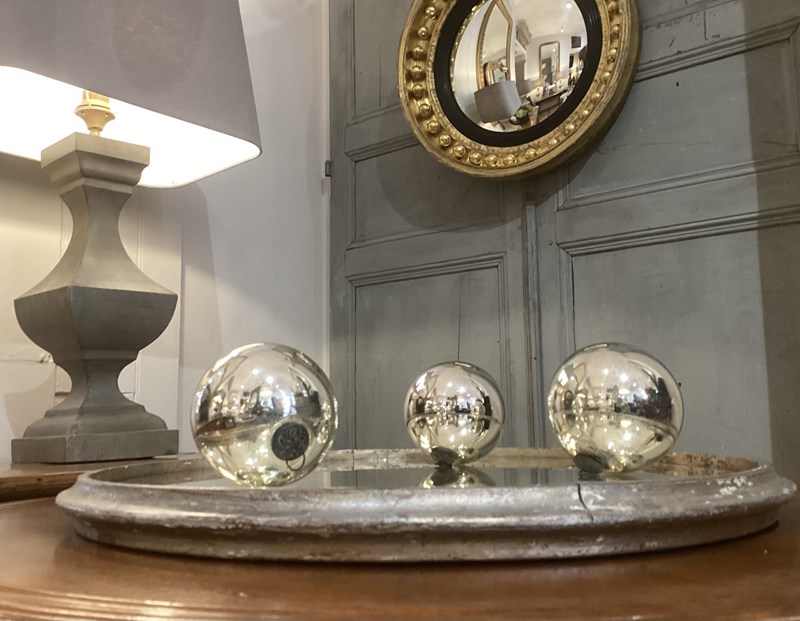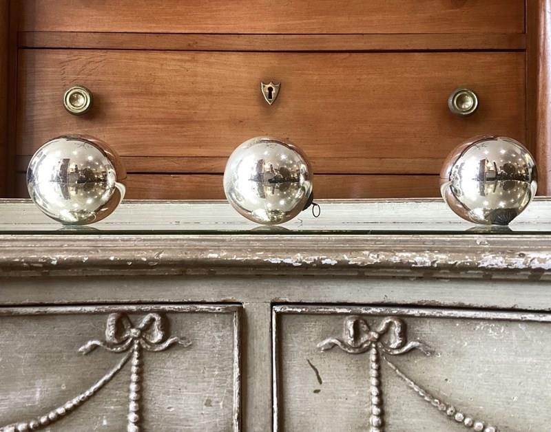 Three small scale antique silver mercury glass witch balls. Some foxing and speckles consistent with their age and history. Original hanging loops intact. Circa 19th century.