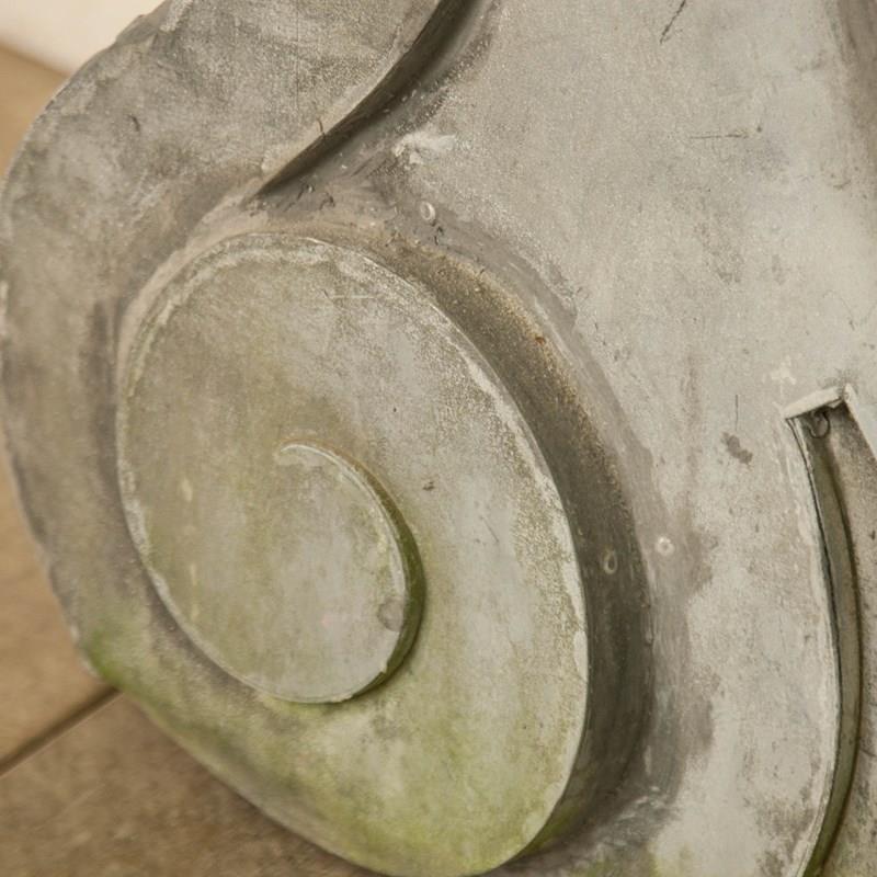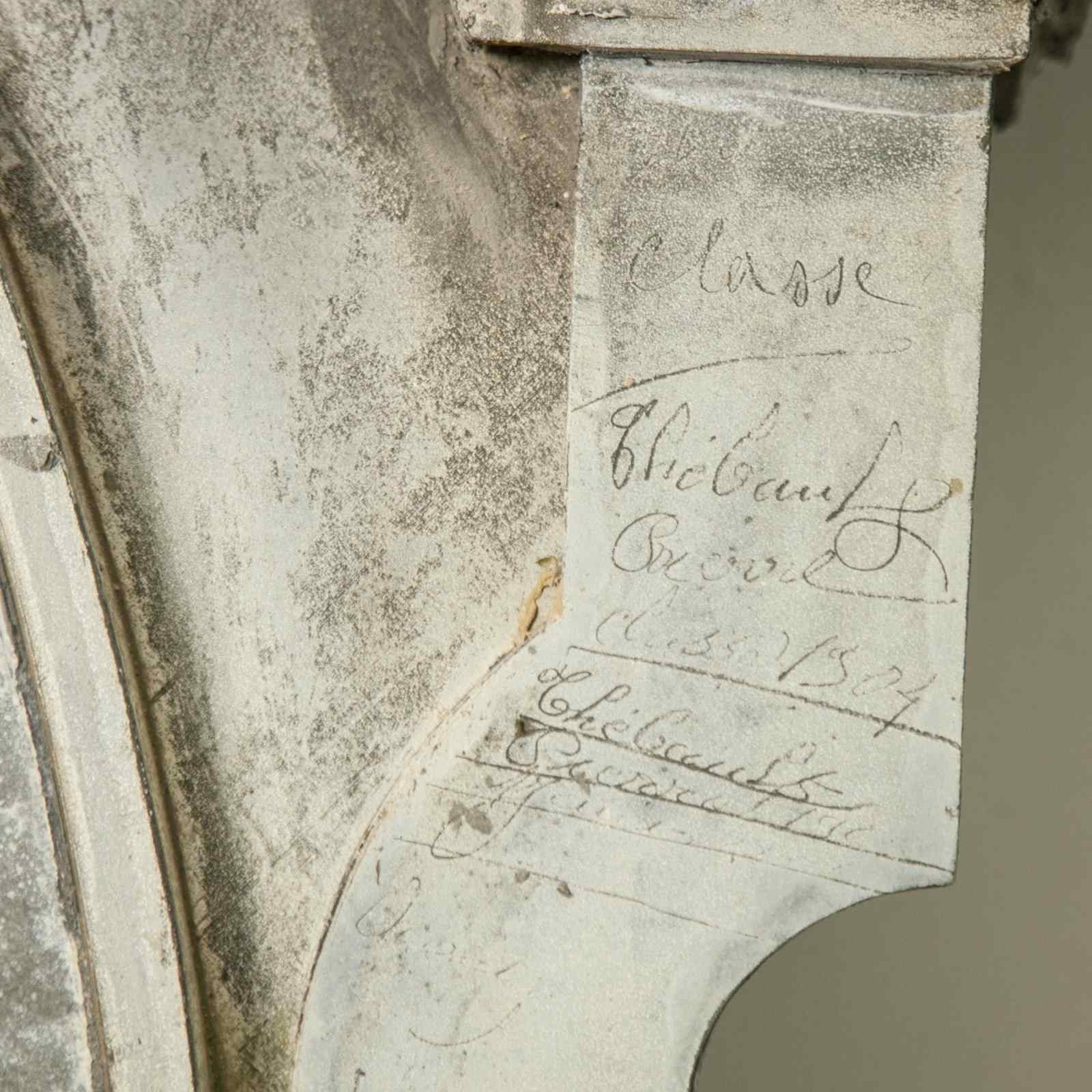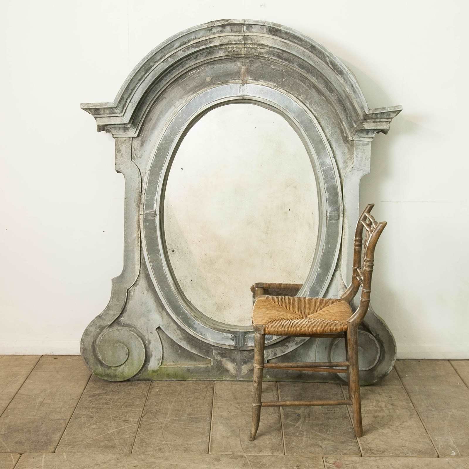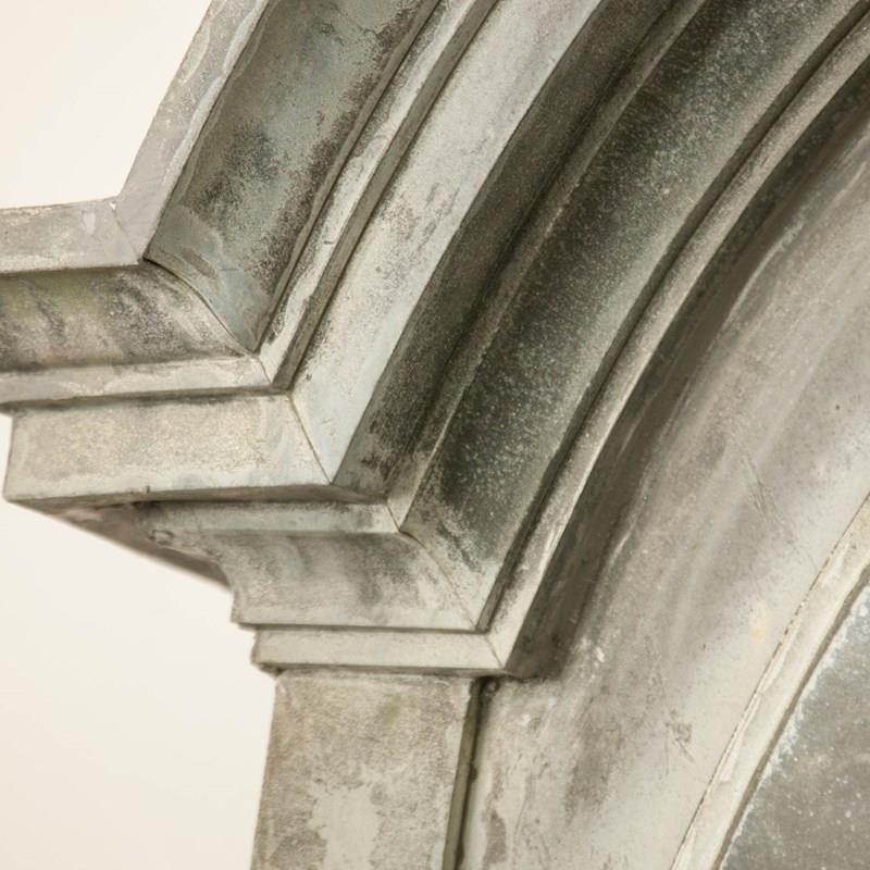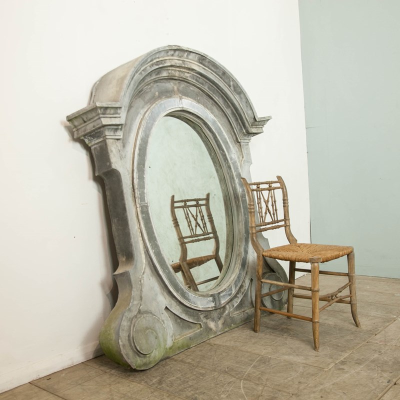An architectural zinc frame, "Oeil de Boeuf" adapted to frame a later, antiqued mirror plate. Large scrolls and stately mouldings create an imposing frame.