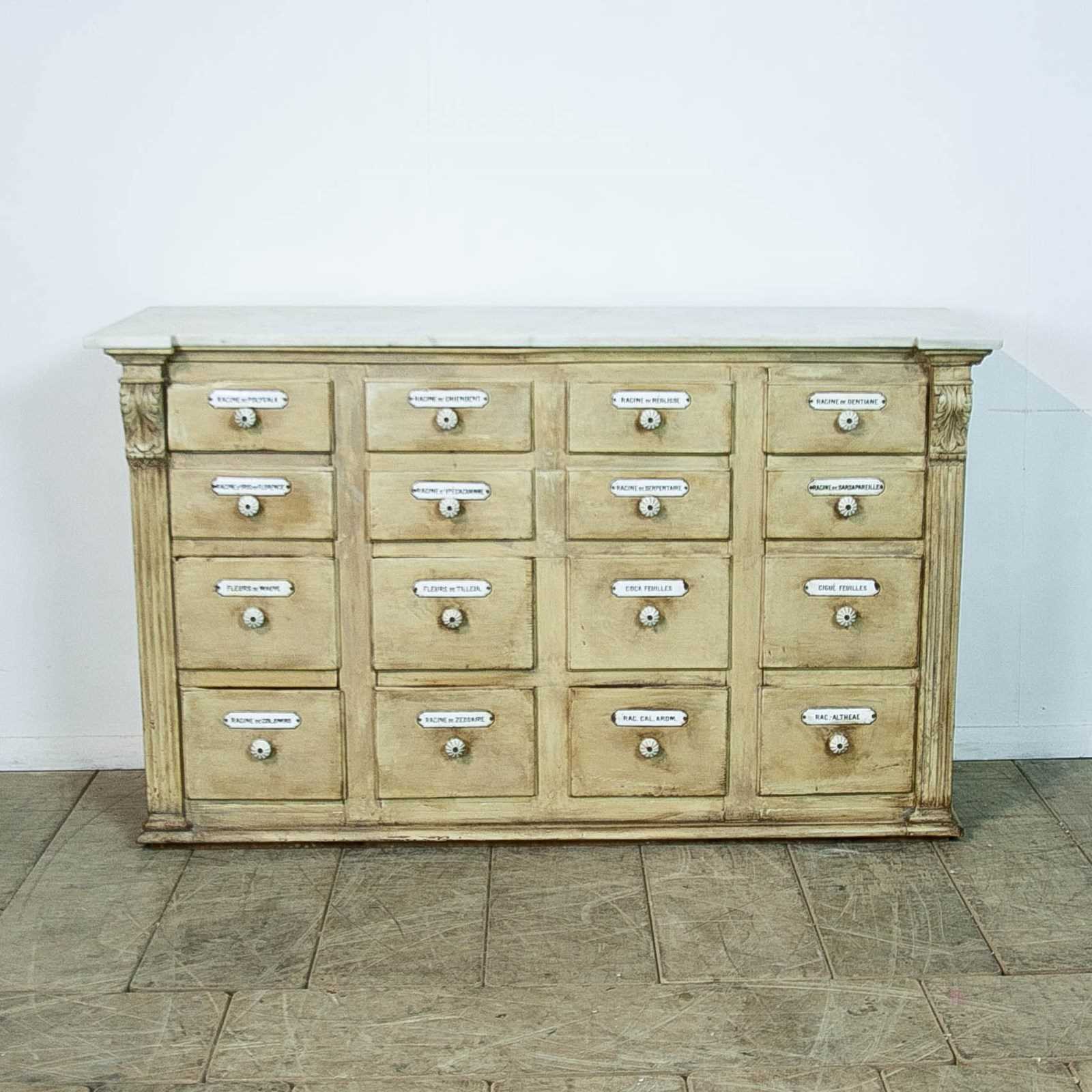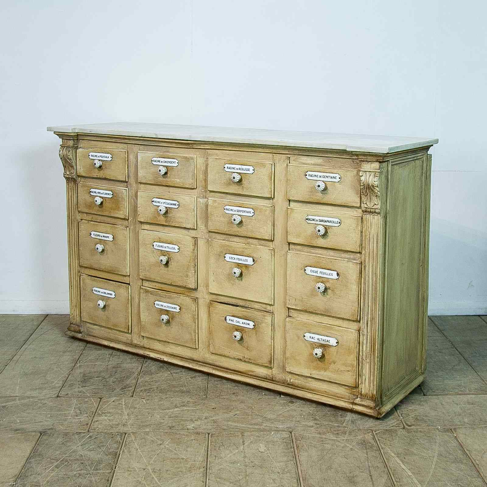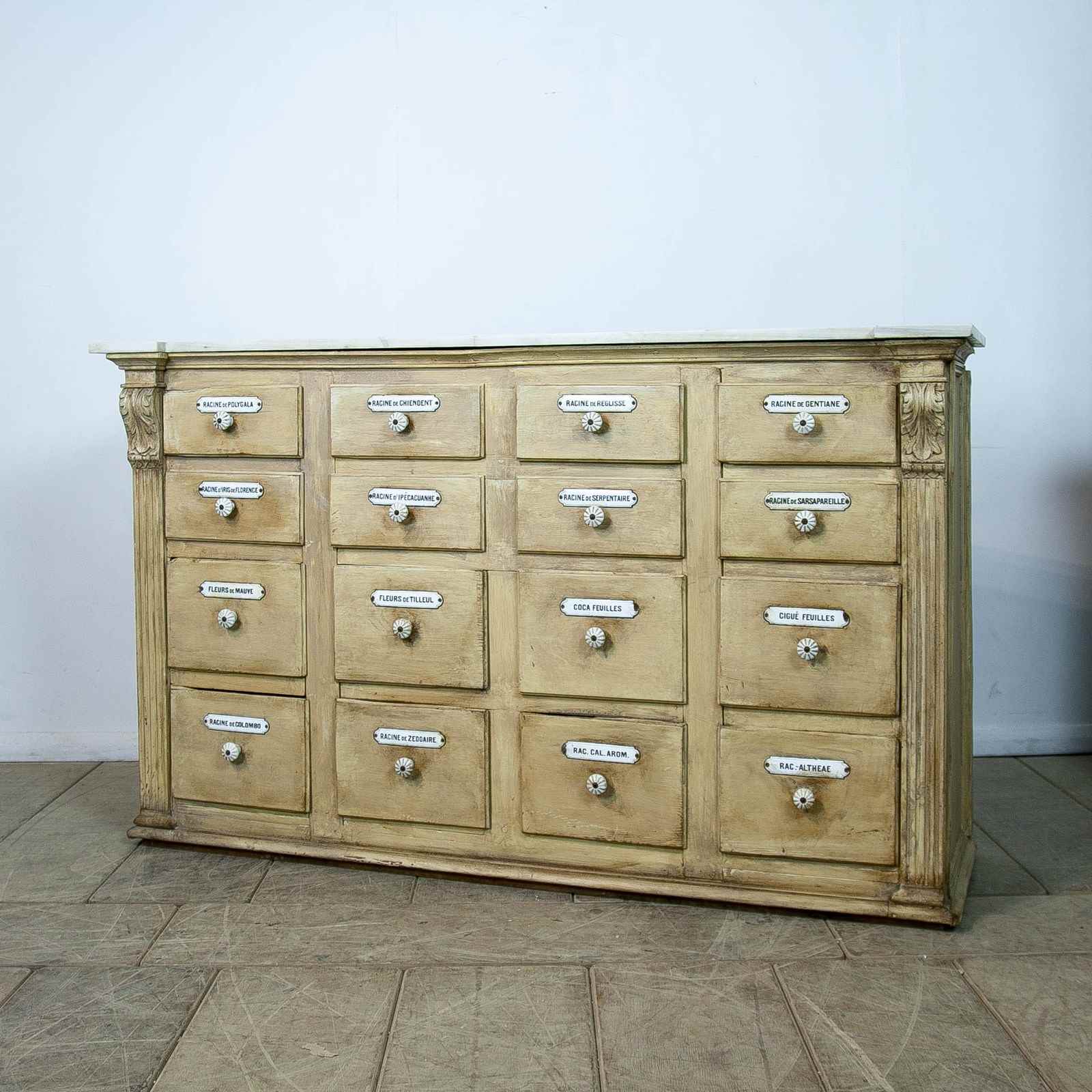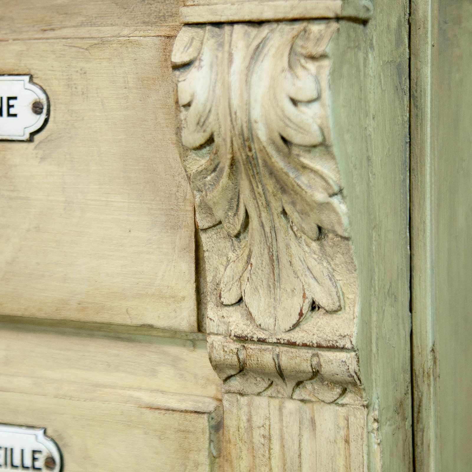 A fabulous, French, painted bank of drawers with enamel name plates and white porcelain knobs. Flanked by fluted columns topped by acanthus leaf capitals. Carrara marble top.