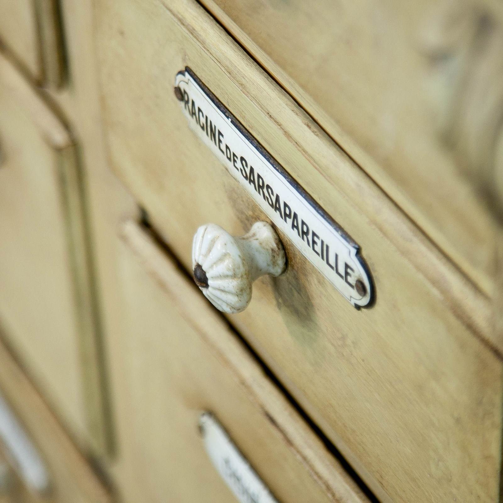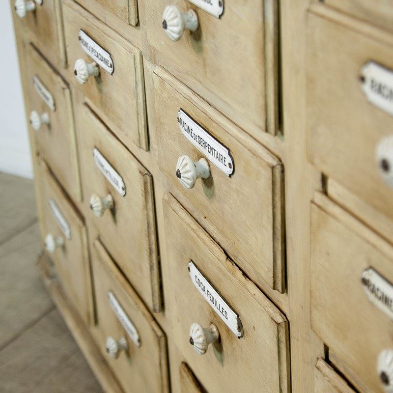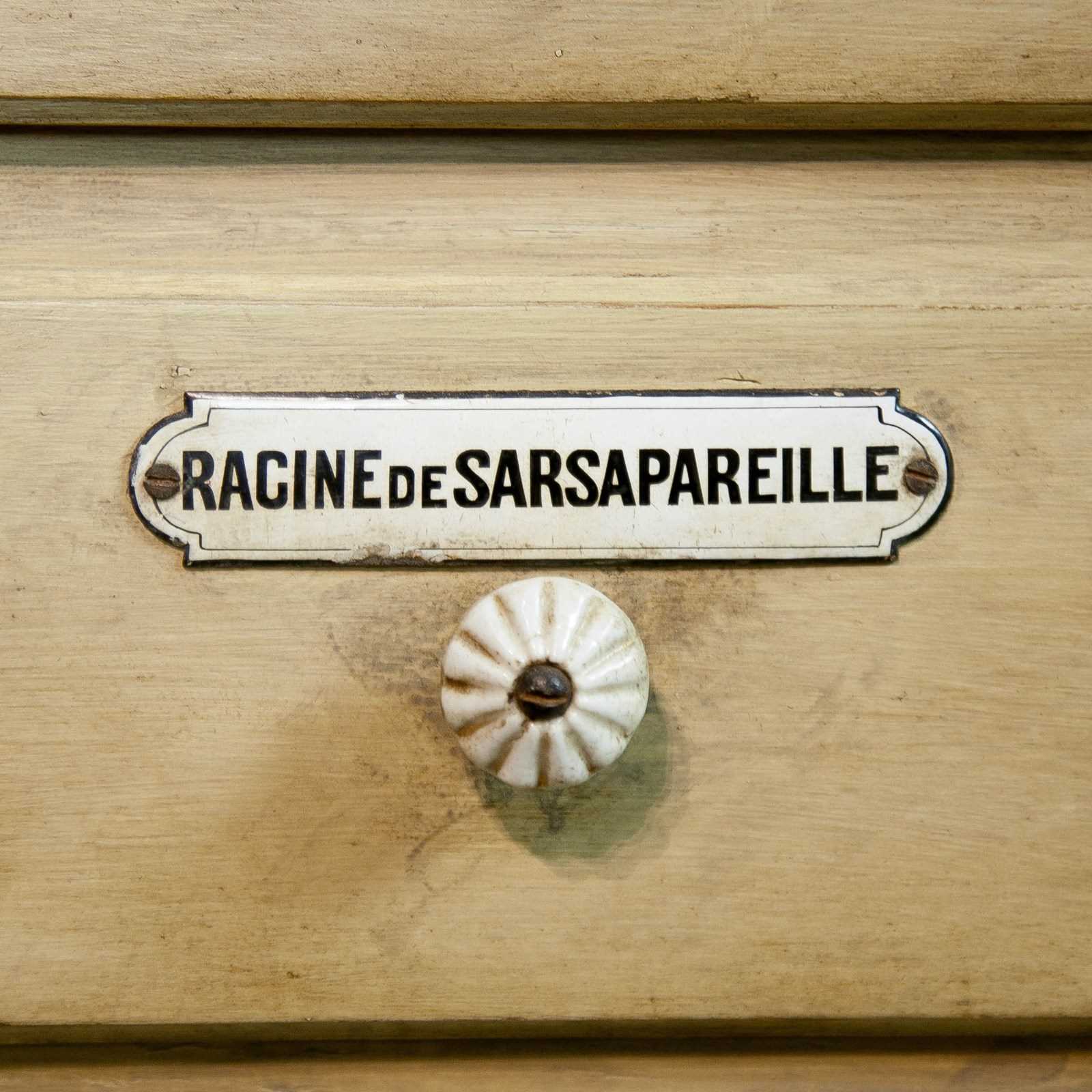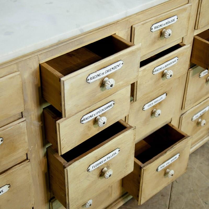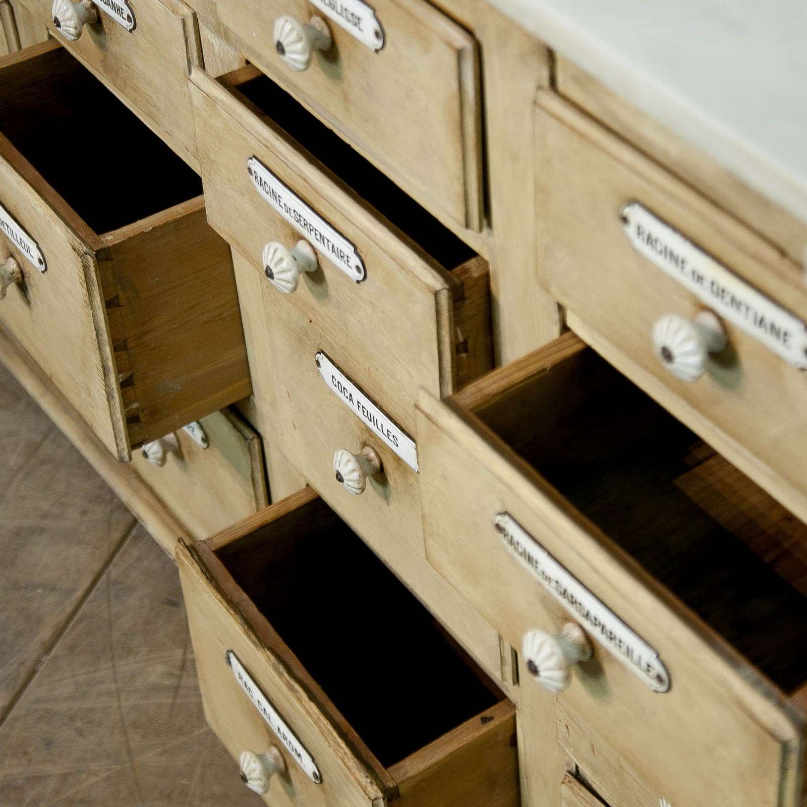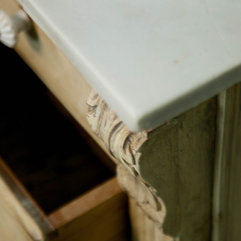 A fabulous, French, painted bank of drawers with enamel name plates and white porcelain knobs. Flanked by fluted columns topped by acanthus leaf capitals. Carrara marble top.