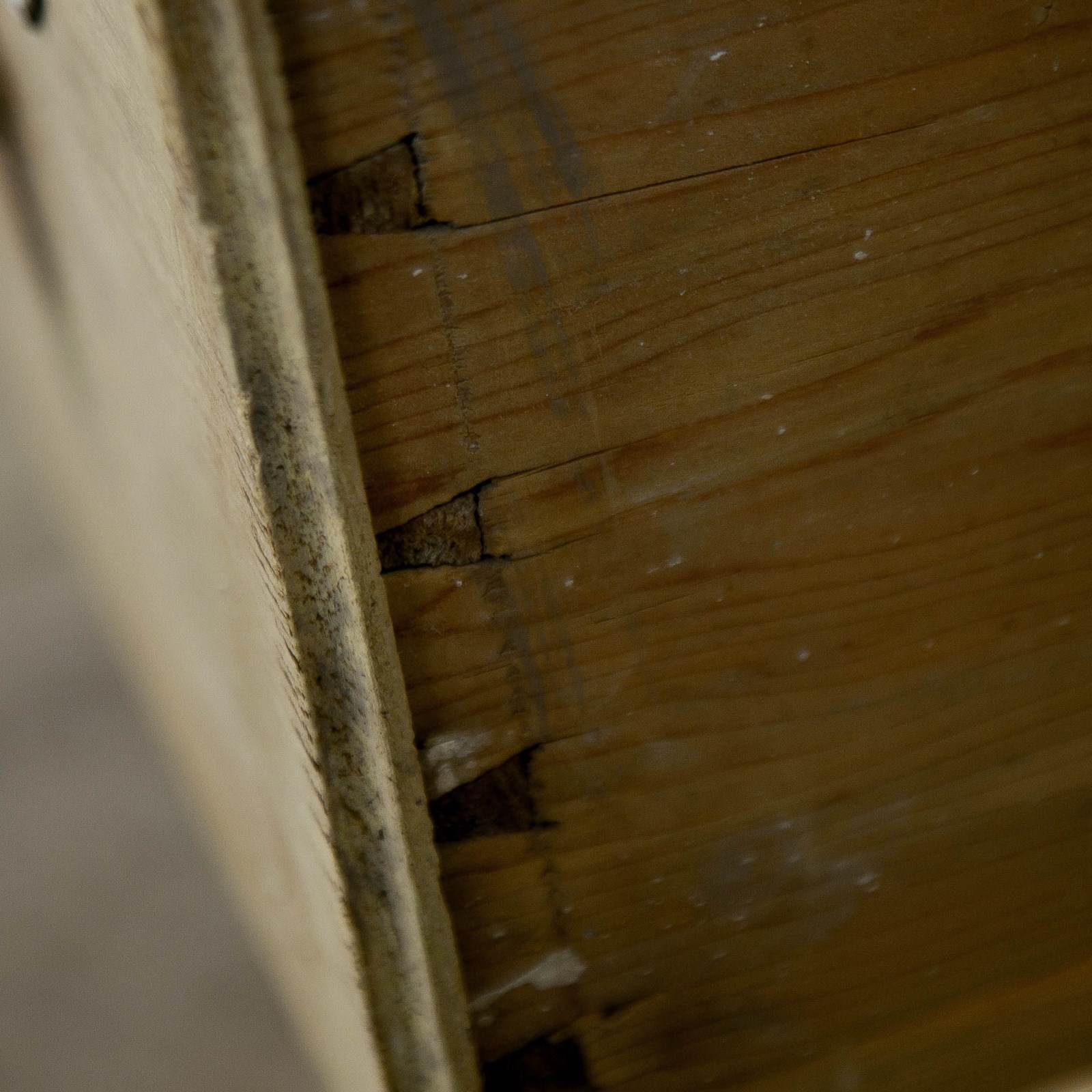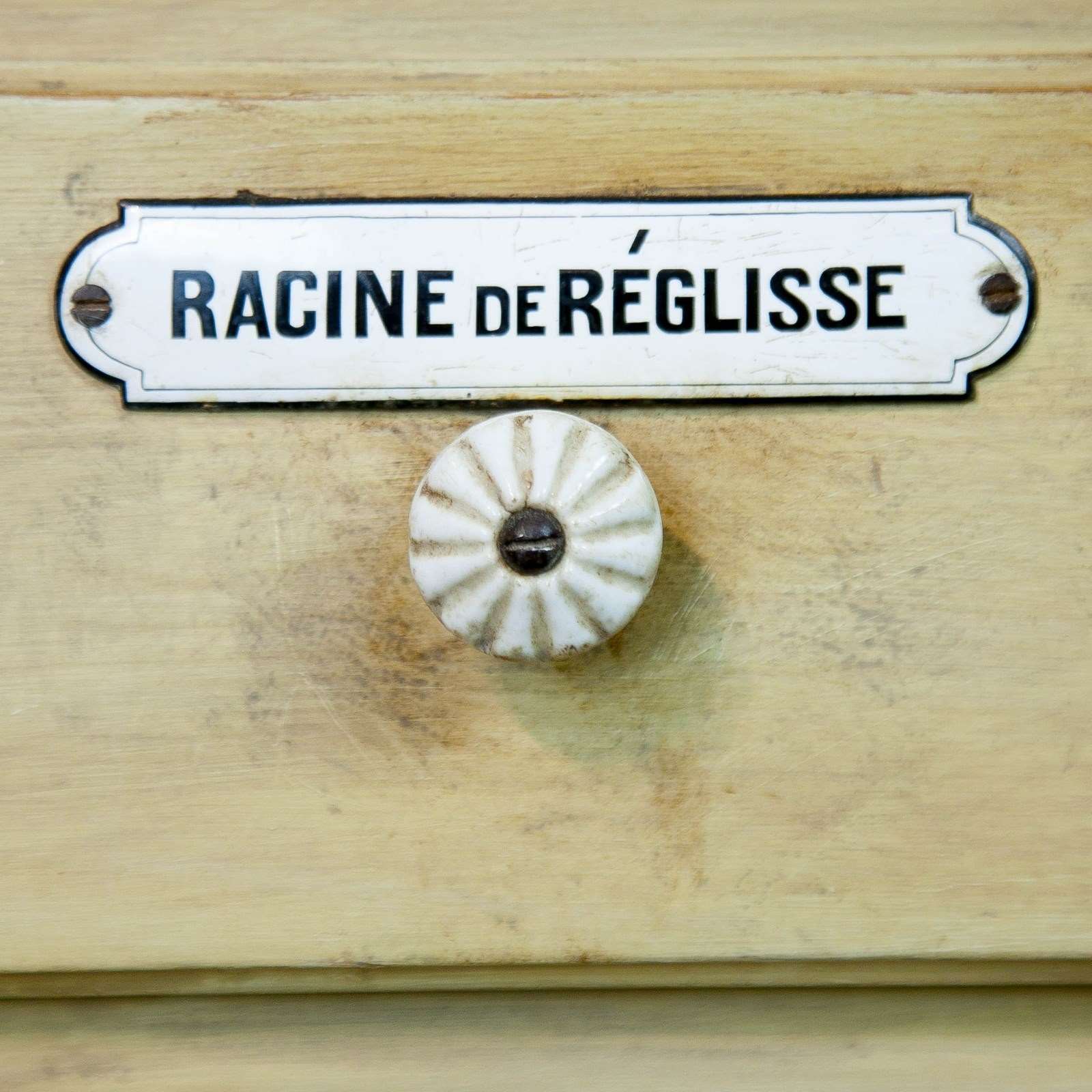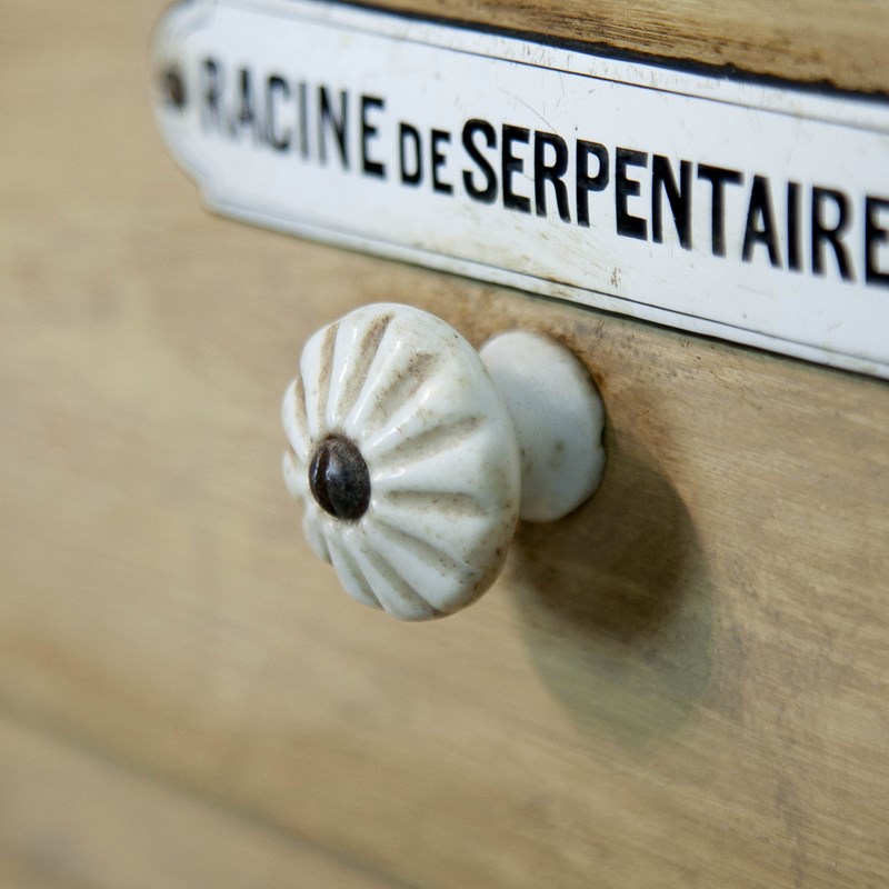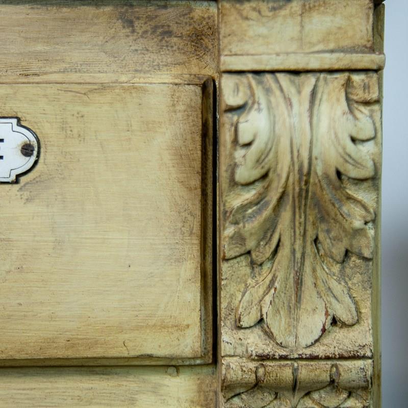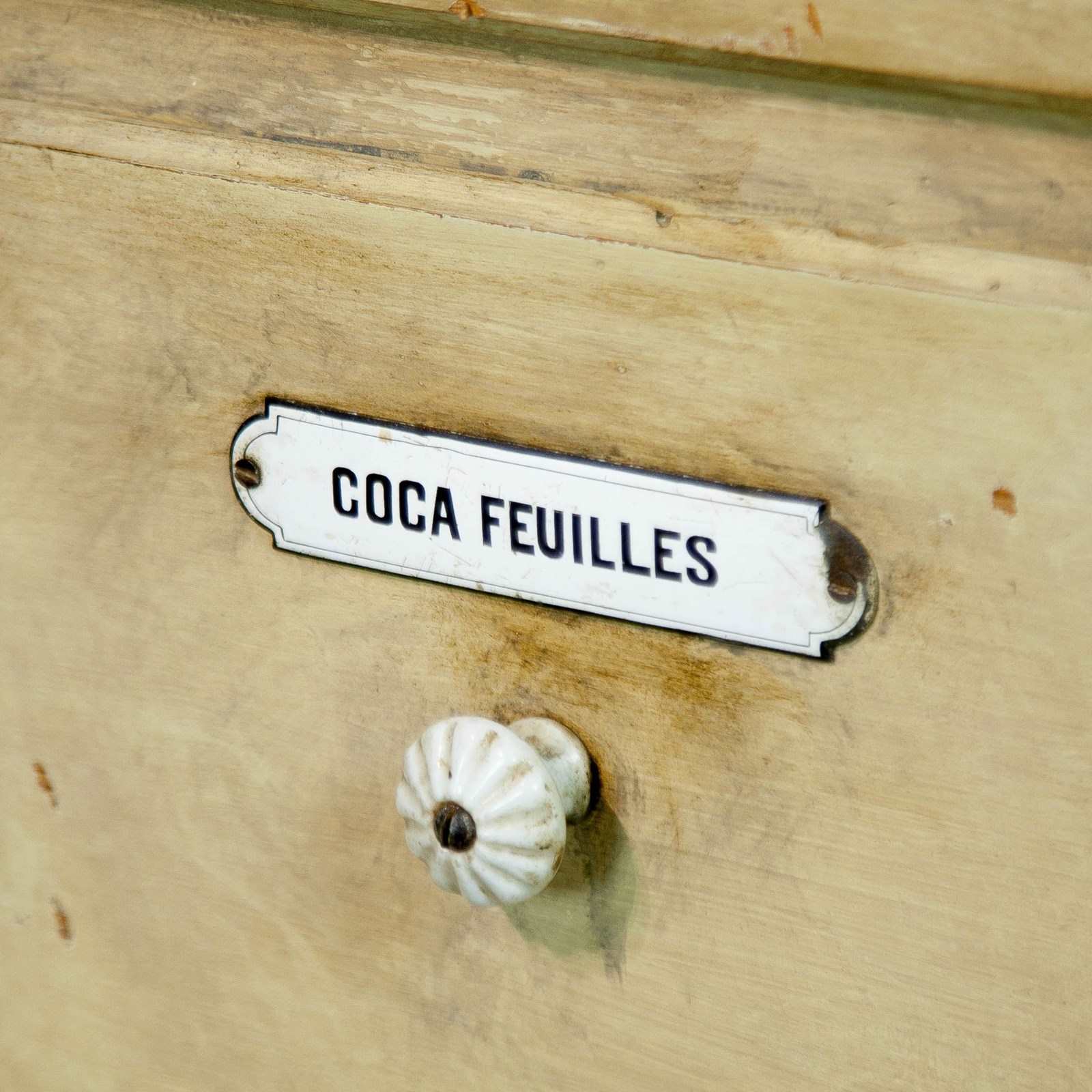 A fabulous, French, painted bank of drawers with enamel name plates and white porcelain knobs. Flanked by fluted columns topped by acanthus leaf capitals. Carrara marble top.