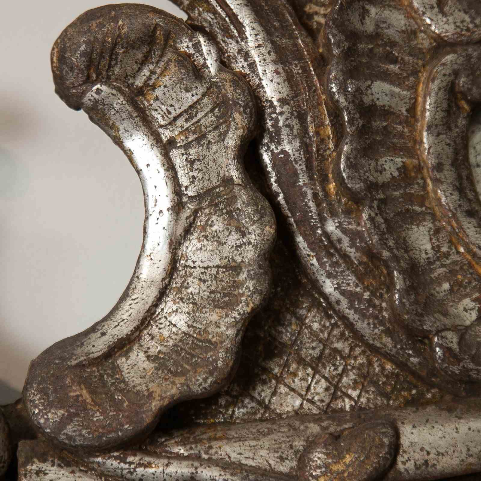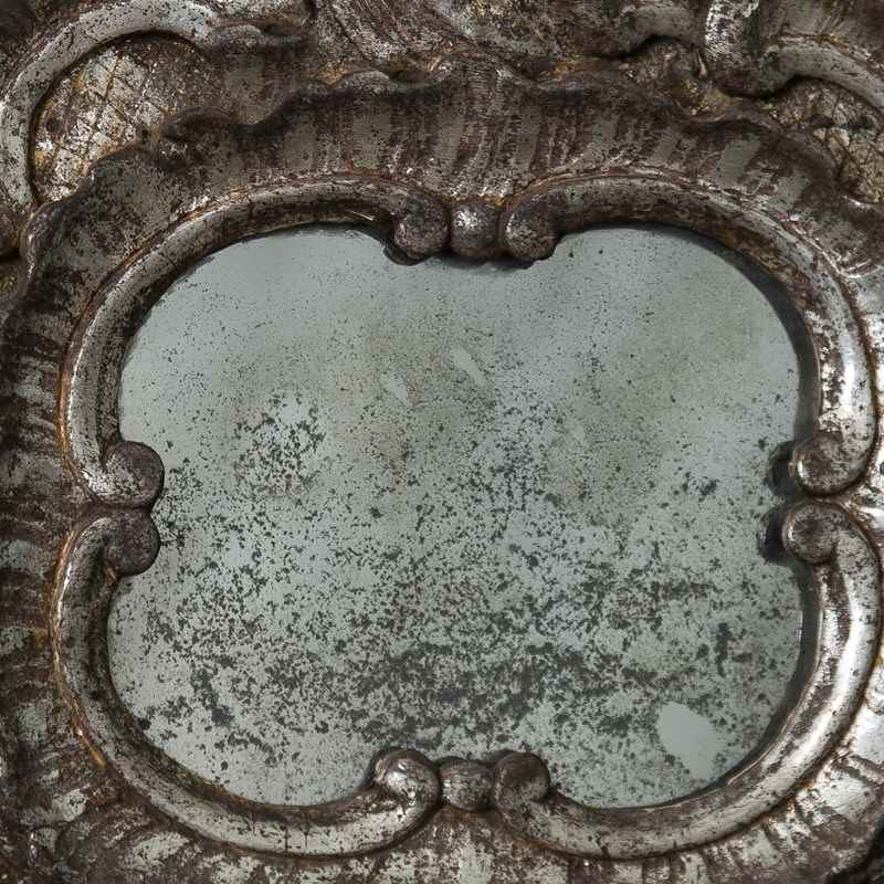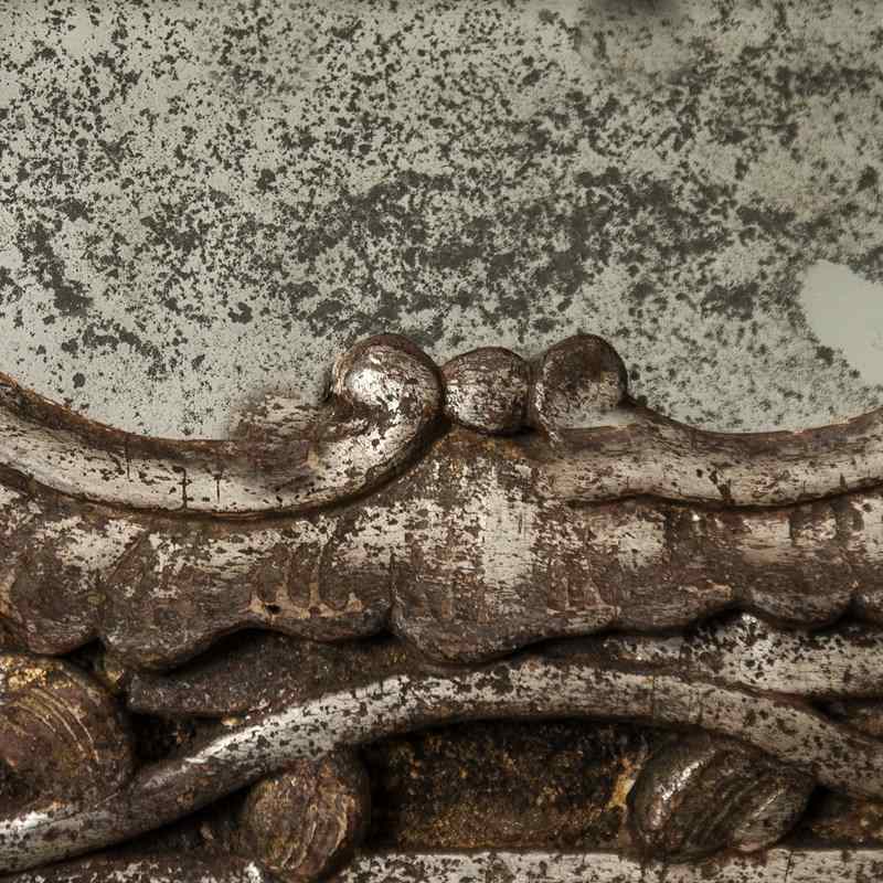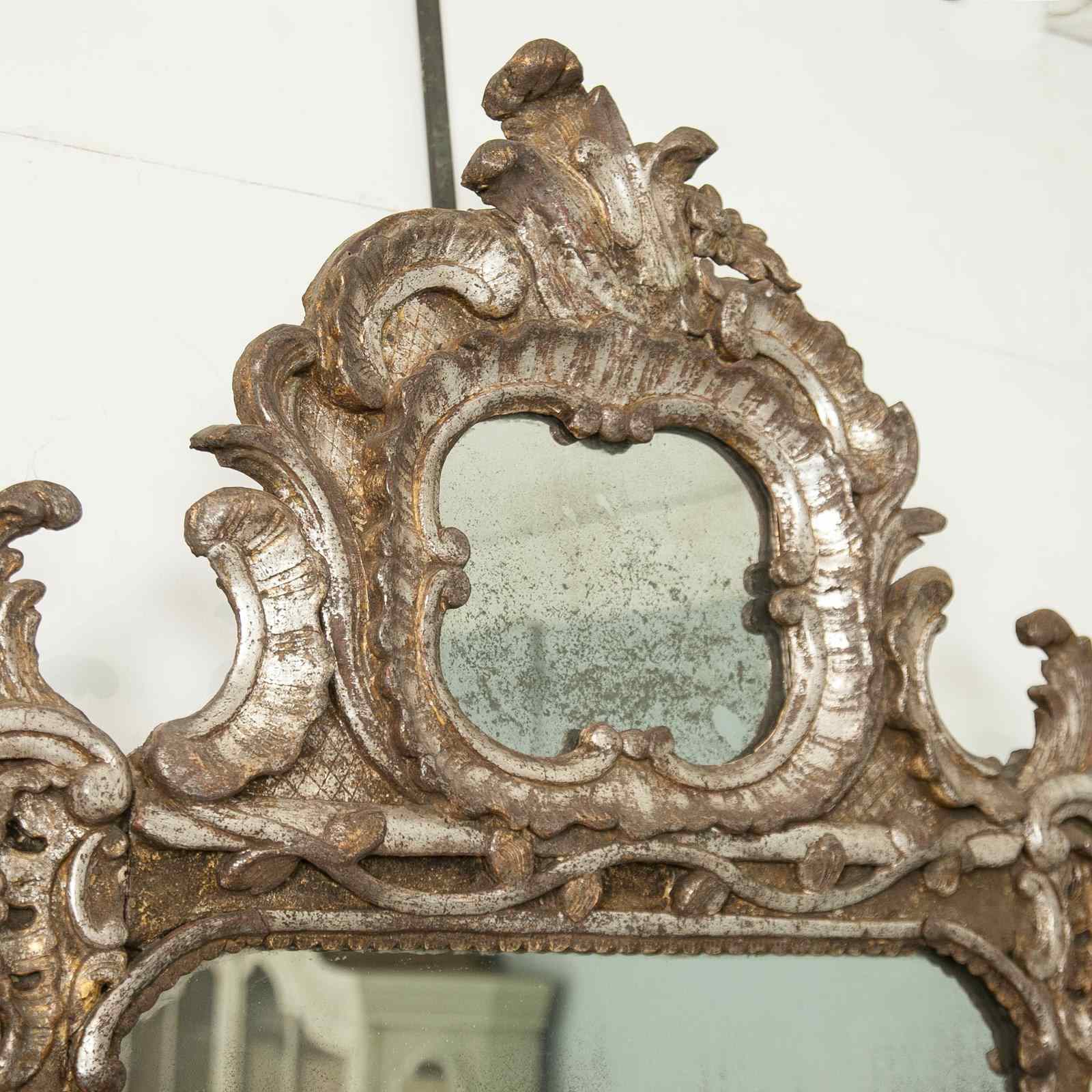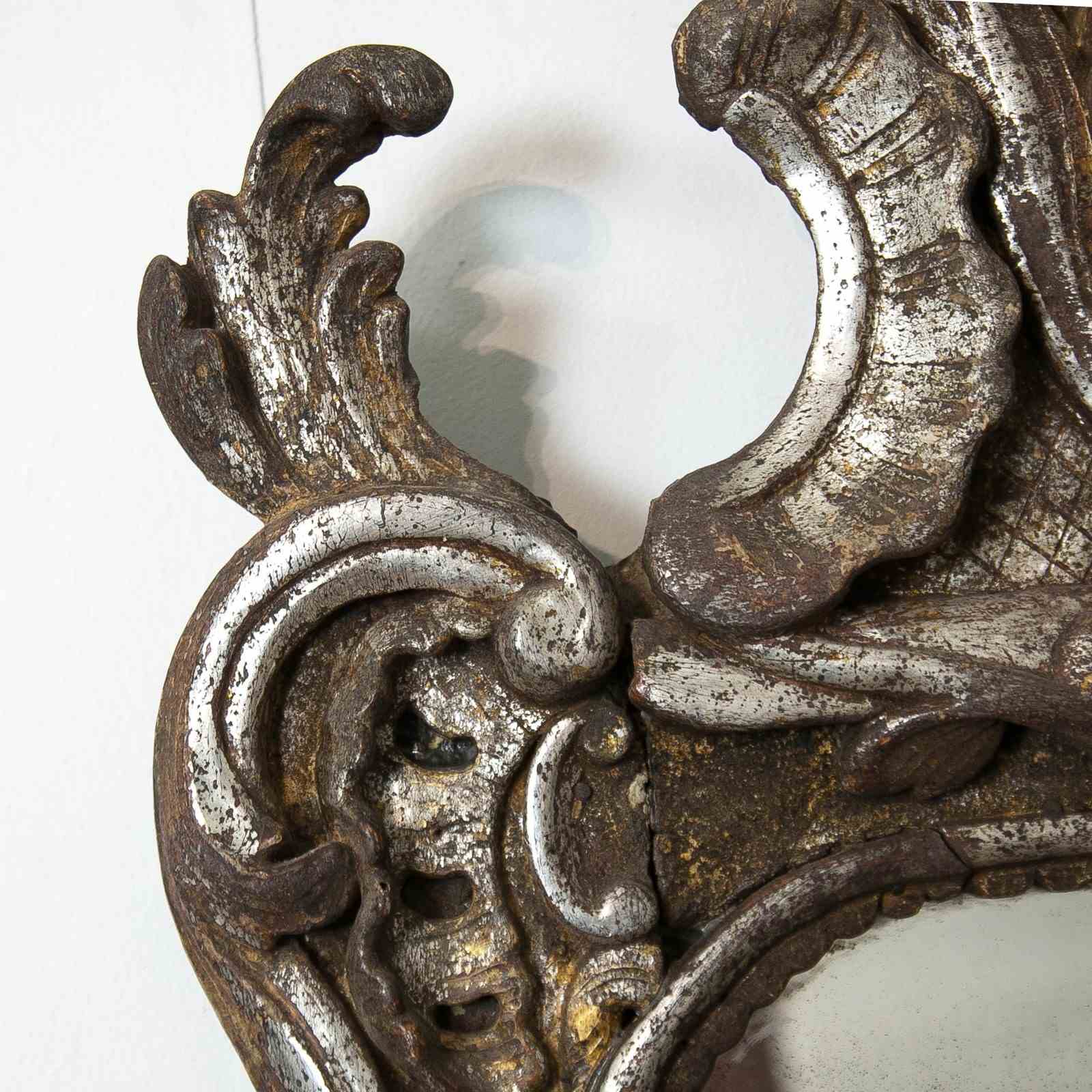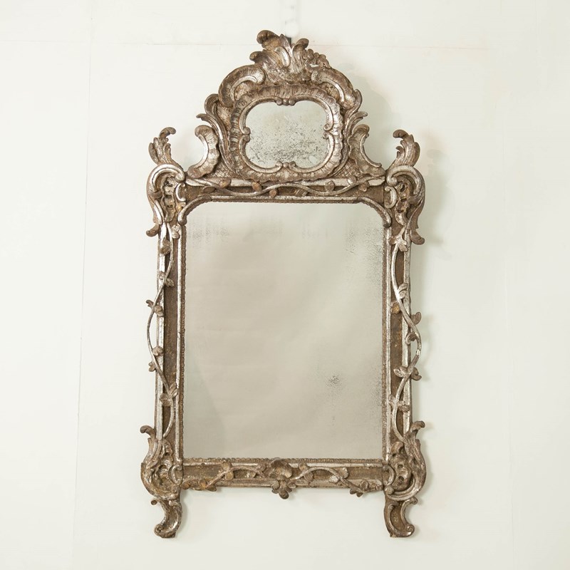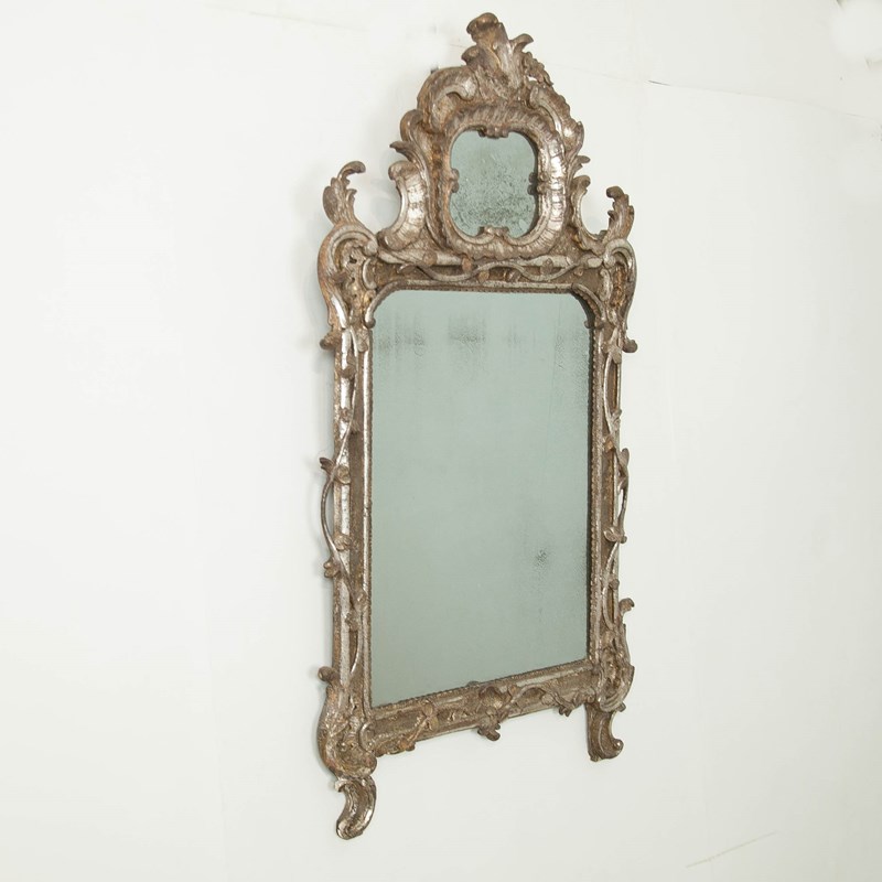 A 18th century French, Rococco mirror. Retaining it's original silverleaf finish, mercury mirror plates and backing boards. Expertly realised with carved foliate and scrolls framing 2 mirror plates.