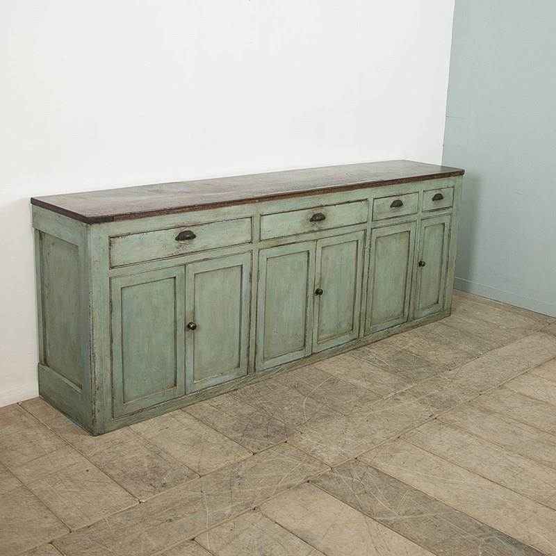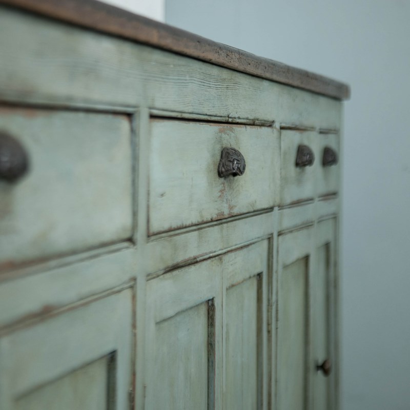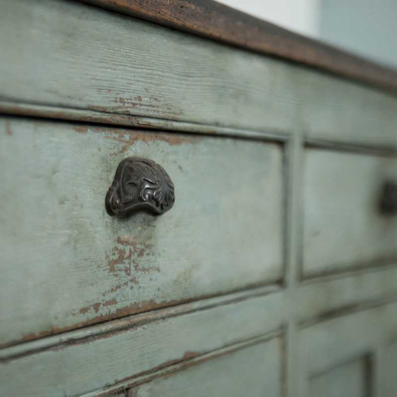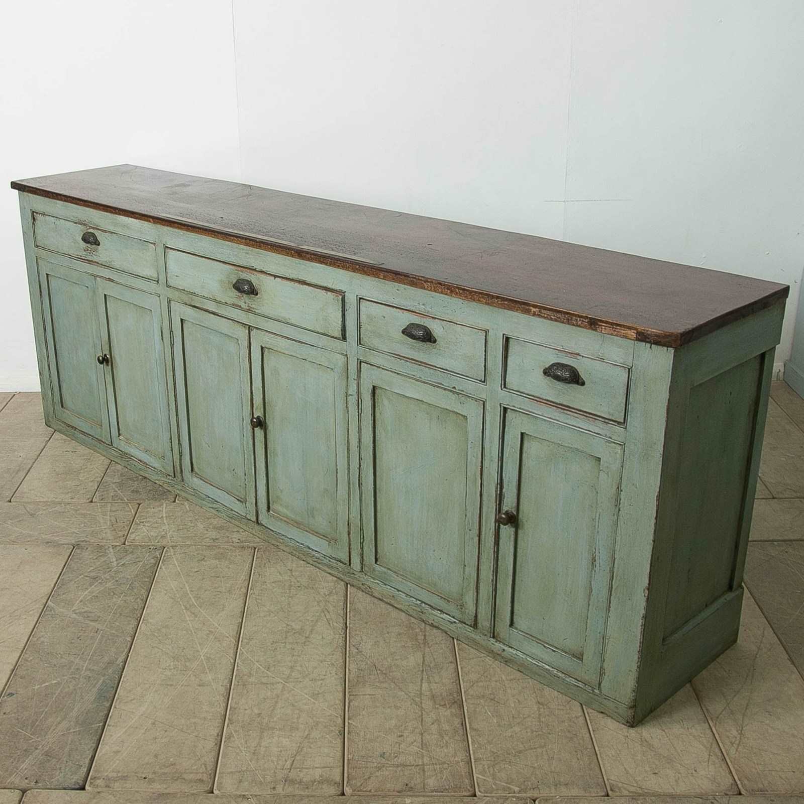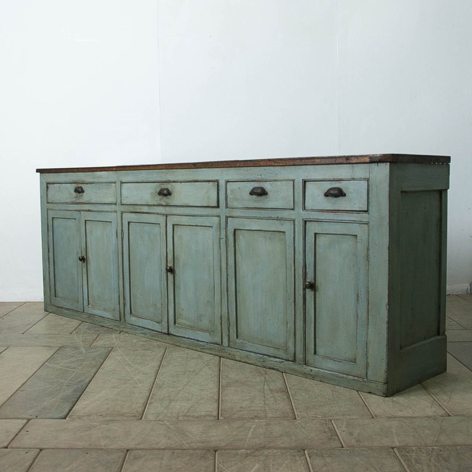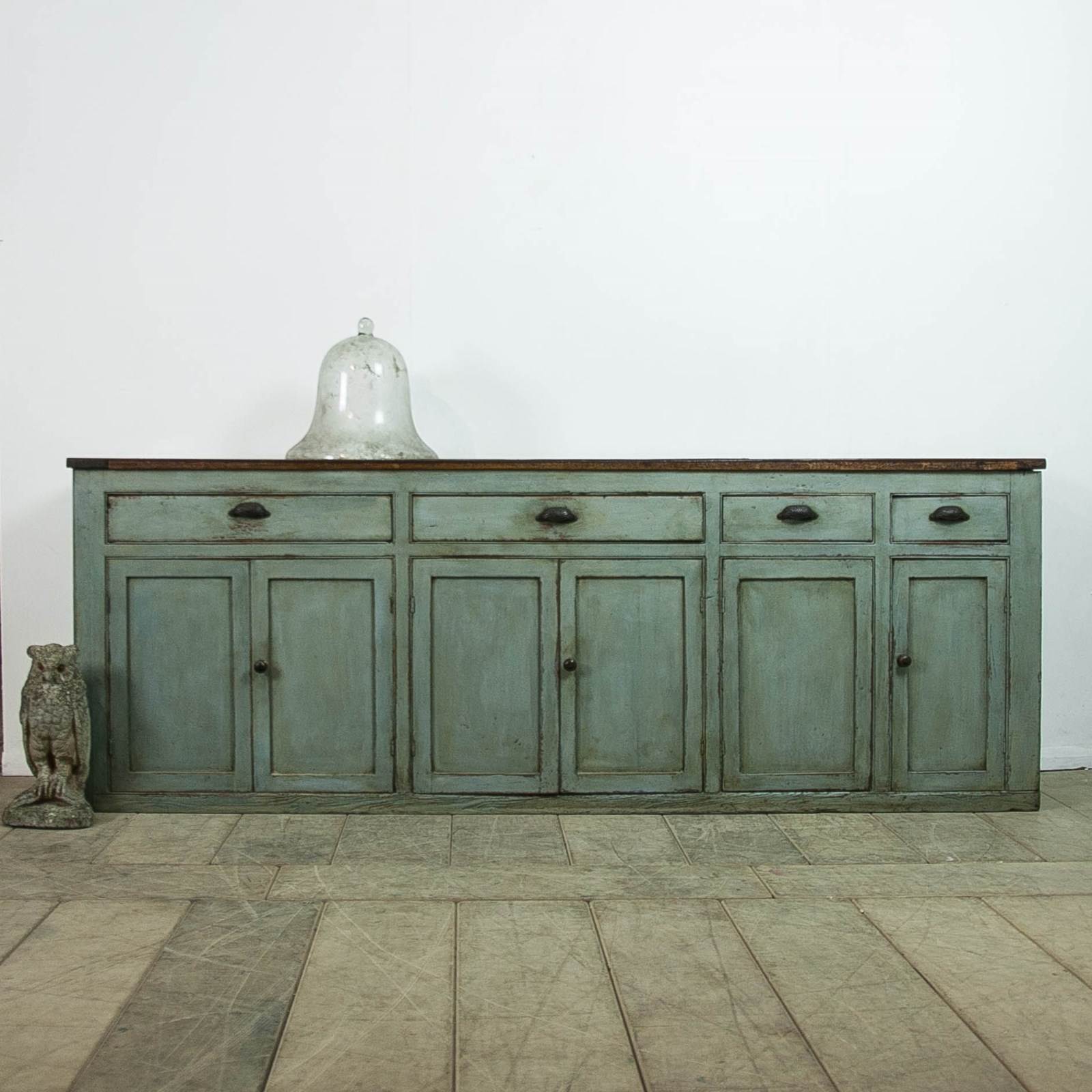 A 19th c, pine, shop dresser base with a mahogany top, removed from a wool shop nr. Taunton in Somerset. Compising a run of 3 pairs of cupboard doors with a single, fixed internal shelf below 4 drawers of various sizes. The top is Mahogany with a brass measuring rule.