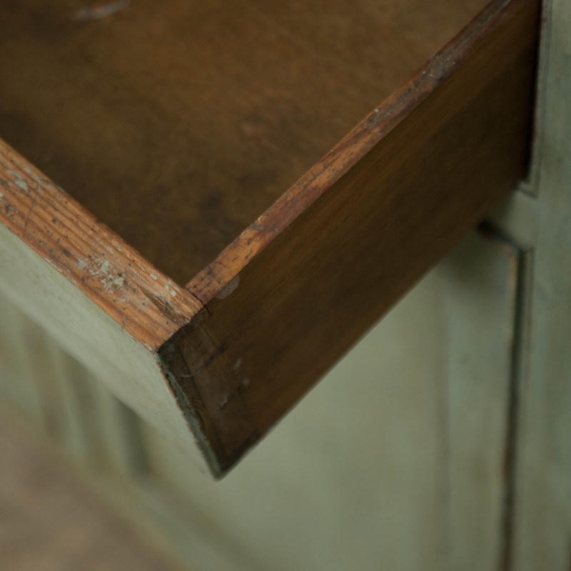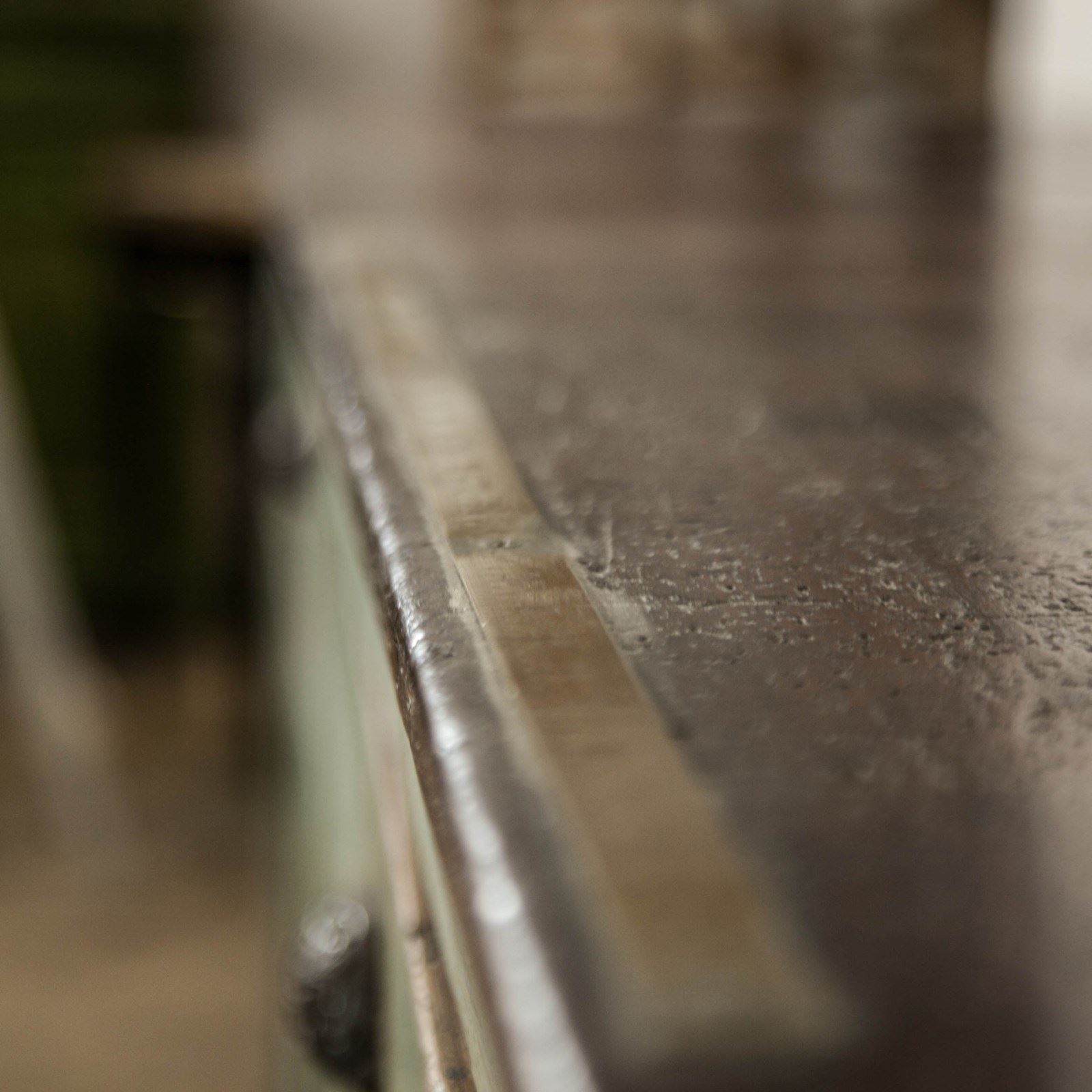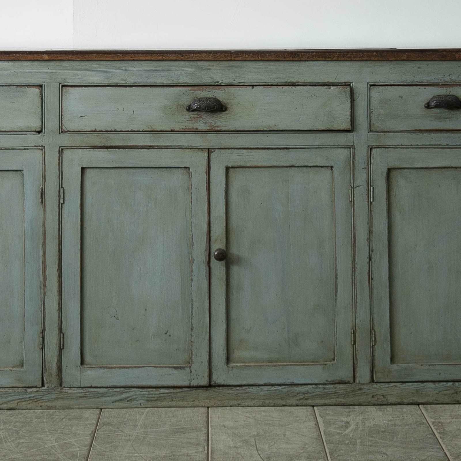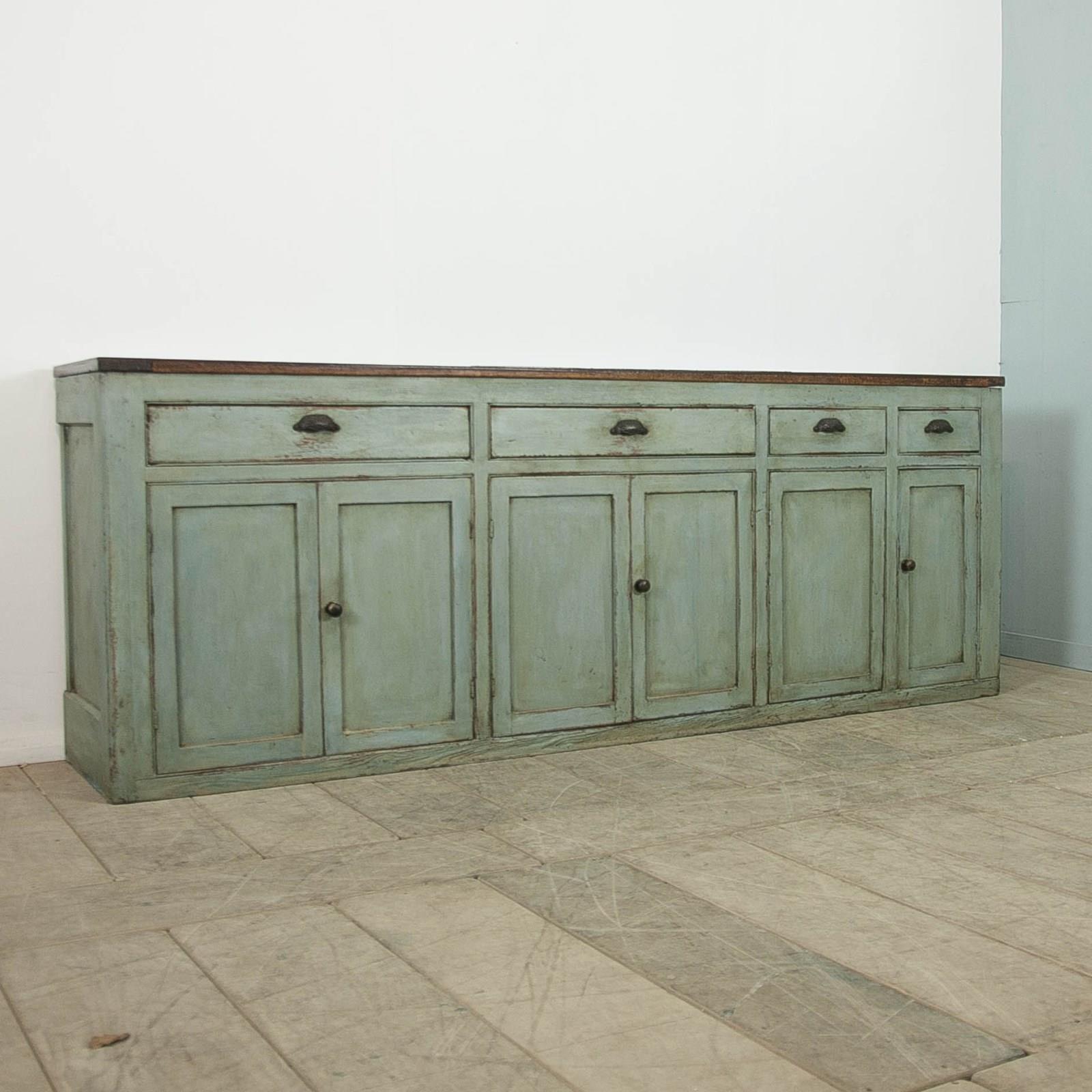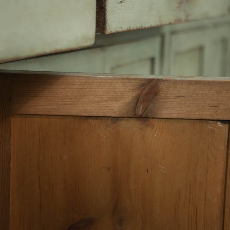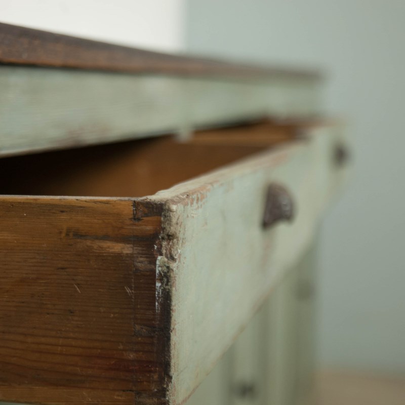 A 19th c, pine, shop dresser base with a mahogany top, removed from a wool shop nr. Taunton in Somerset. Compising a run of 3 pairs of cupboard doors with a single, fixed internal shelf below 4 drawers of various sizes. The top is Mahogany with a brass measuring rule.