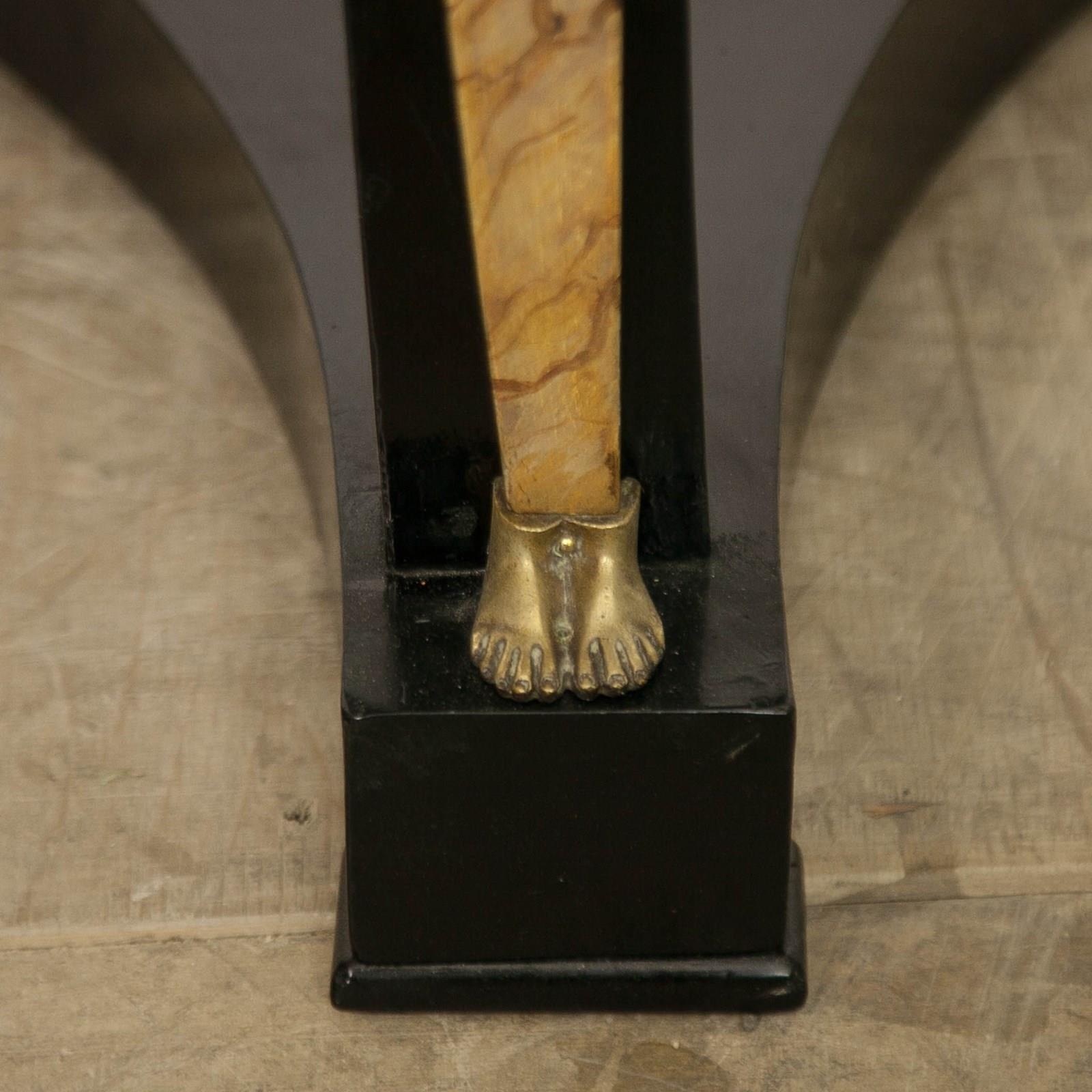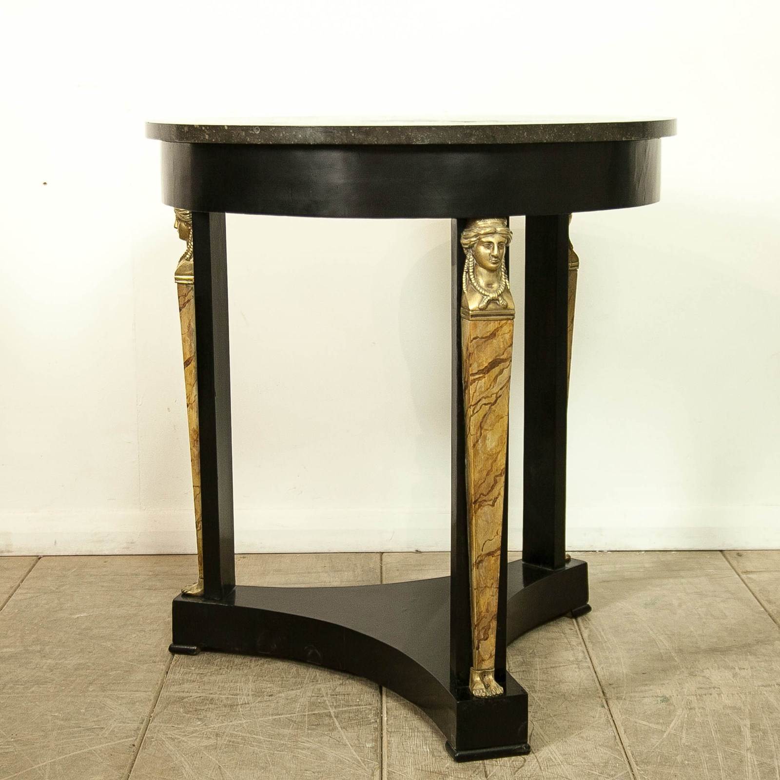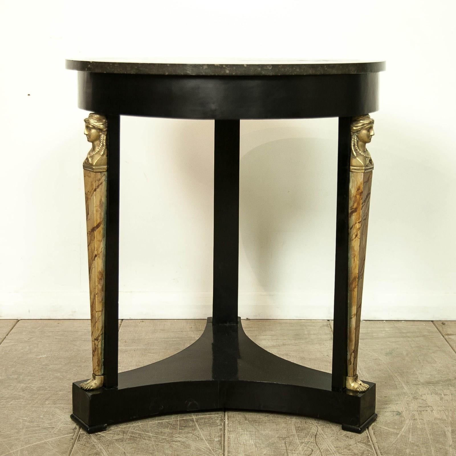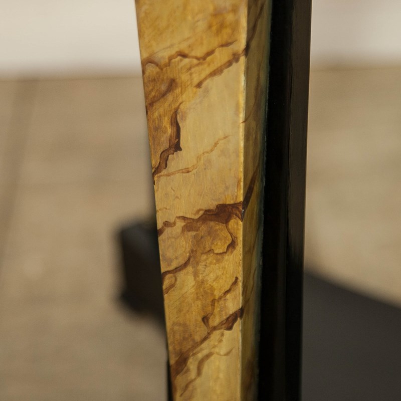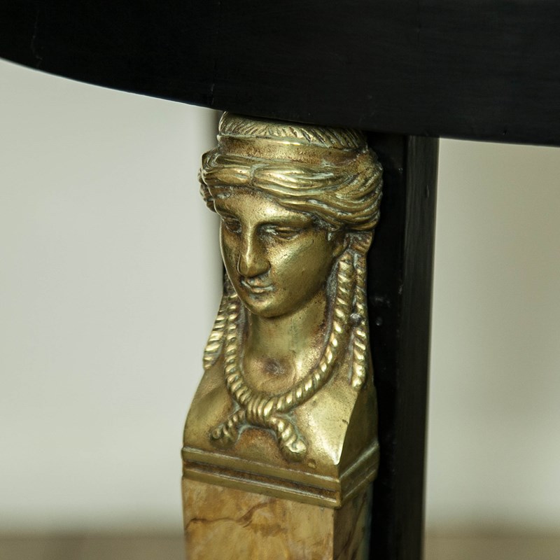 A very elegant 19thc, French, Ebonised Empire Gueridon. With bronze mounts, faux Siena marble columns and a speckled, grey marble top.