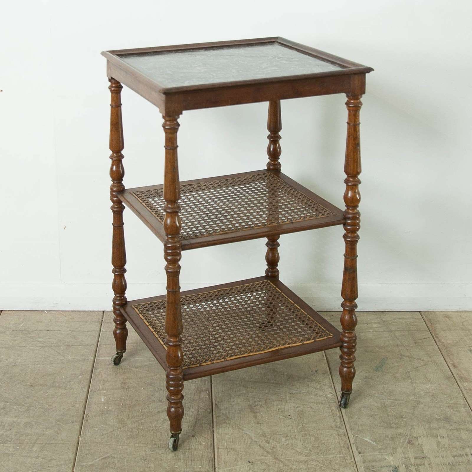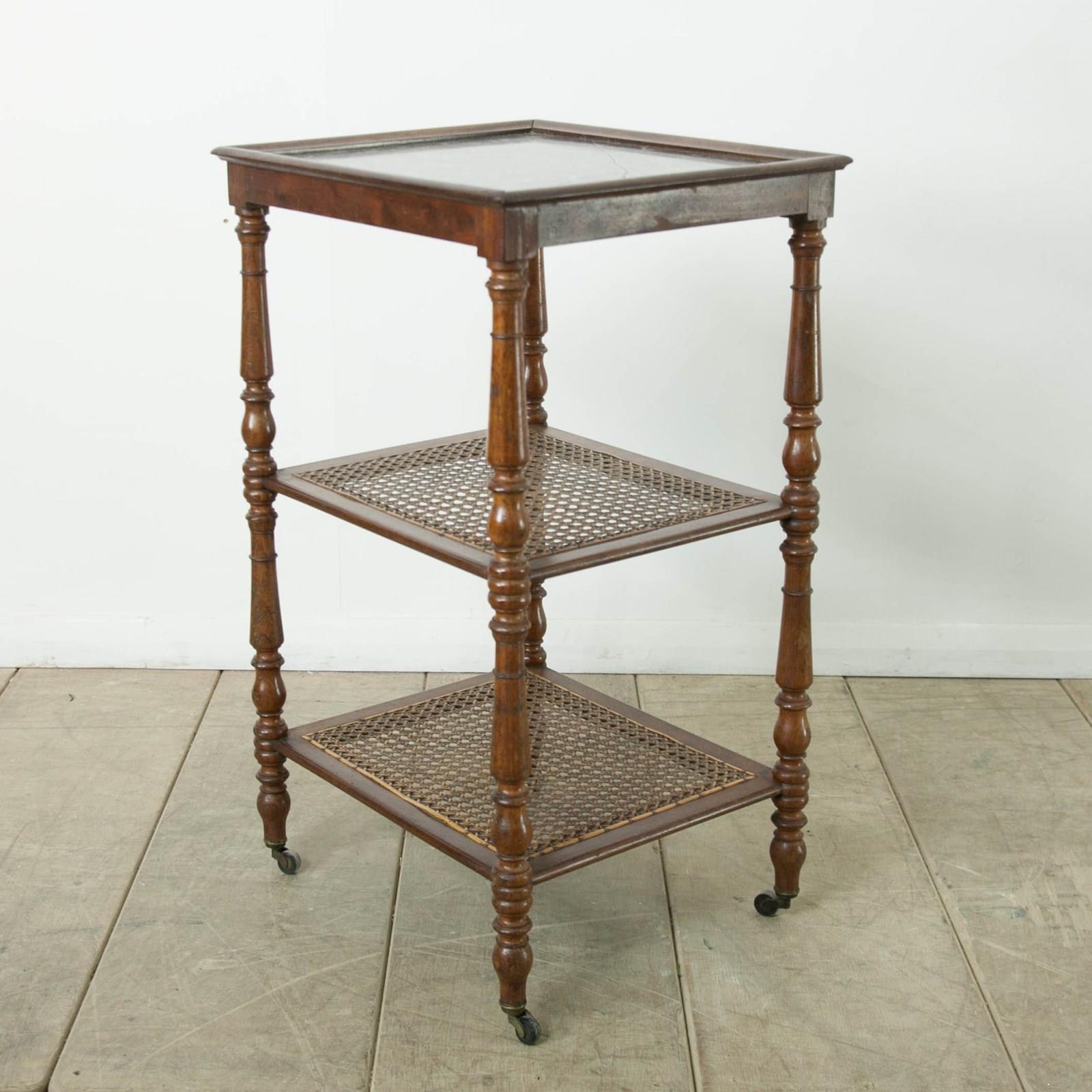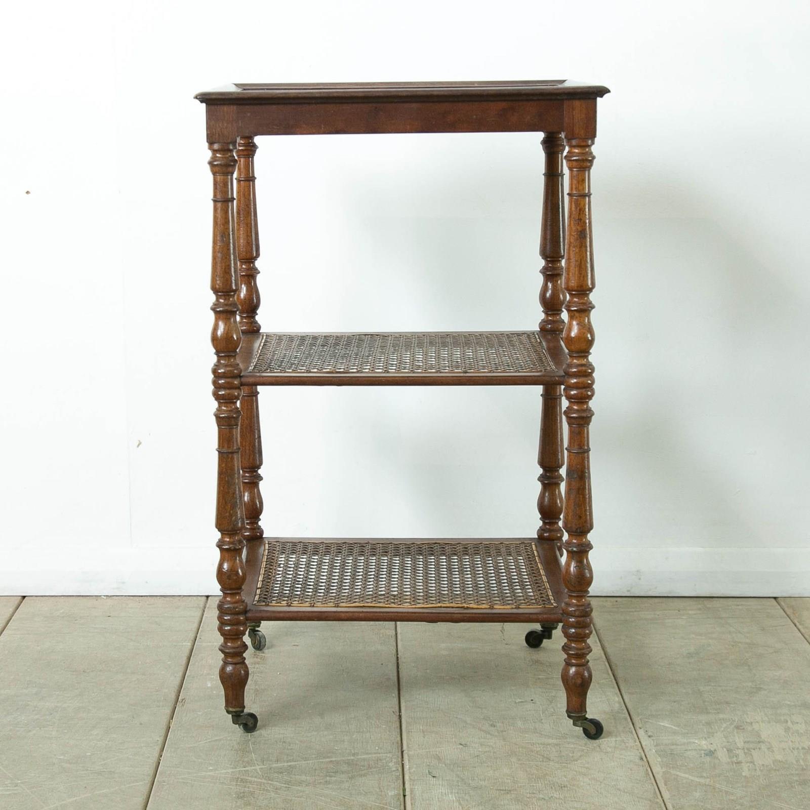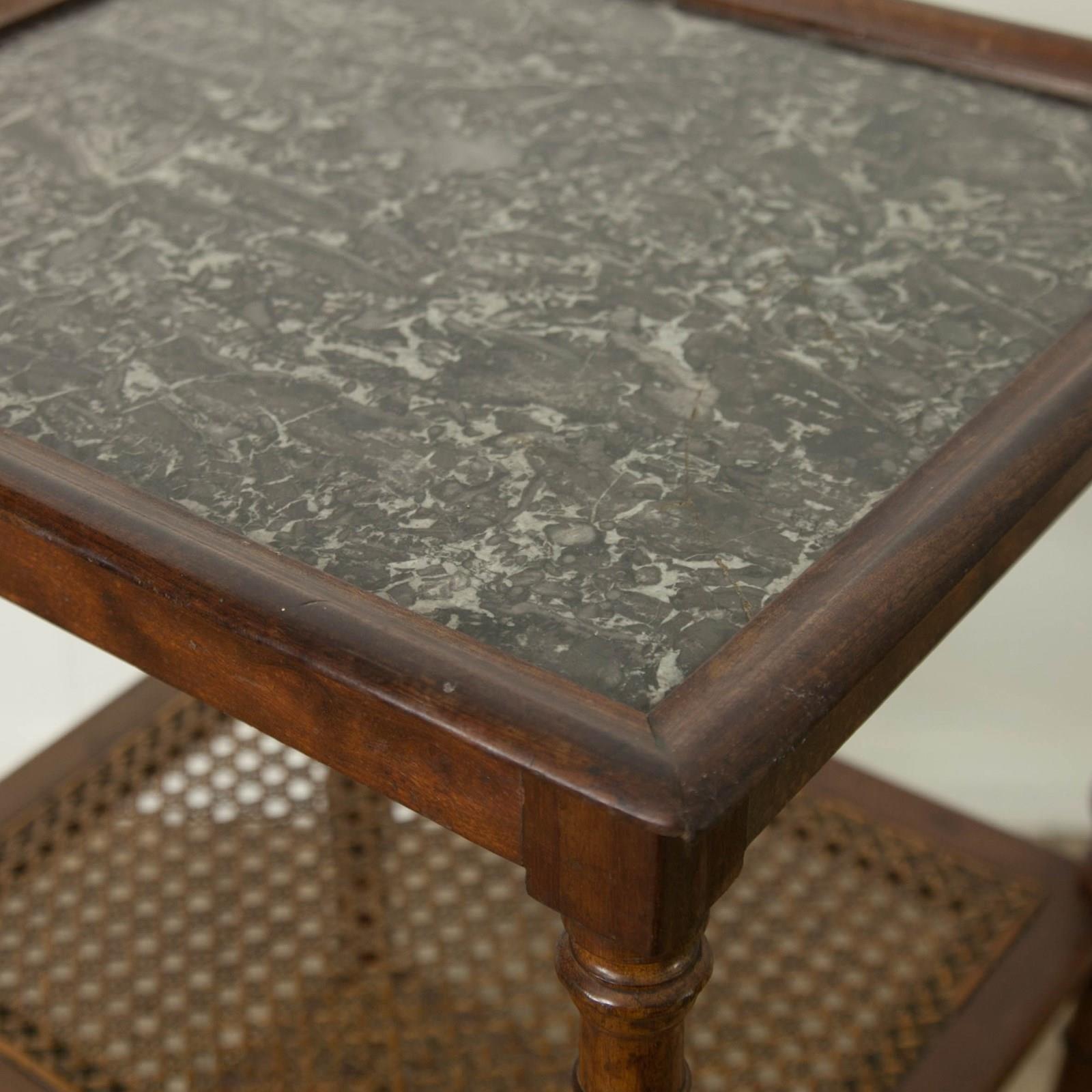 An elegant French, walnut, Etagere with 2 cane-work shelves and a grey marble top. Raised on decoratively turned legs with brass castors.