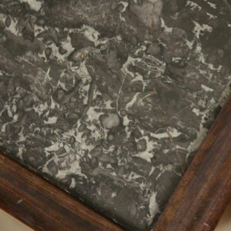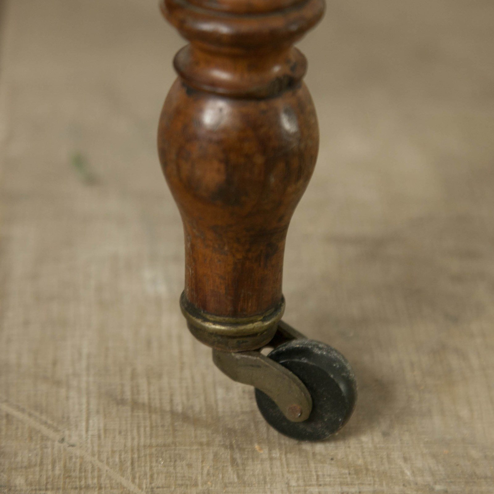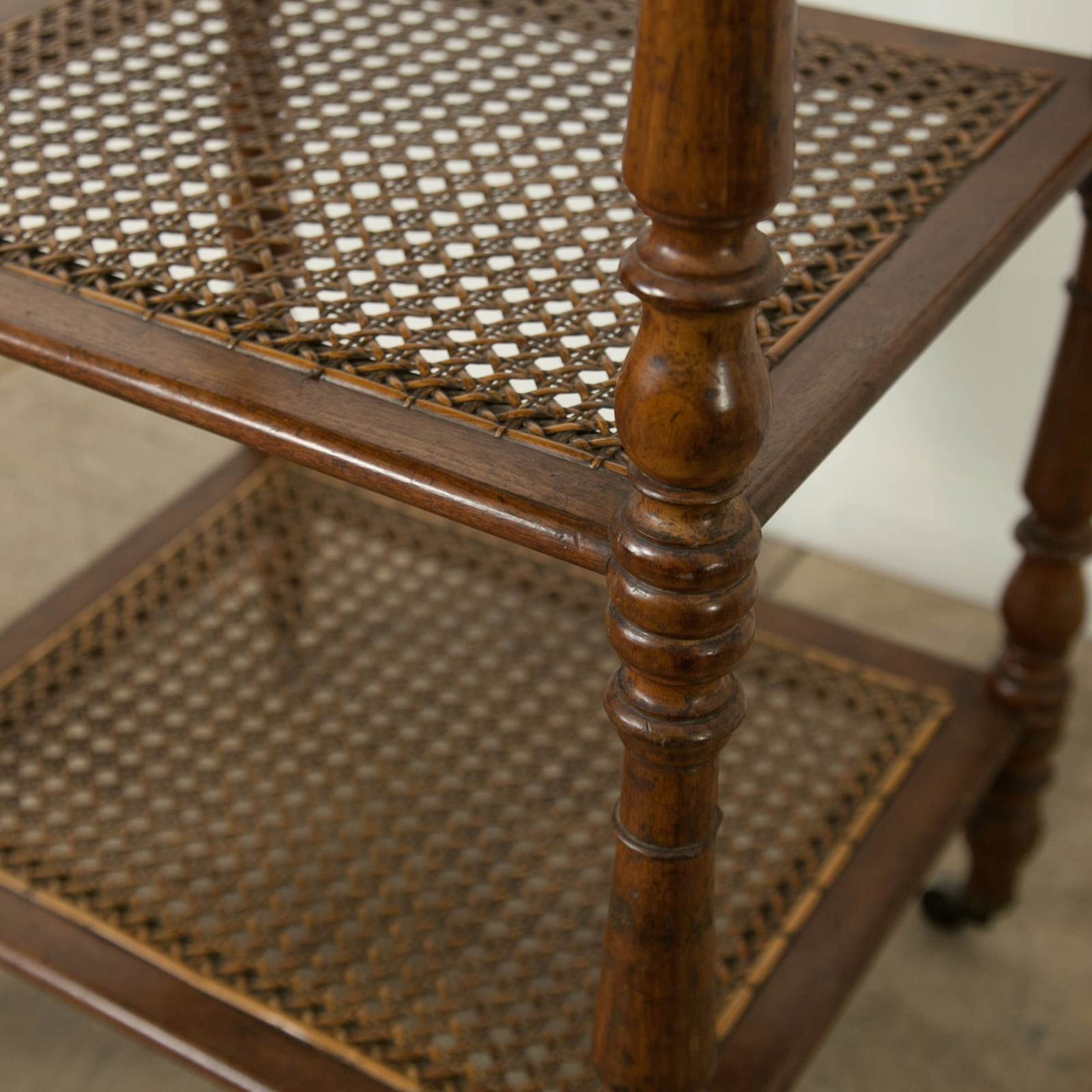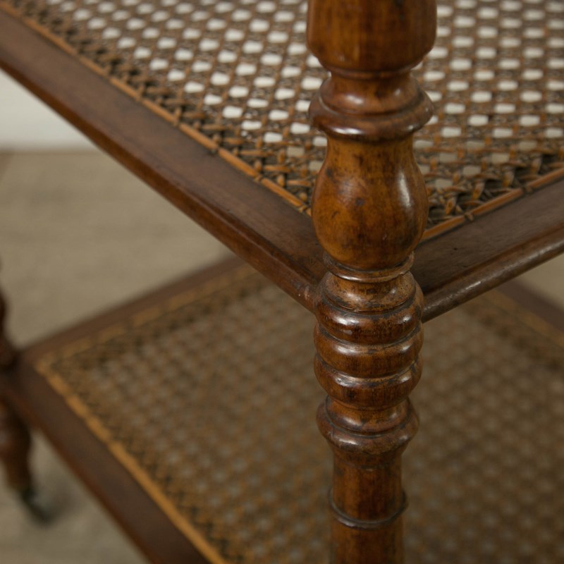 An elegant French, walnut, Etagere with 2 cane-work shelves and a grey marble top. Raised on decoratively turned legs with brass castors.