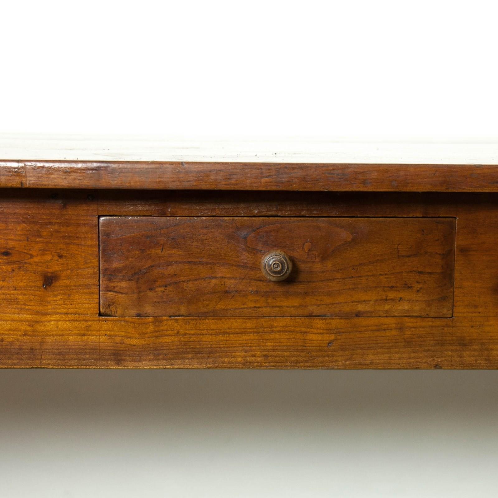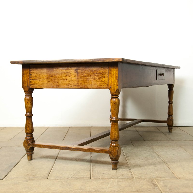 A very fine French, Elm, farmhouse table with a fantastic time worn patina. Raised on turned legs and stretcher a central cutlery drawer, a large end drawer and a bread slide.