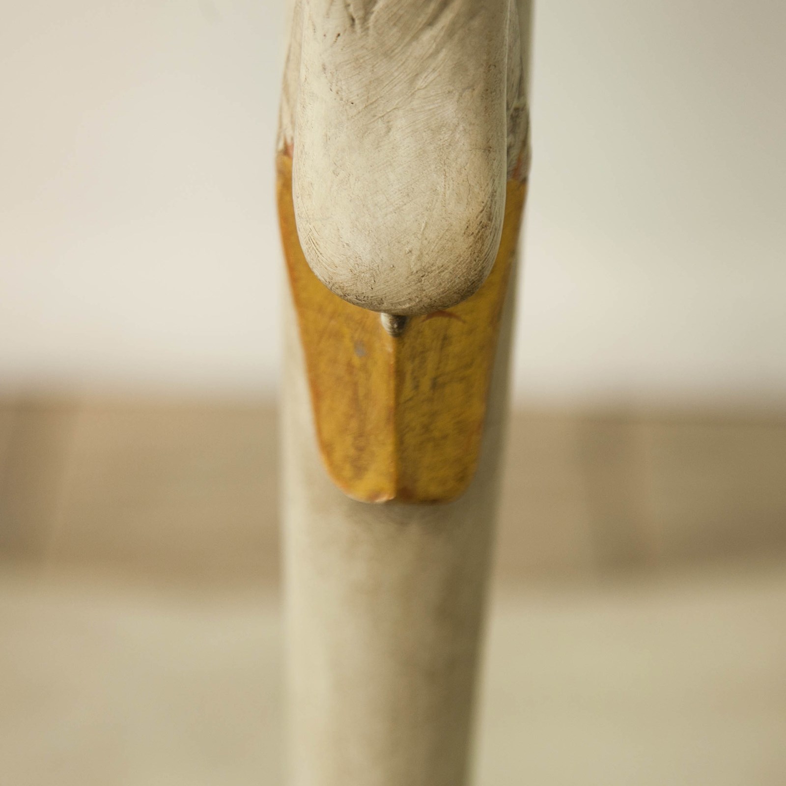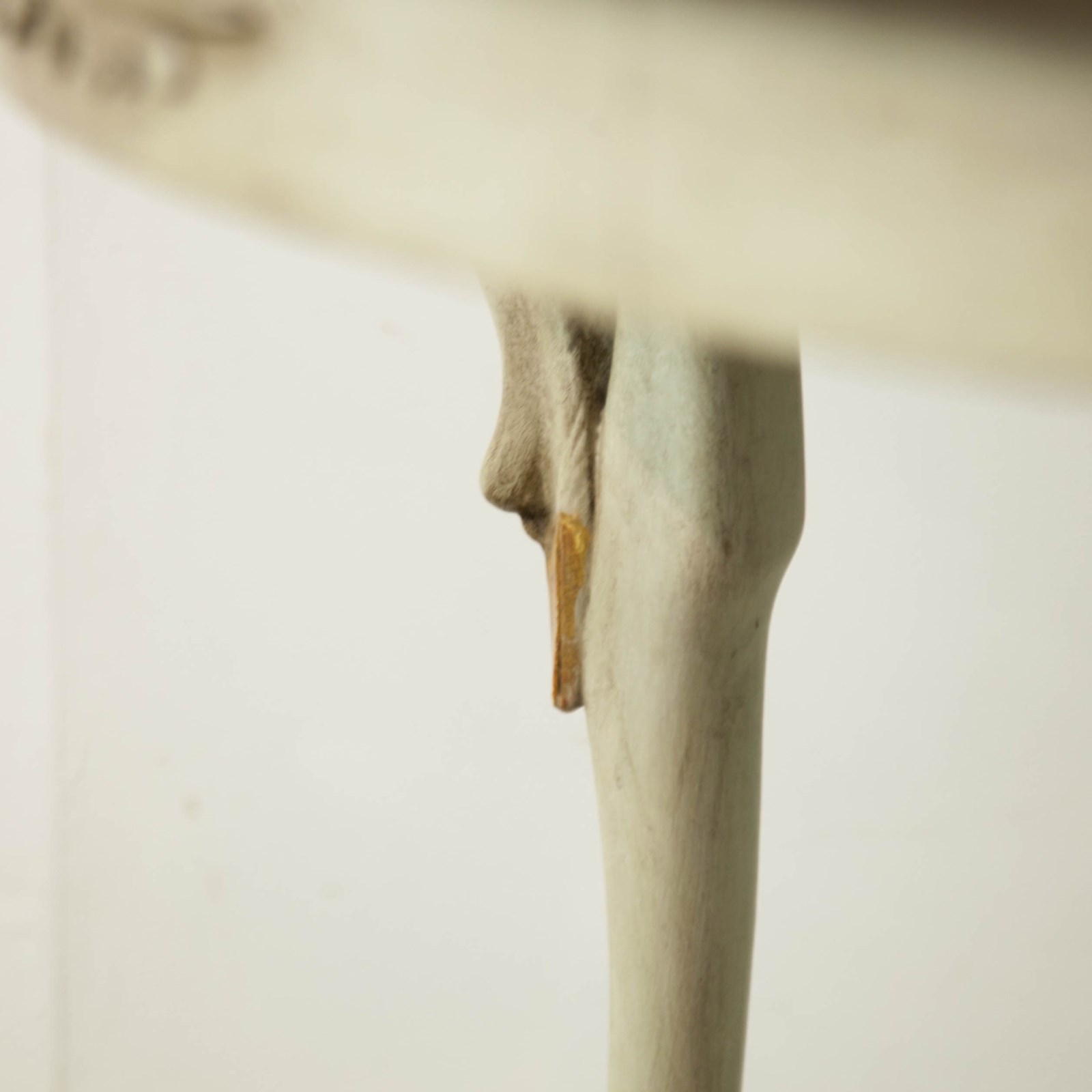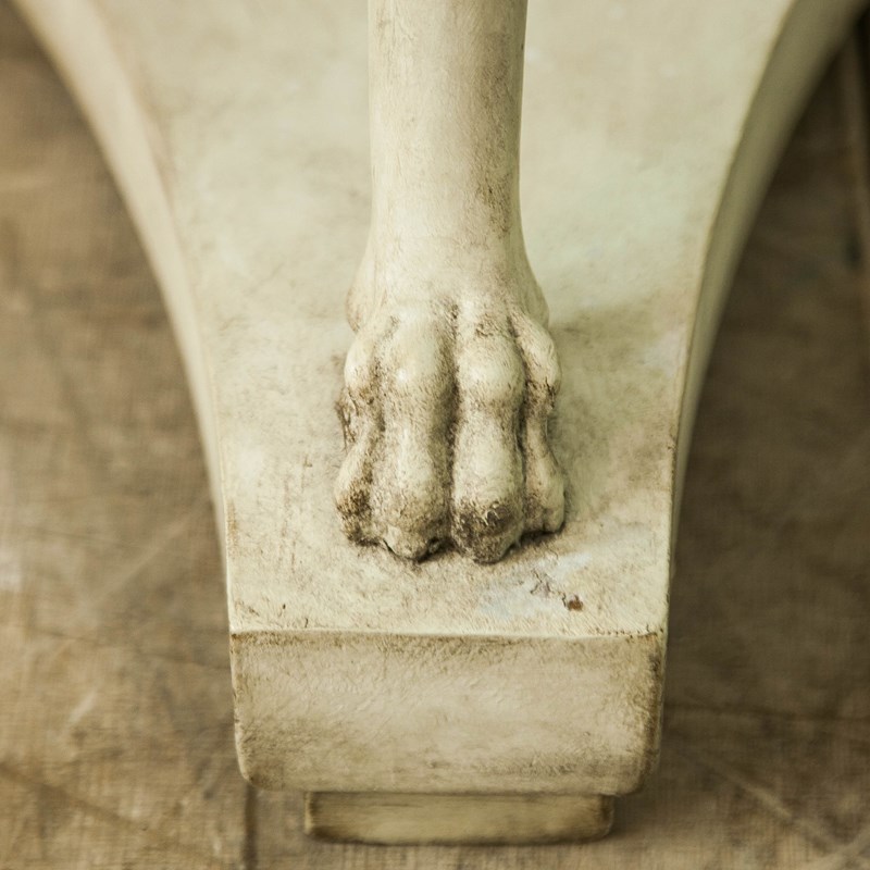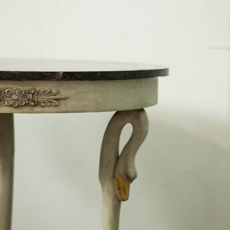With 3 legs carved in the form of monopod swan head with a lion paw foot and gilded beaks and raised on a tri-form plinth base.