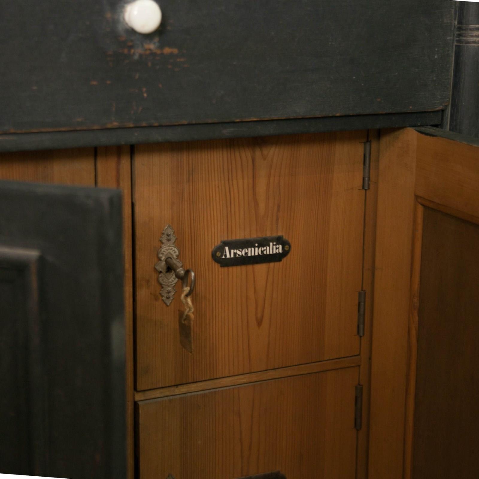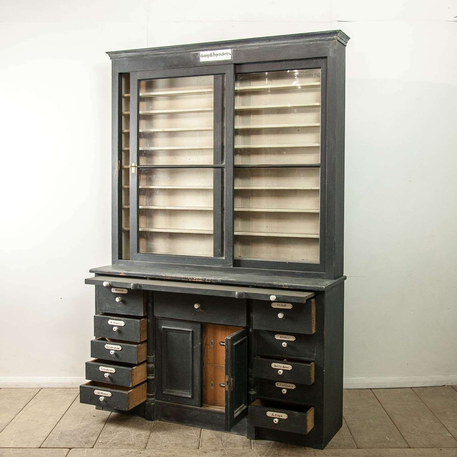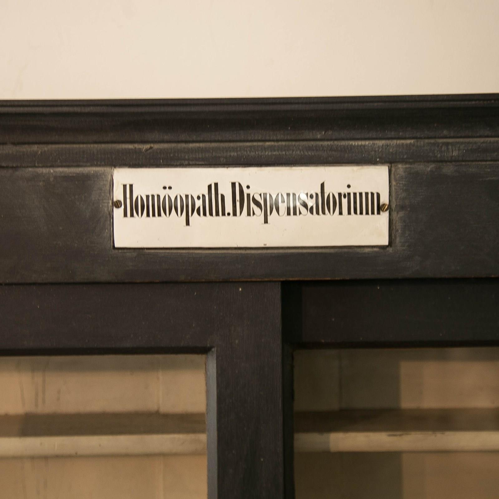 Extraordinary "Homoopath Dispensatorium" or Homeopaths dispensory. Of pine construction with multiply shelves, drawers and cupboard storage options. Drawers having enamel labels and white ceramic handles. The upper section with sliding glazed doors.