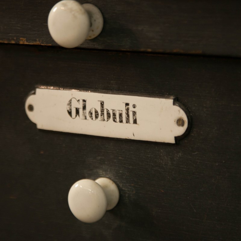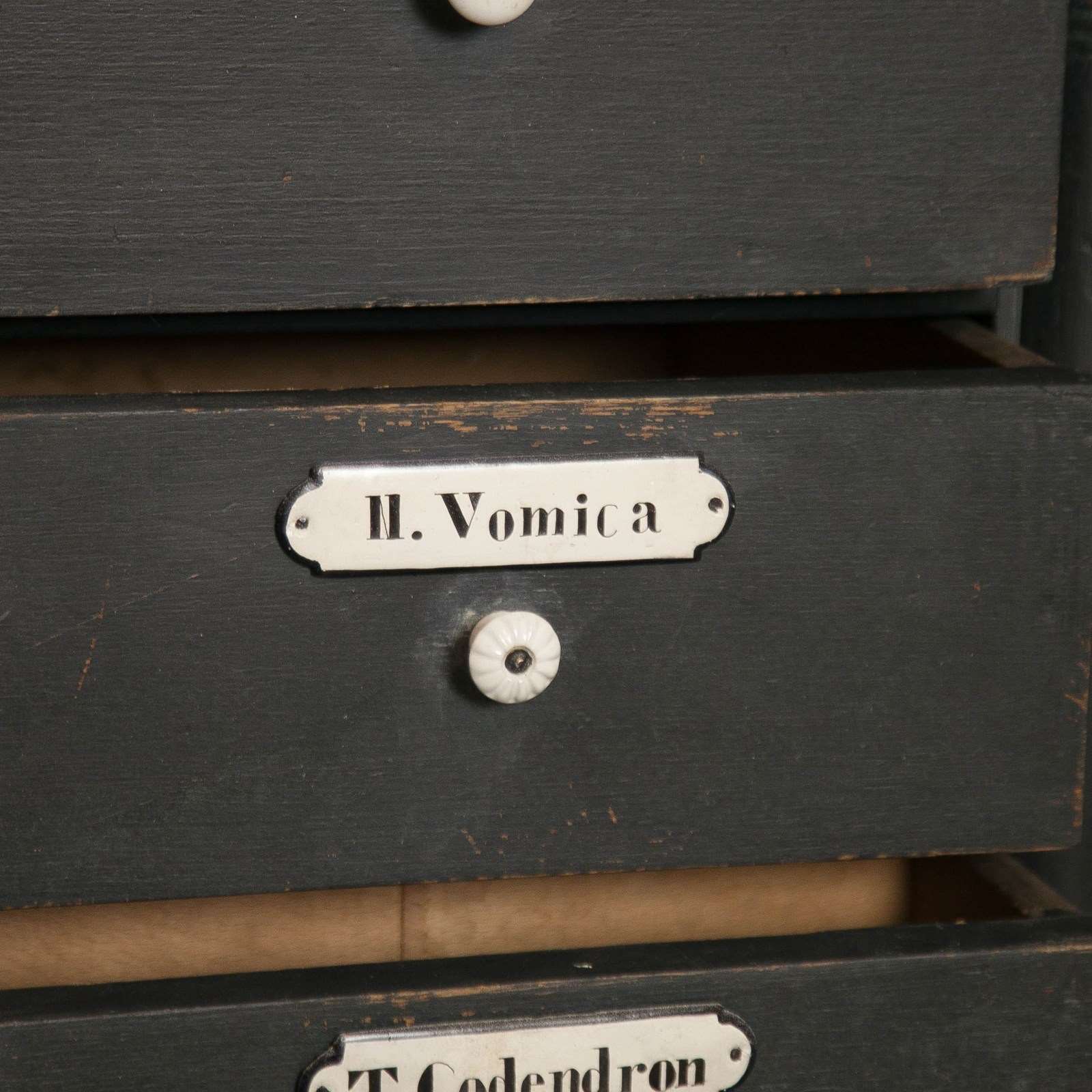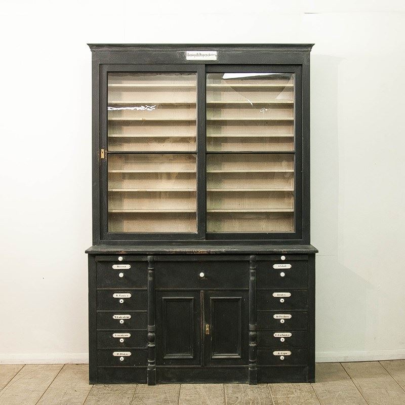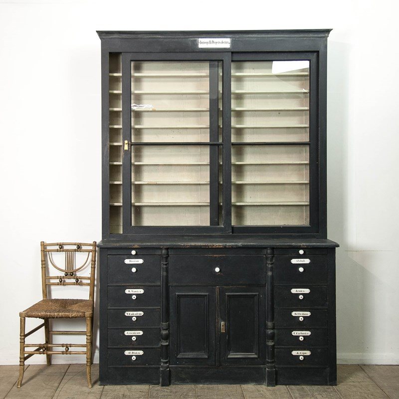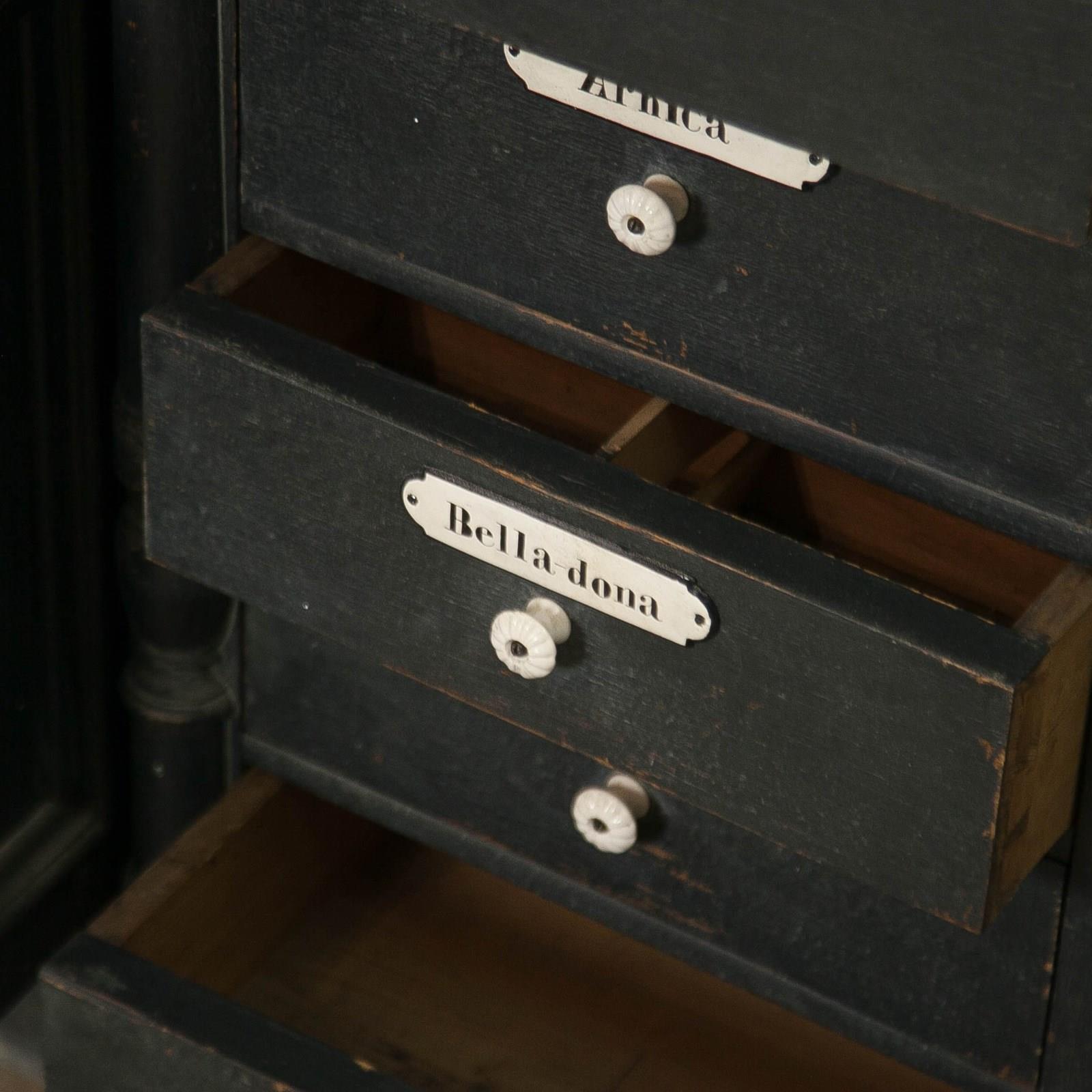 Extraordinary "Homoopath Dispensatorium" or Homeopaths dispensory. Of pine construction with multiply shelves, drawers and cupboard storage options. Drawers having enamel labels and white ceramic handles. The upper section with sliding glazed doors.