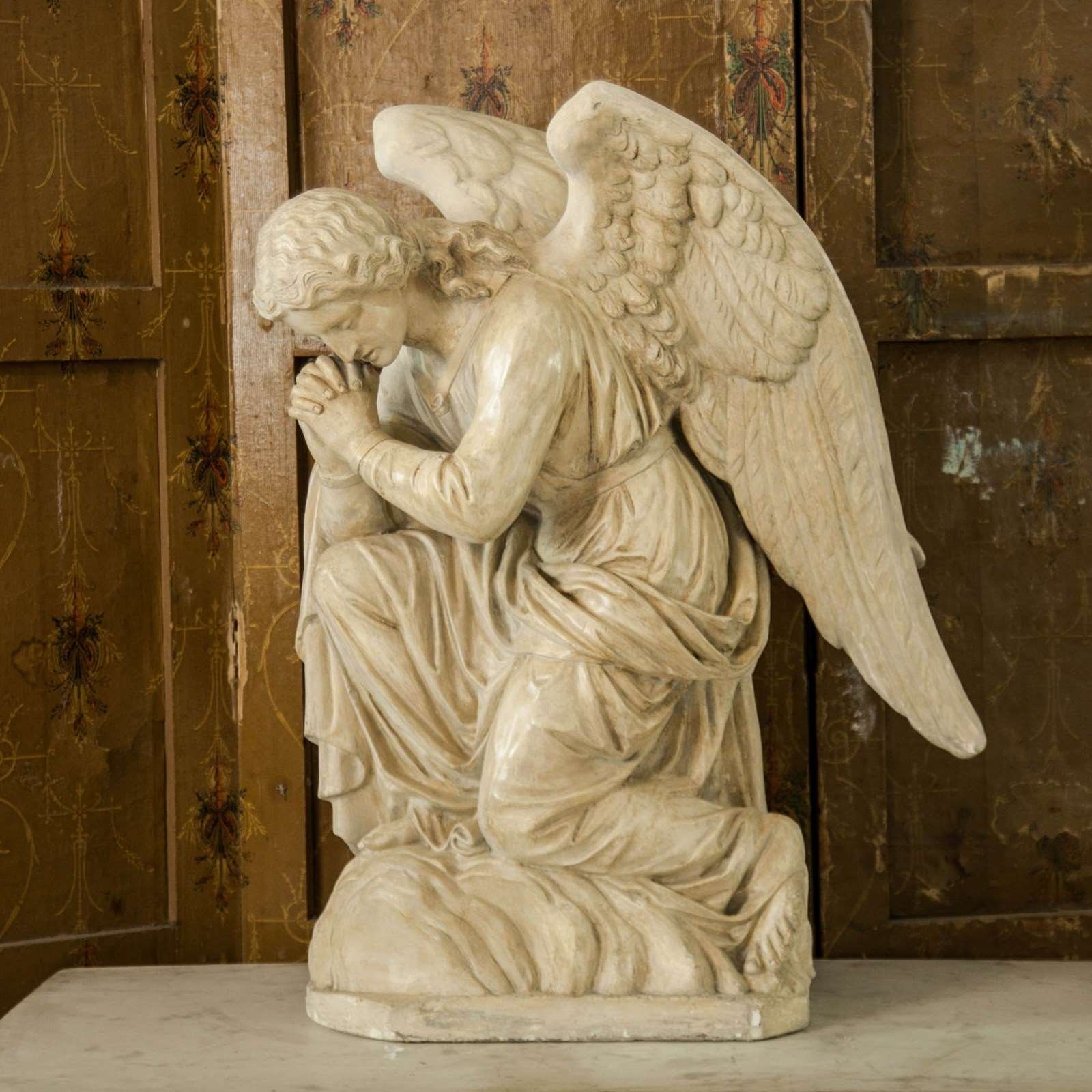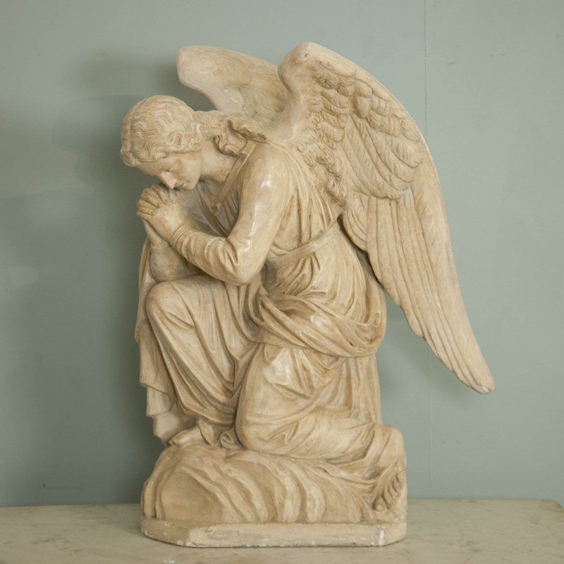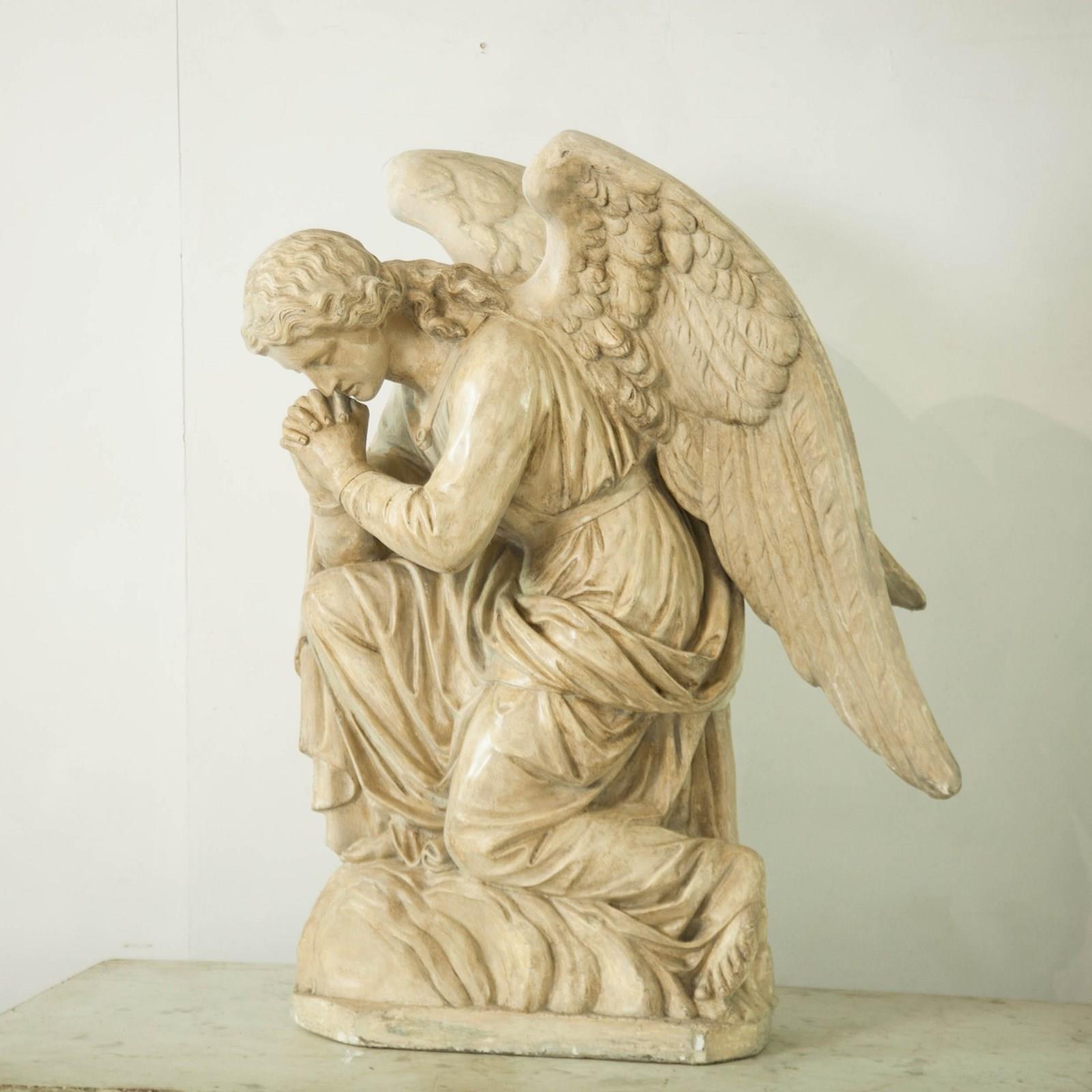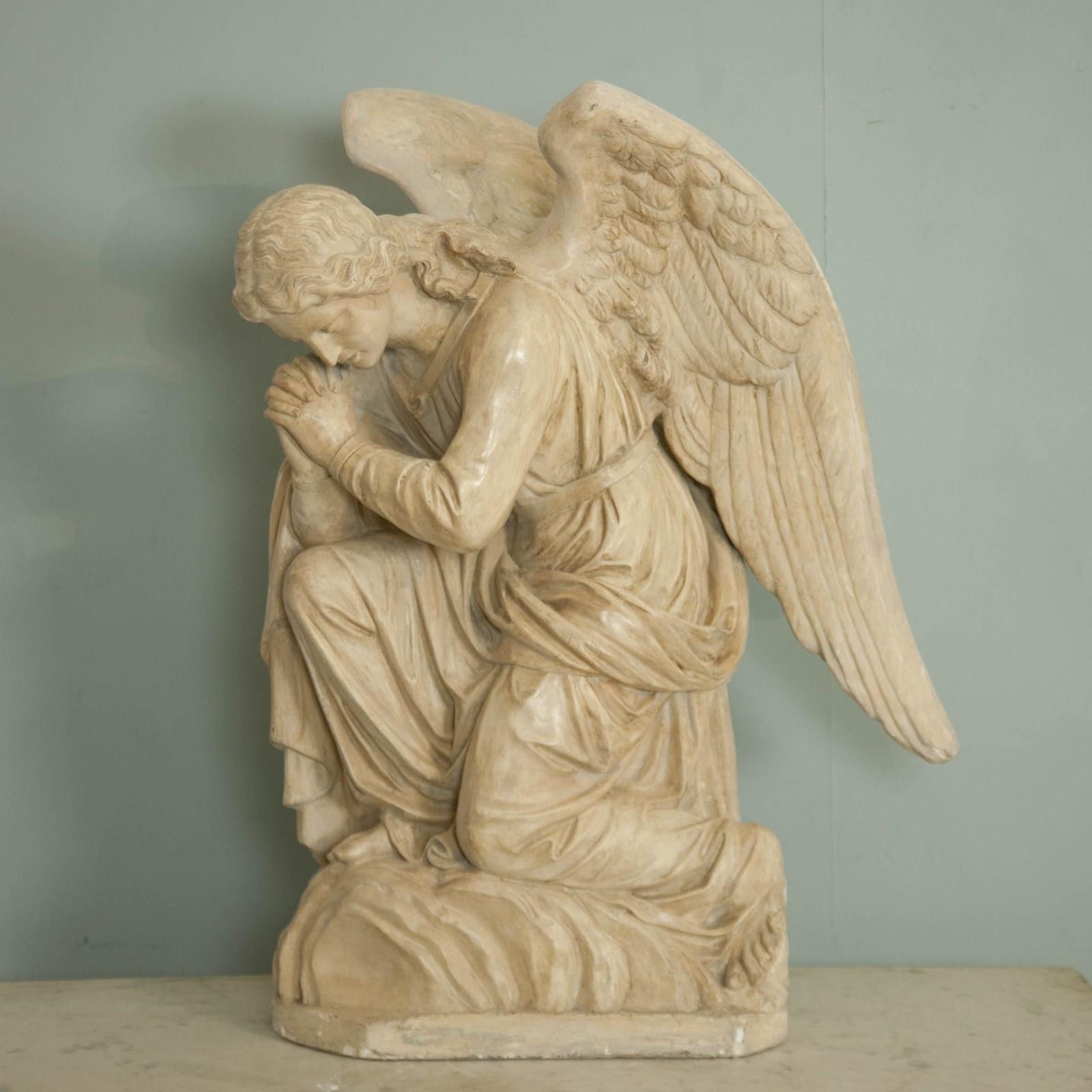 A large, plaster Angel figure. Finely sculpted kneeling model with well executed wings and drapery. Dimensions of base 49 cm x 29