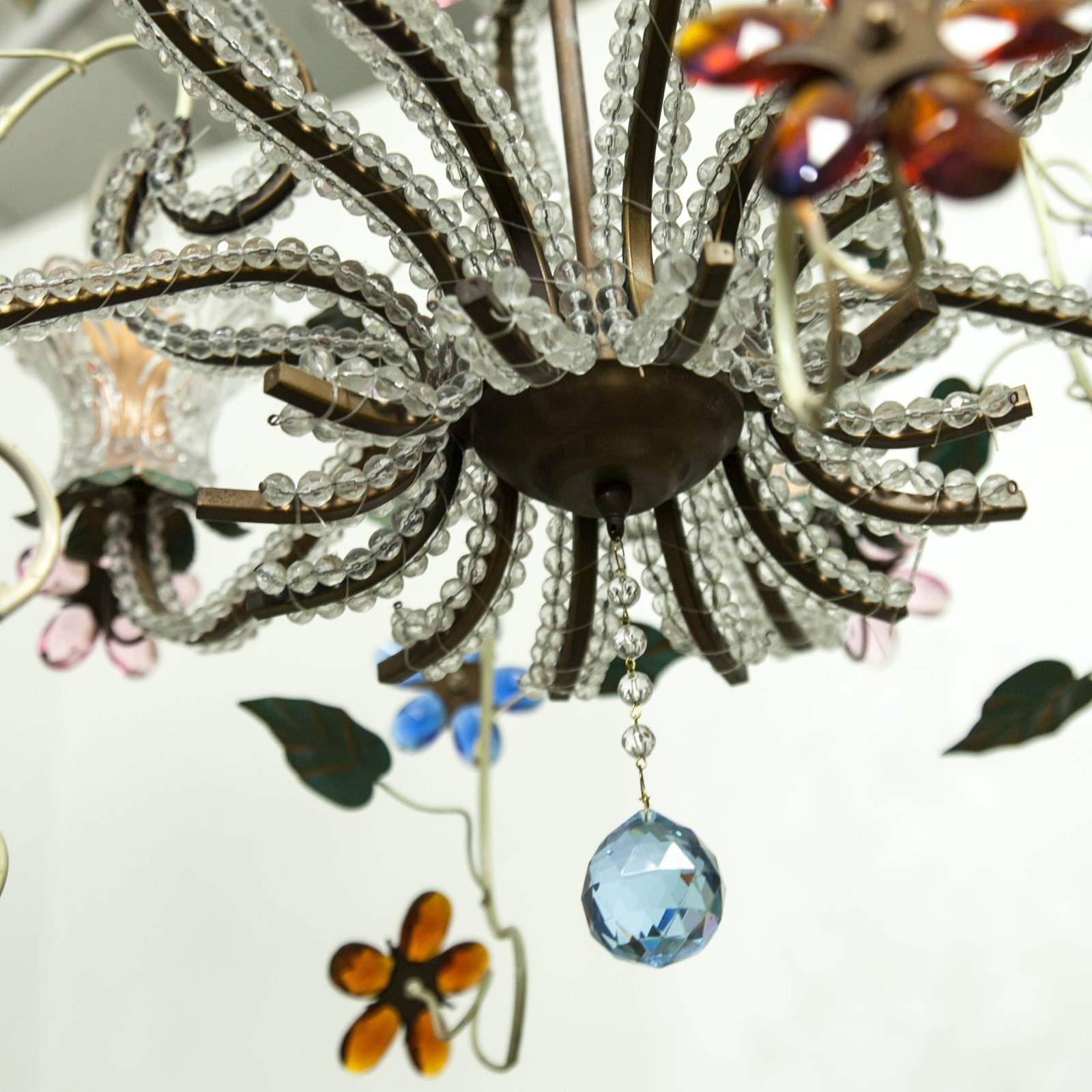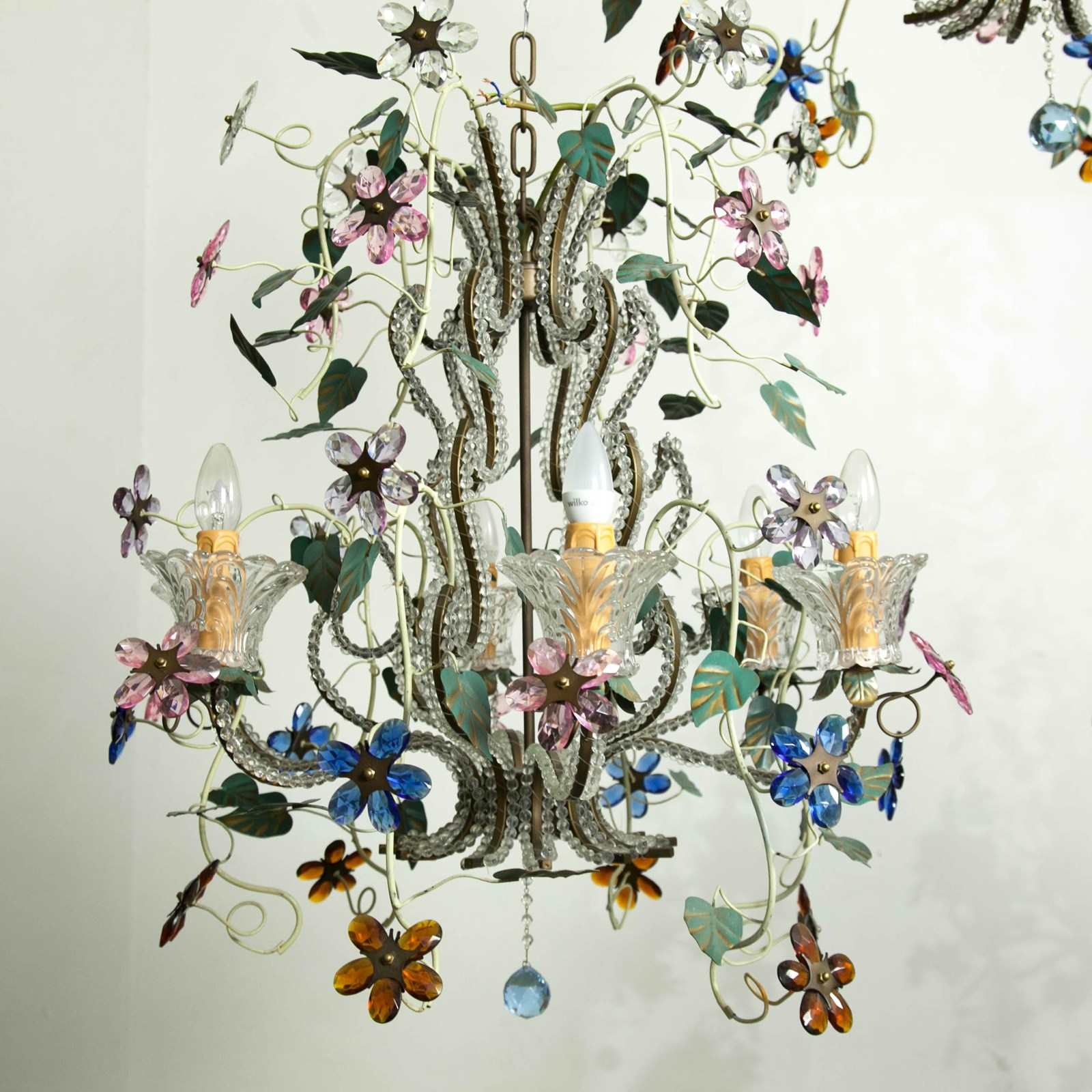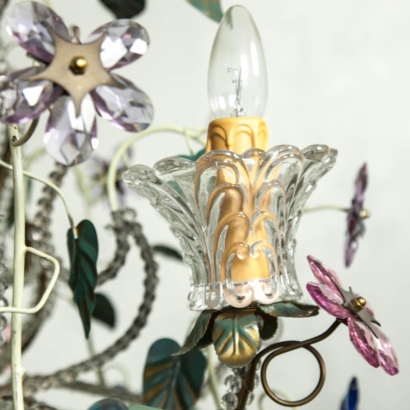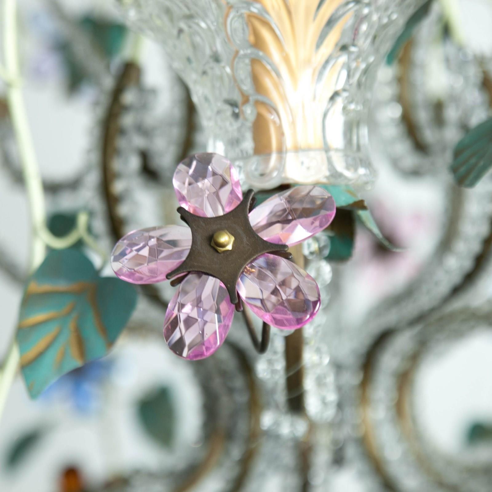 Majestically crafted in the esteemed style of Maison Bagues, these exquisite, large-scale chandeliers boast six intricately designed arms with large glass cupped bulb holders. Adorned with vibrant colourful crystal floral motifs and adorned with delicate, clear crystal-encrusted accents, the sweeping arms of these stunning pieces radiate glamour and sophistication, bringing an air of refined elegance to any space. 3 available.