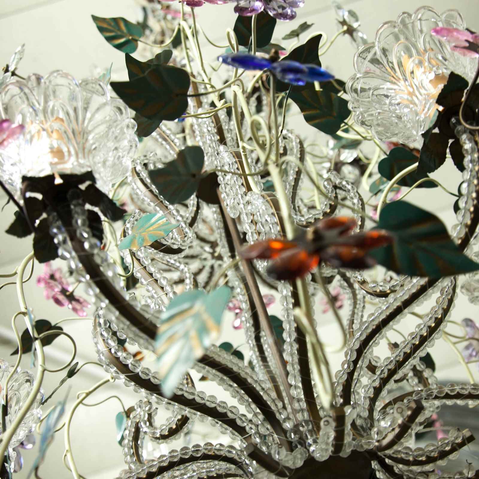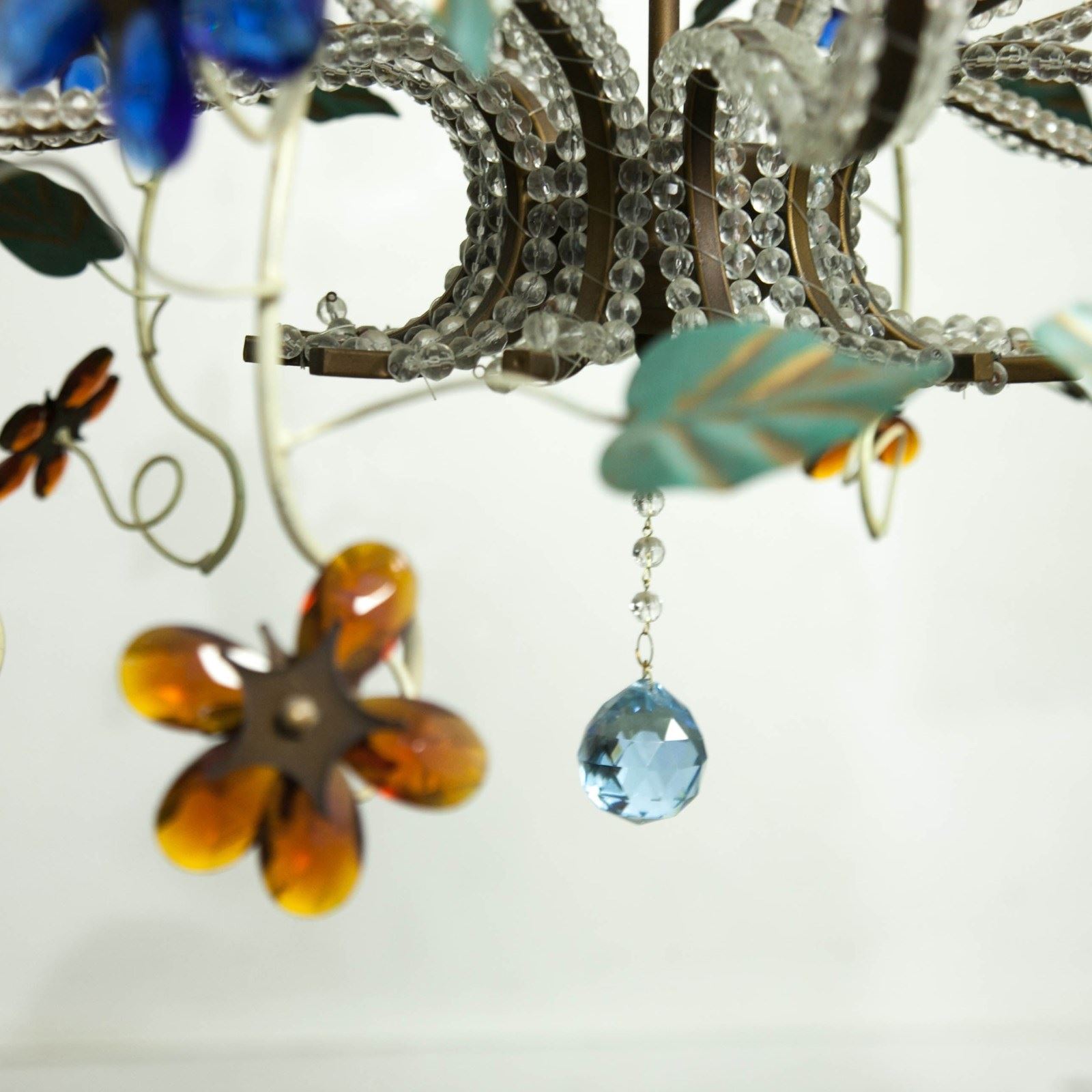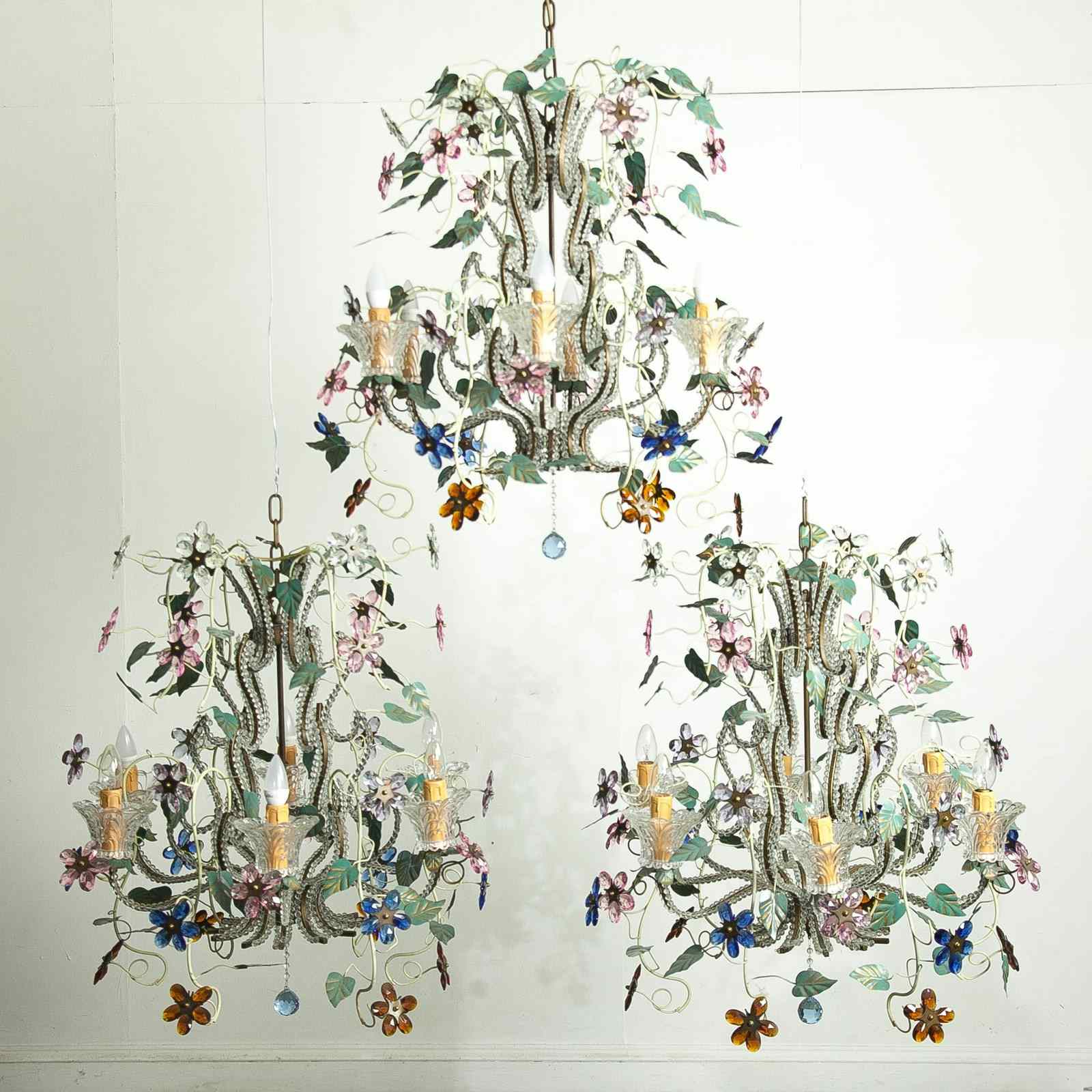 Majestically crafted in the esteemed style of Maison Bagues, these exquisite, large-scale chandeliers boast six intricately designed arms with large glass cupped bulb holders. Adorned with vibrant colourful crystal floral motifs and adorned with delicate, clear crystal-encrusted accents, the sweeping arms of these stunning pieces radiate glamour and sophistication, bringing an air of refined elegance to any space. 3 available.