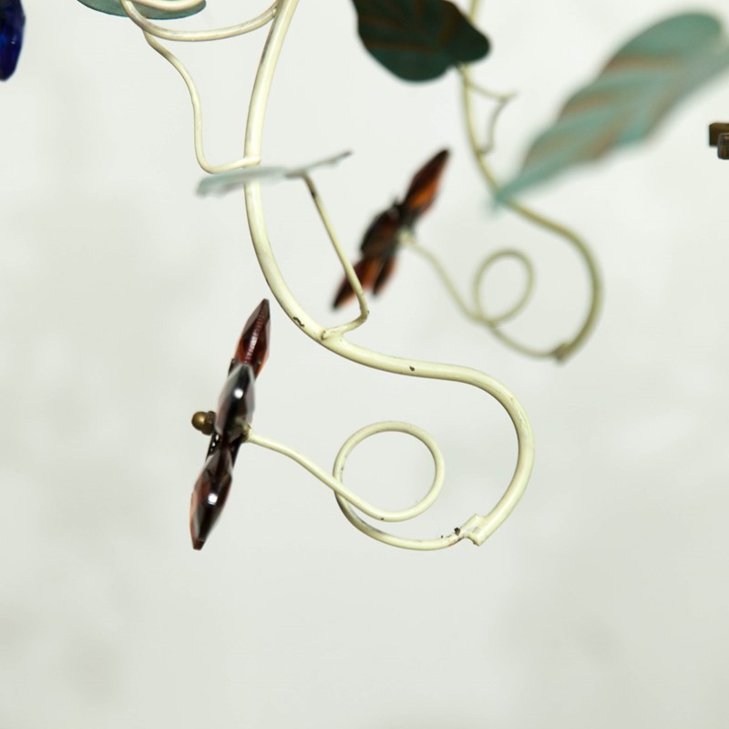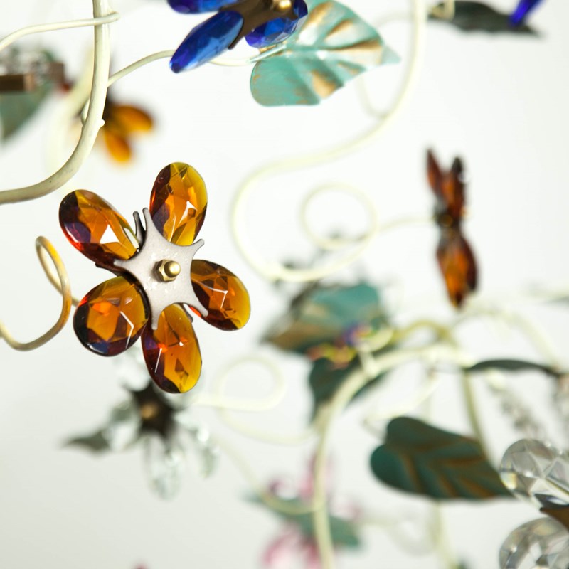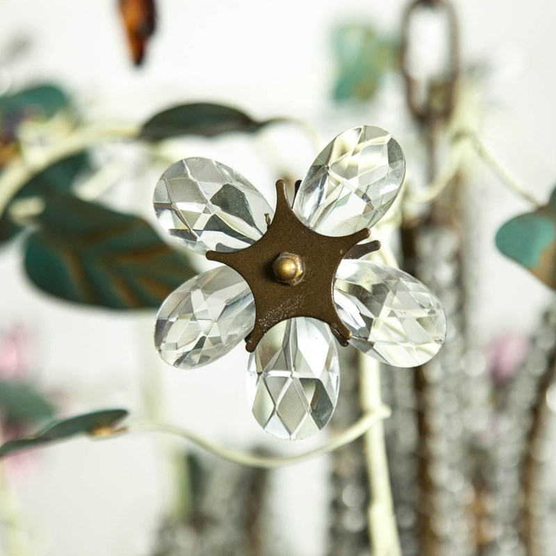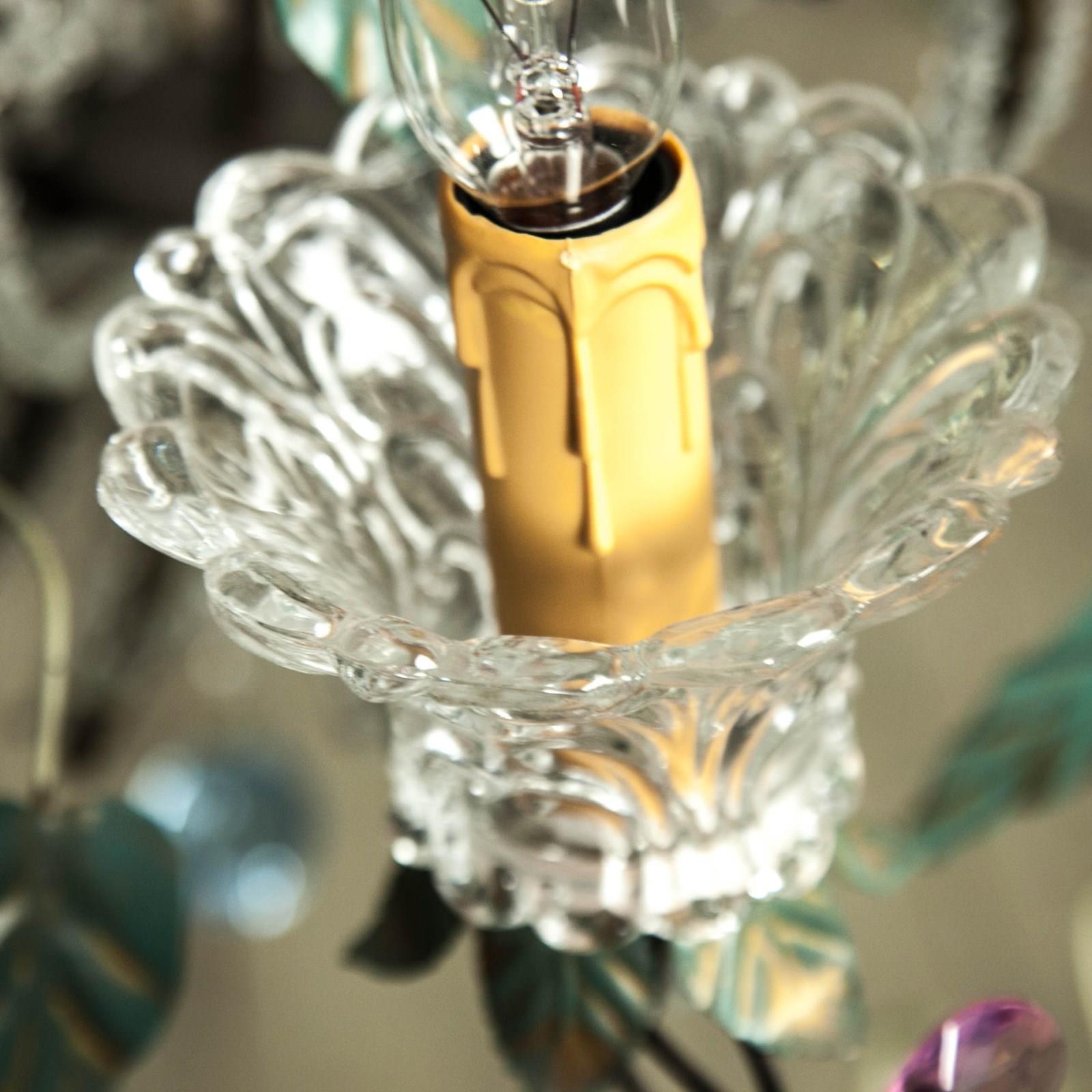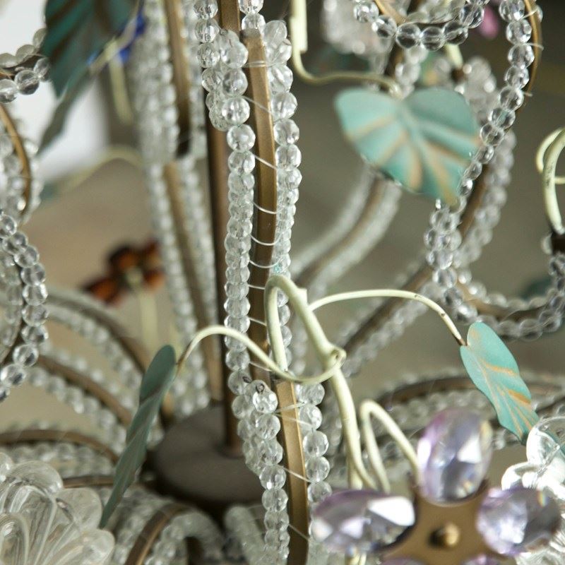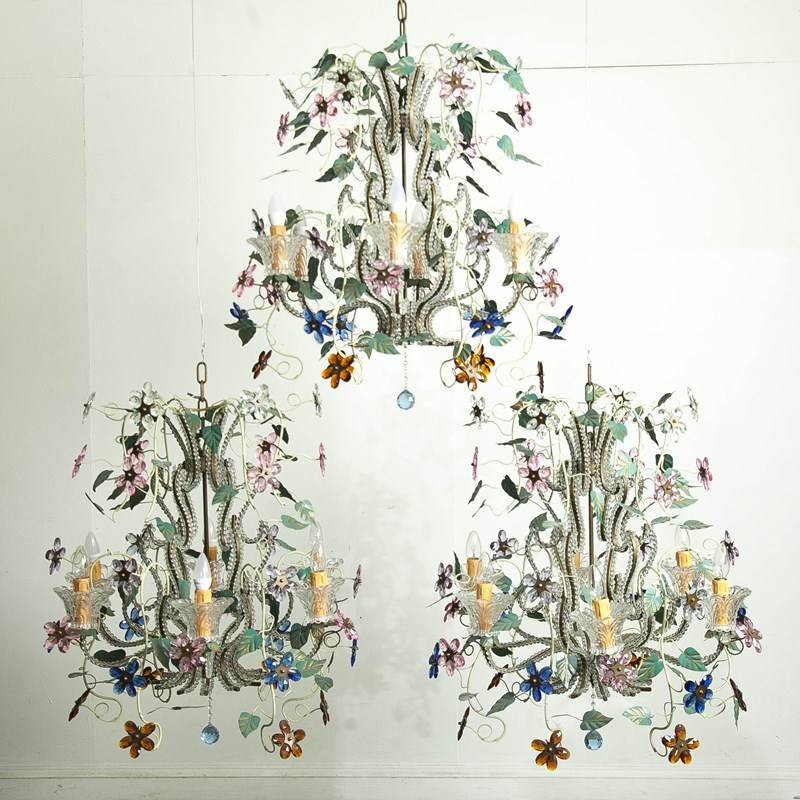 Majestically crafted in the esteemed style of Maison Bagues, these exquisite, large-scale chandeliers boast six intricately designed arms with large glass cupped bulb holders. Adorned with vibrant colourful crystal floral motifs and adorned with delicate, clear crystal-encrusted accents, the sweeping arms of these stunning pieces radiate glamour and sophistication, bringing an air of refined elegance to any space. 3 available.