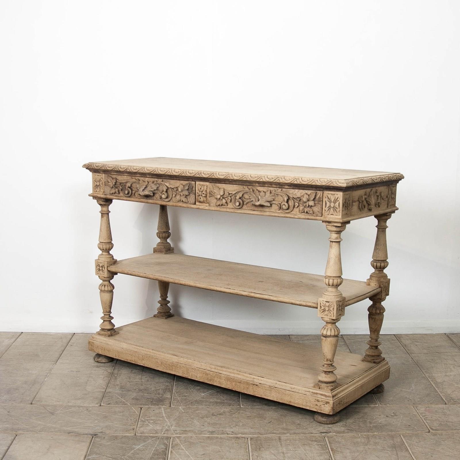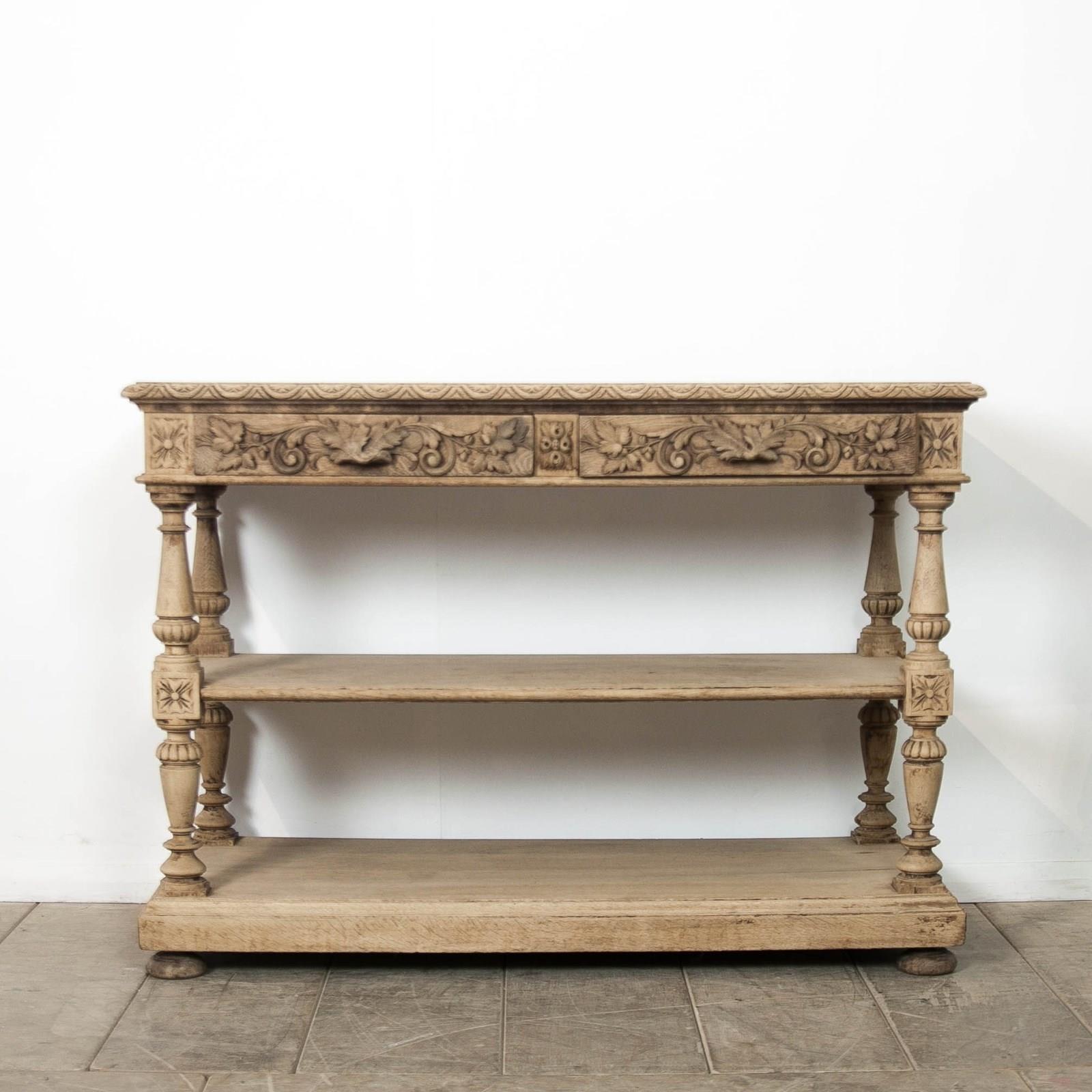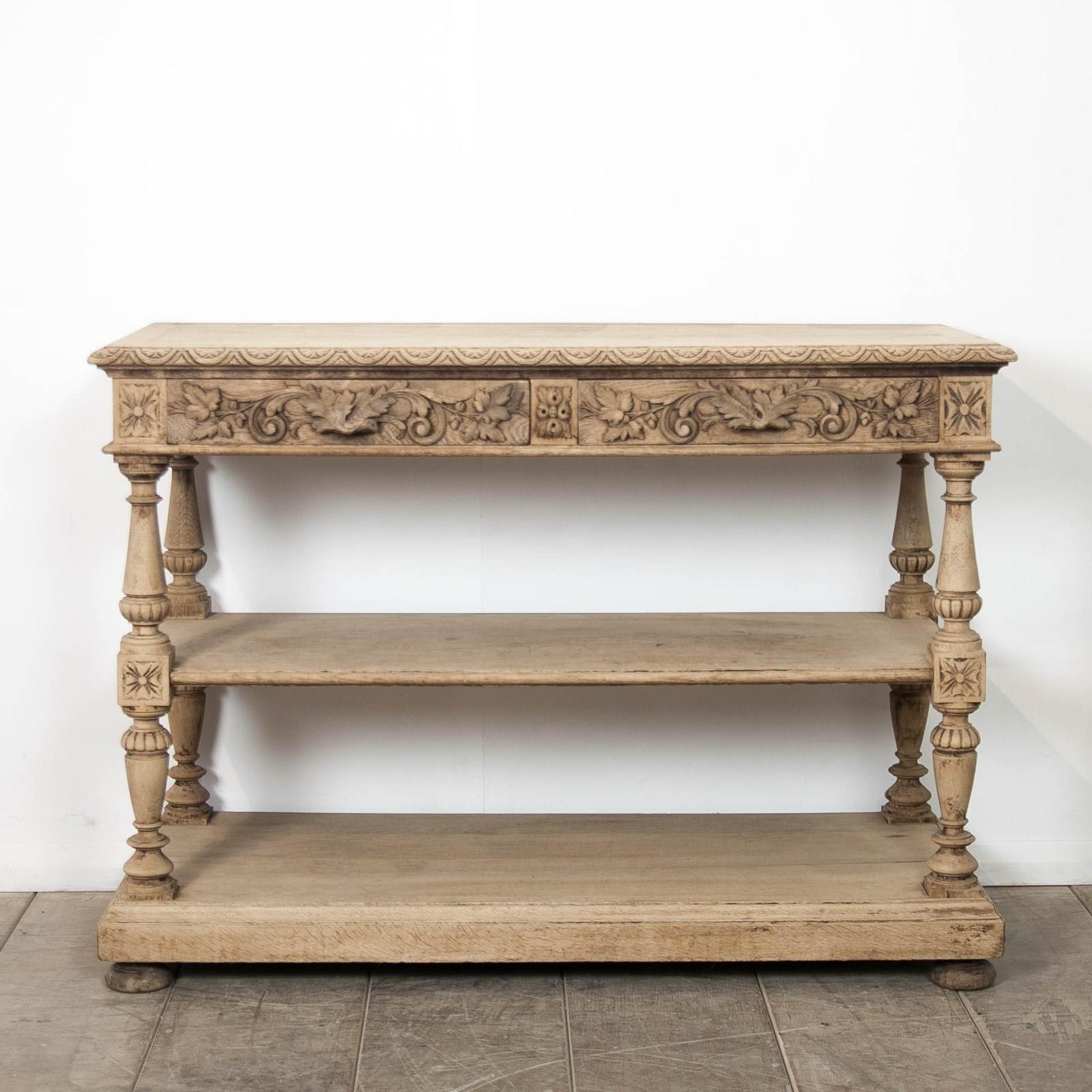 A carved, bleached oak, French 19th Century, Etagere. Comprising 2 drawers and 2 lower shelves.