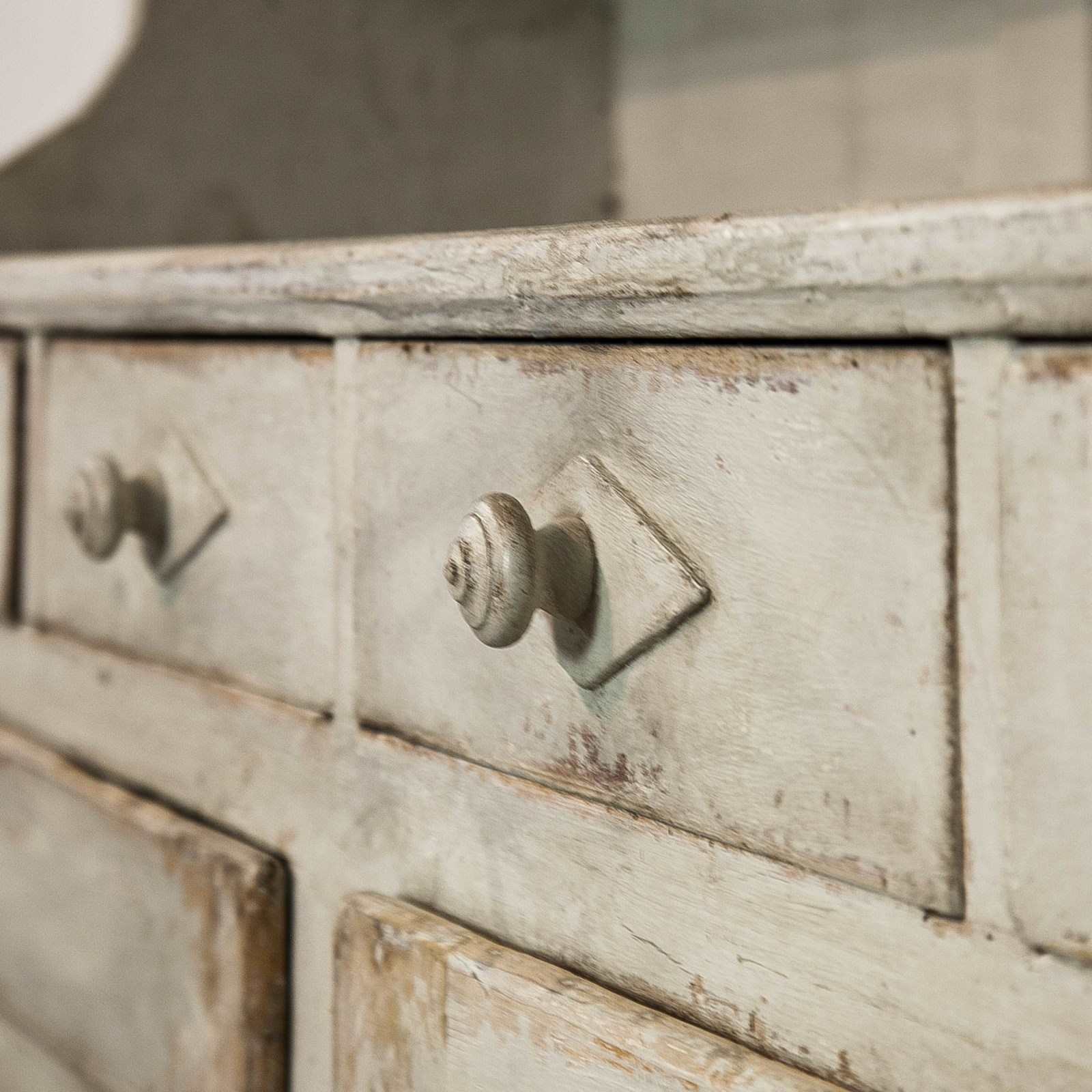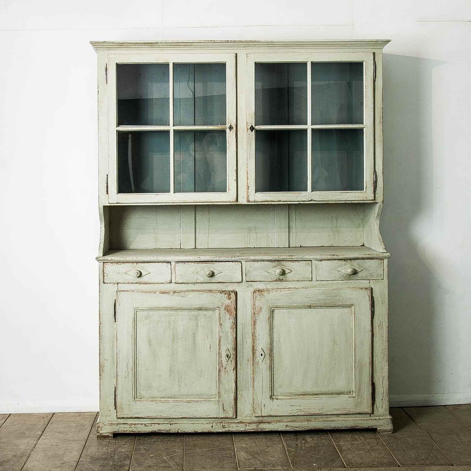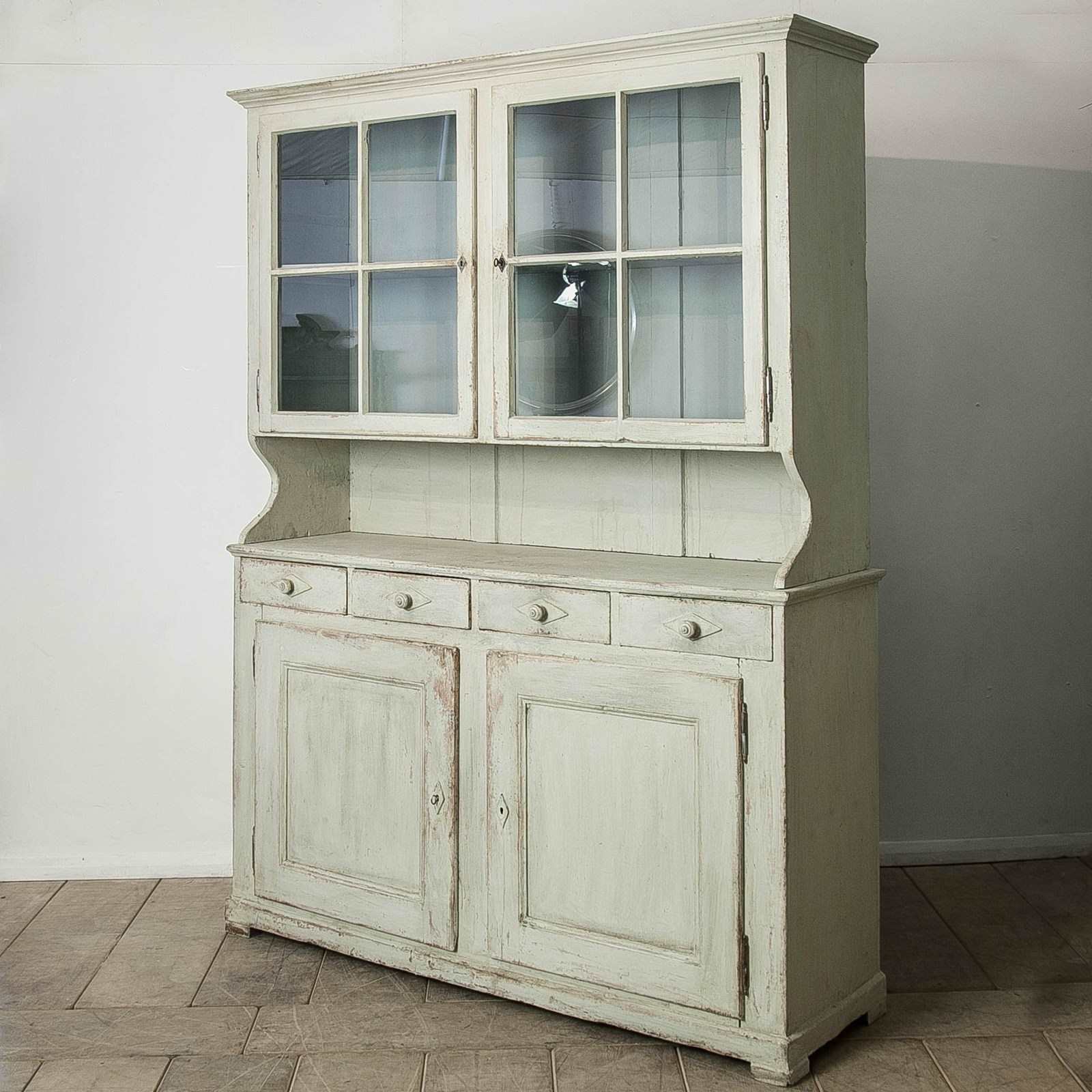 A 19th century buffet deux corps/dresser. Comprising a base with 2 panelled doors and a row of 4 drawers with turned knob handles with a seperate upper glazed section with 2 doors. the whole being later painted in a soft grey/white.