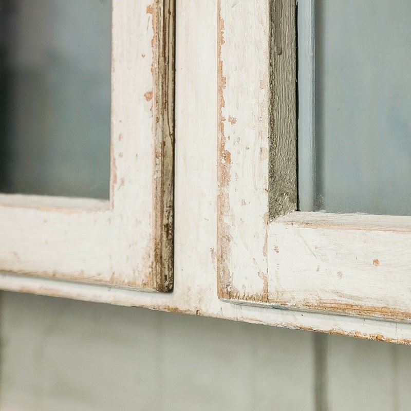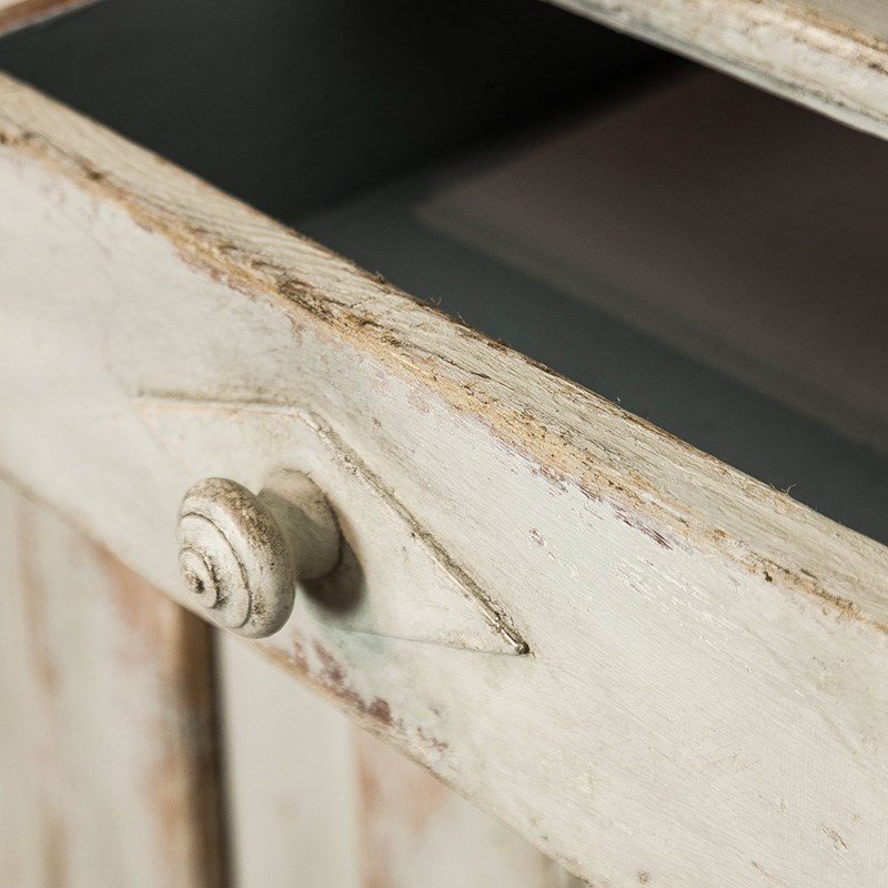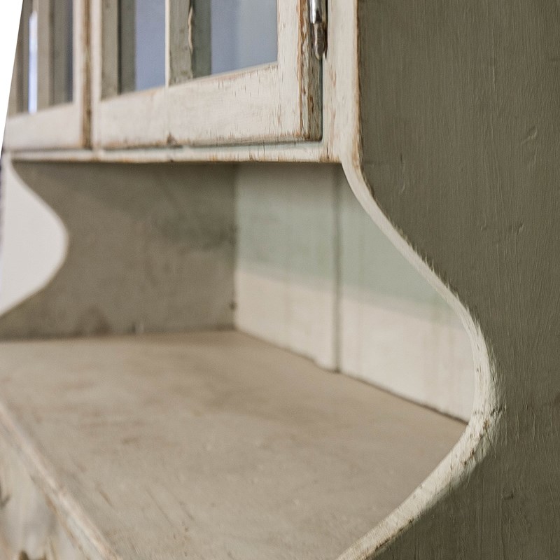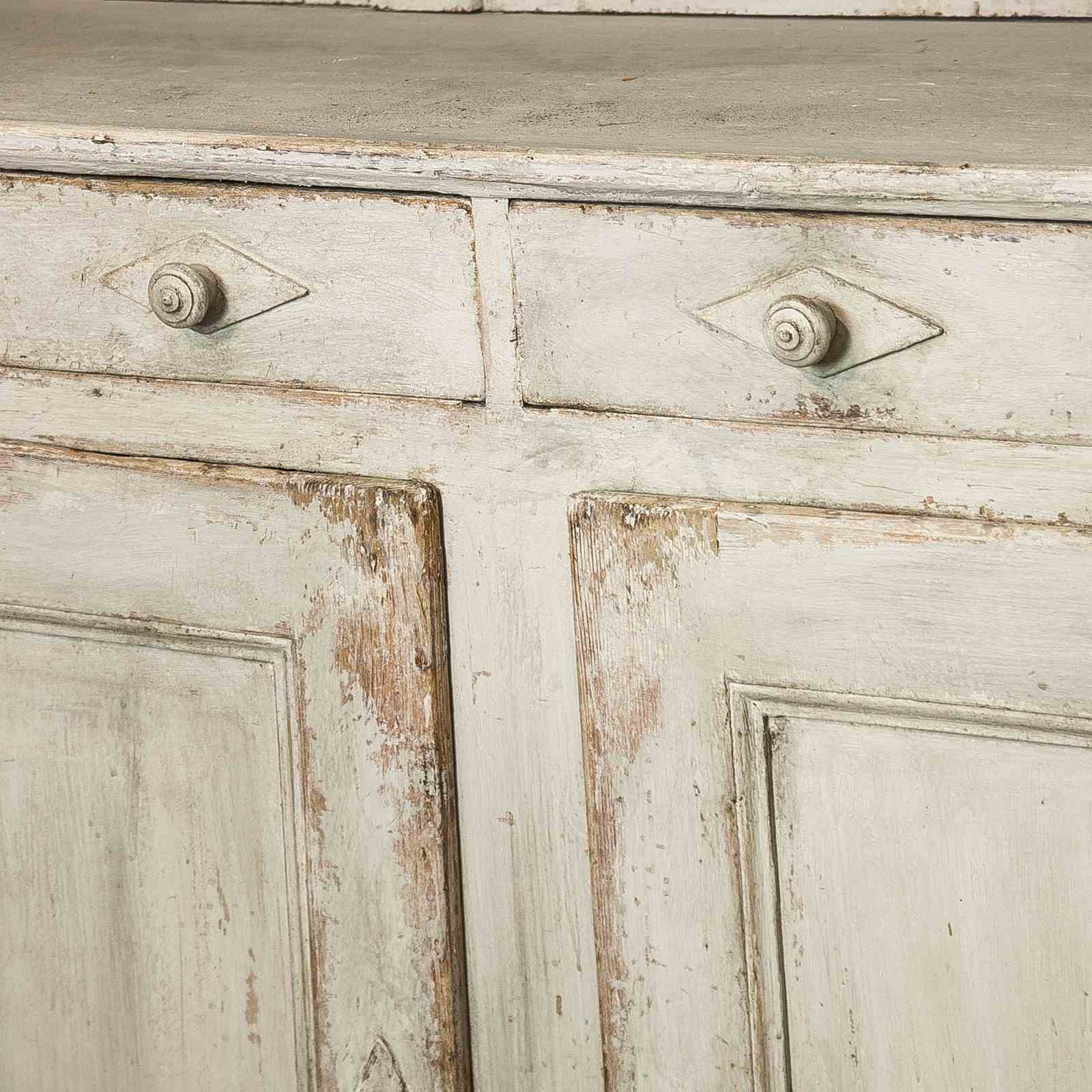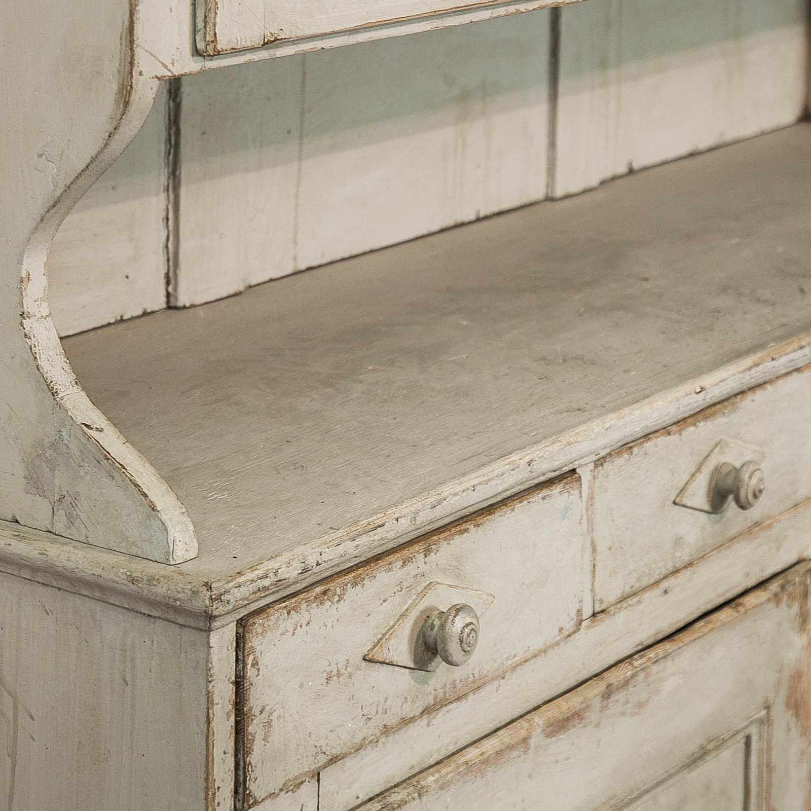 A 19th century buffet deux corps/dresser. Comprising a base with 2 panelled doors and a row of 4 drawers with turned knob handles with a seperate upper glazed section with 2 doors. the whole being later painted in a soft grey/white.