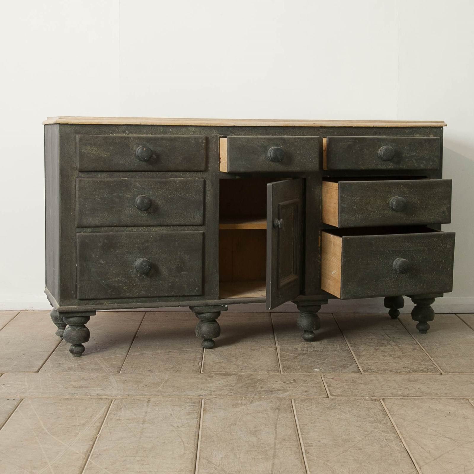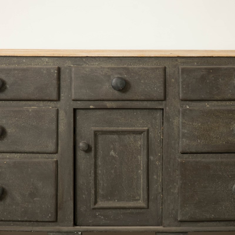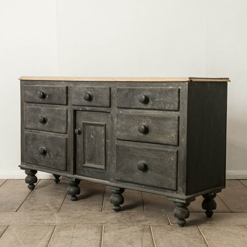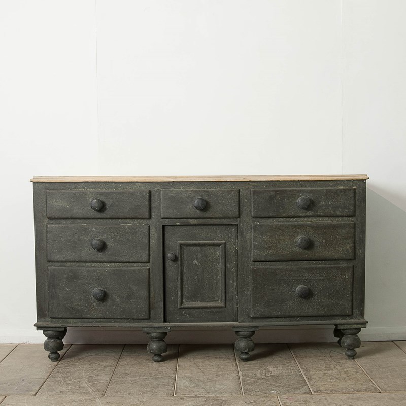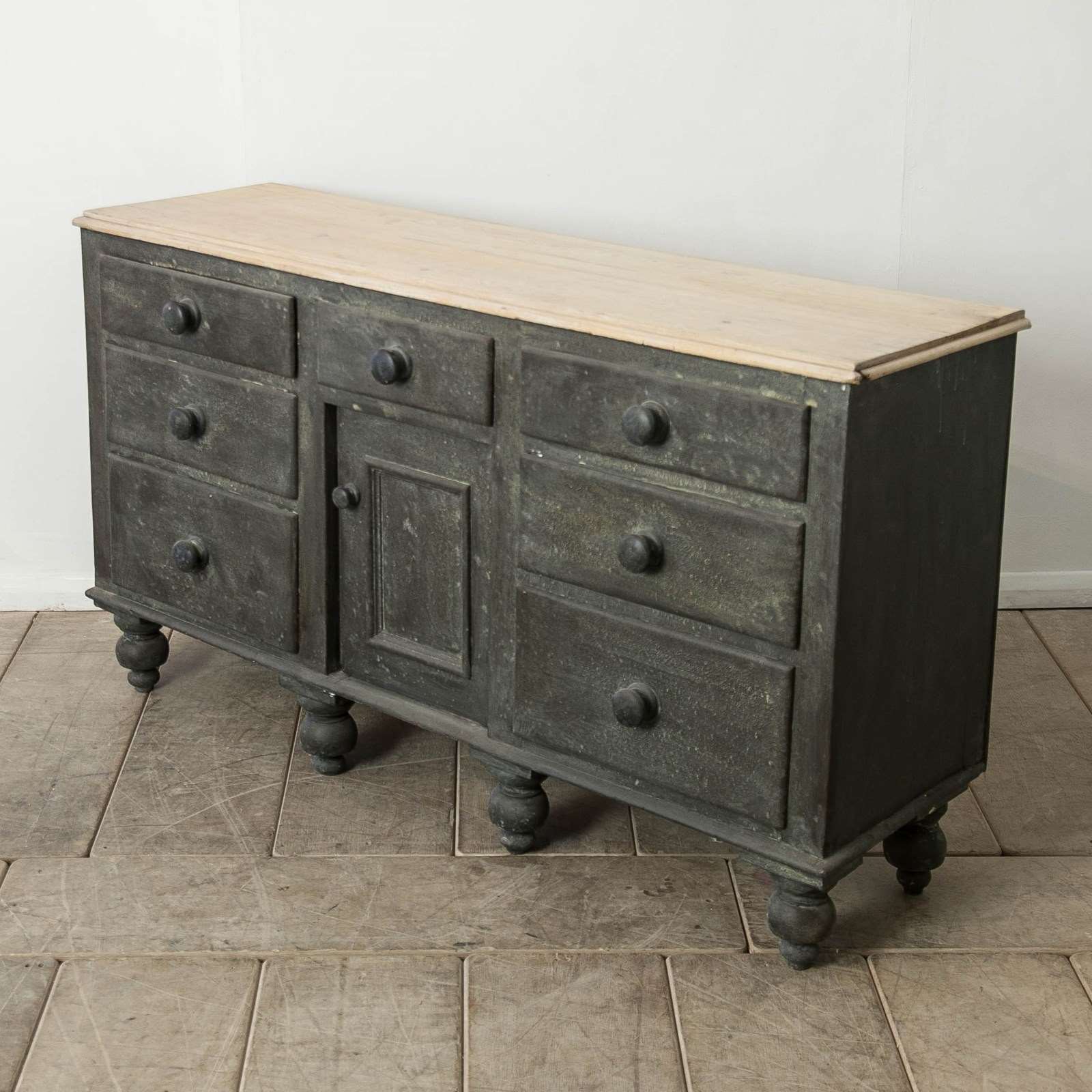 Painted pine English, Victorian dresser base. Consisting of 7 drawers and a central cupboard space. Raised on turned feet with a scrubbed pine top.