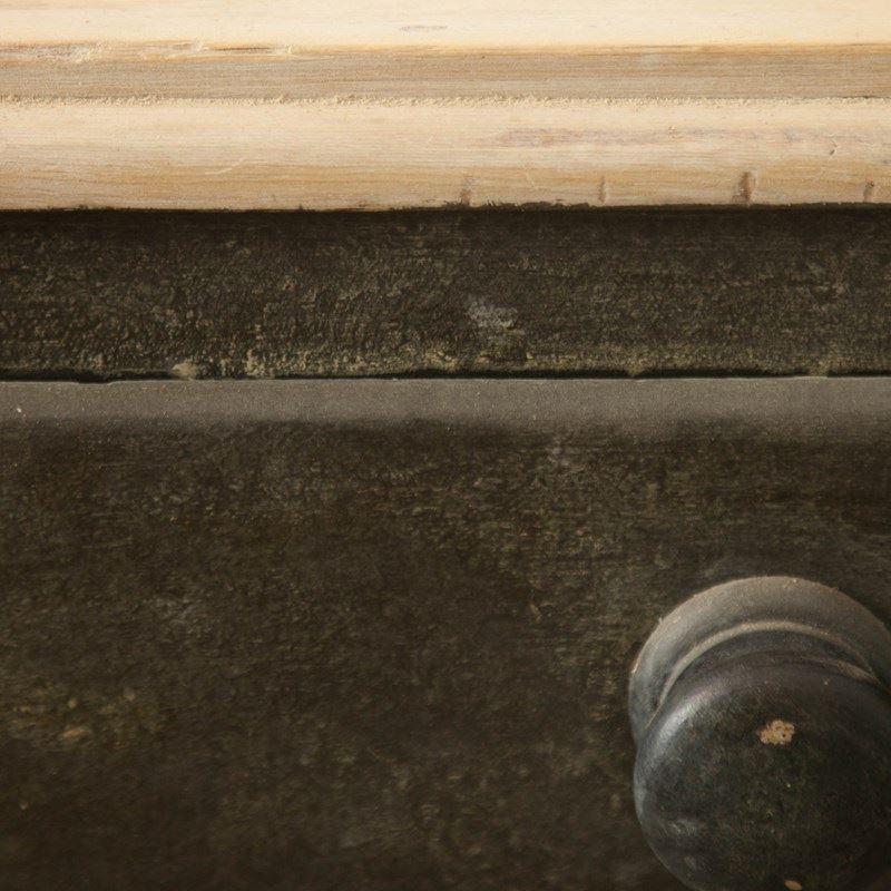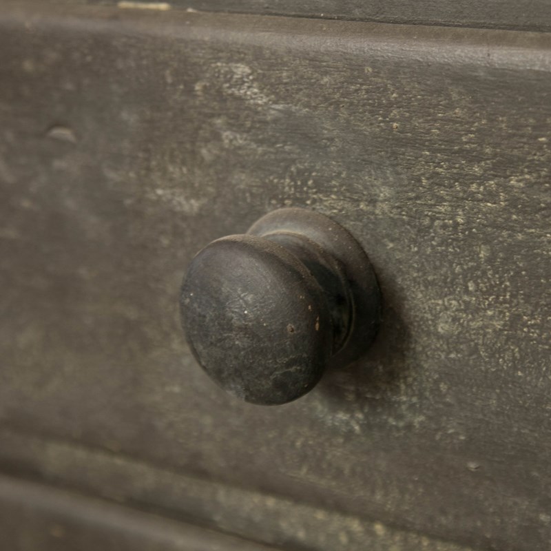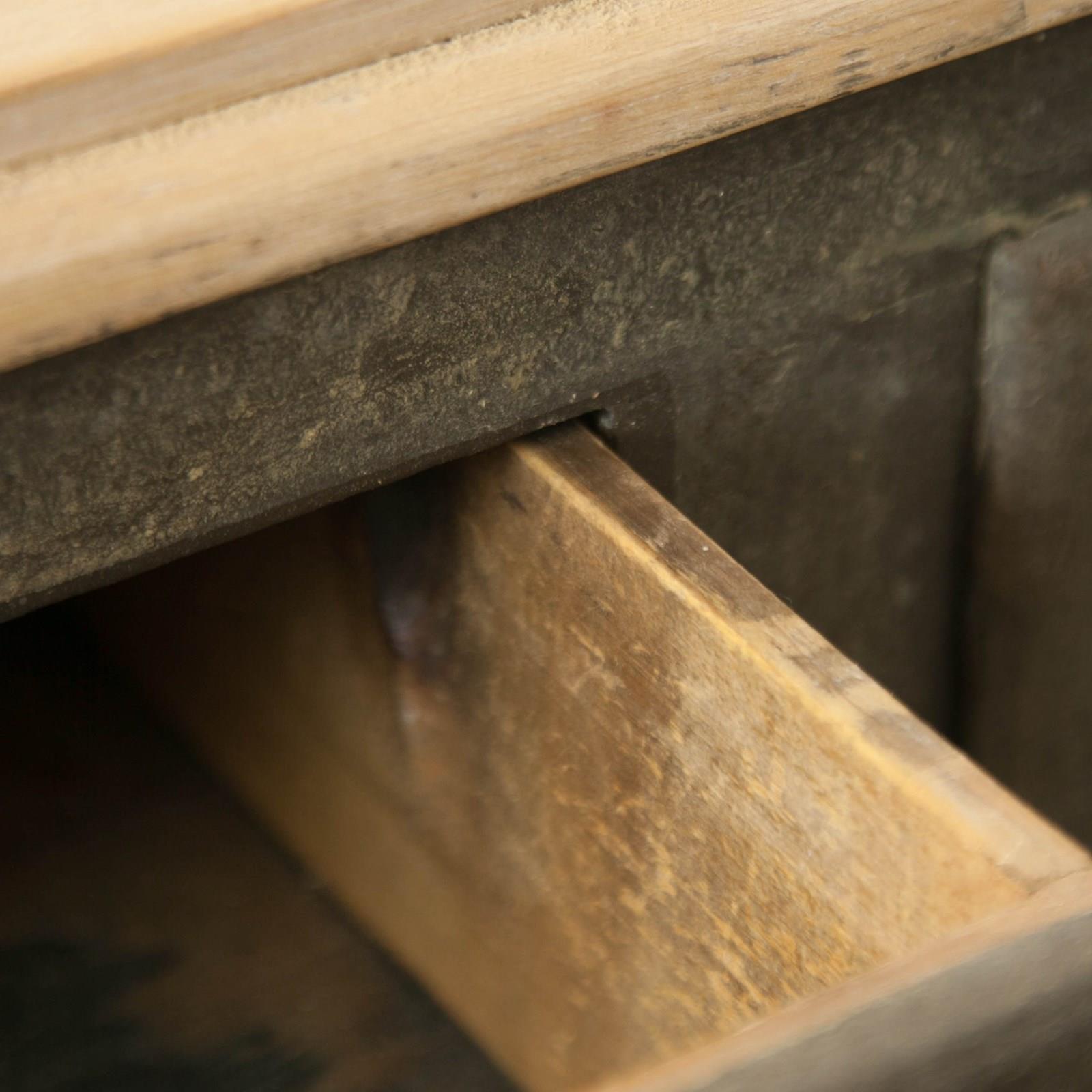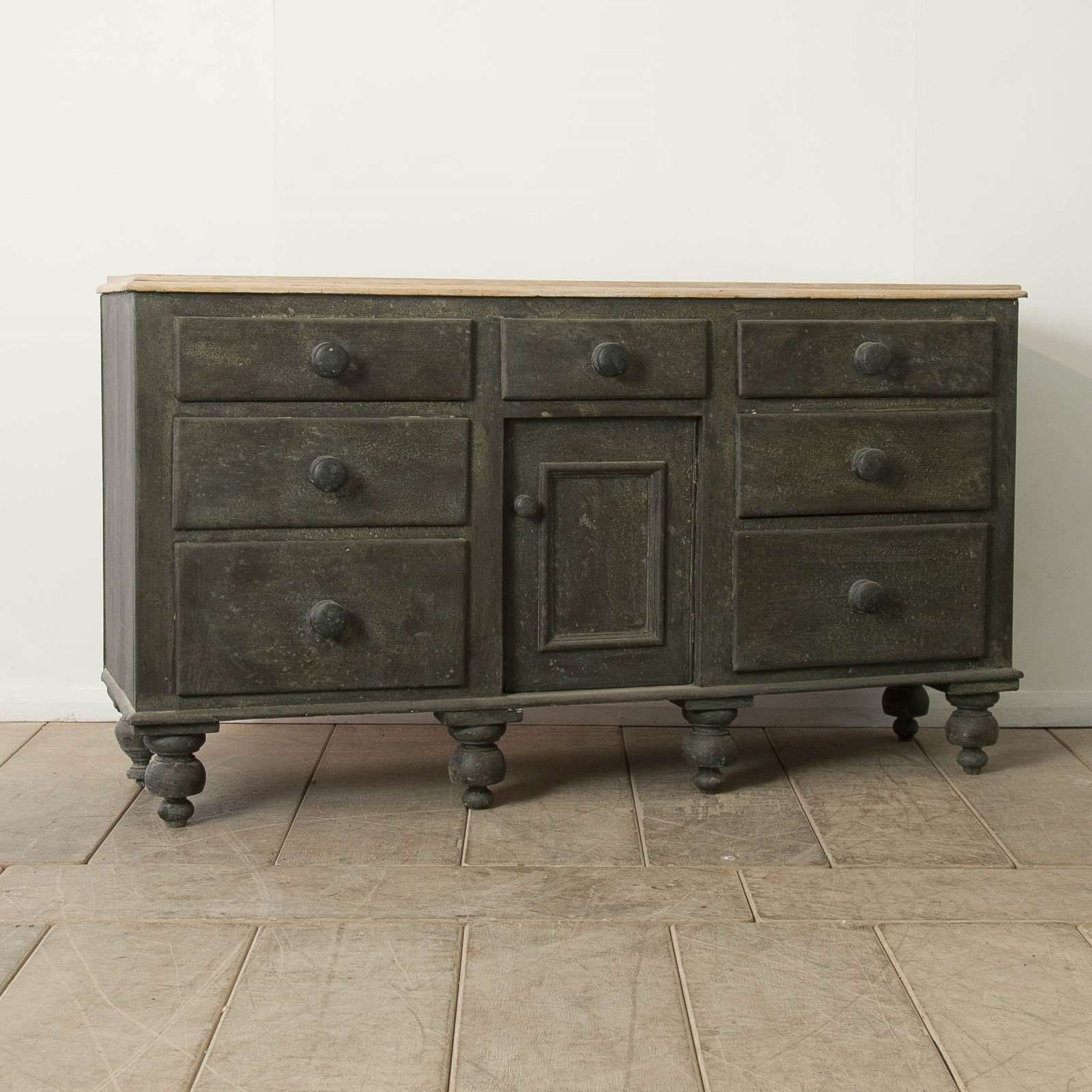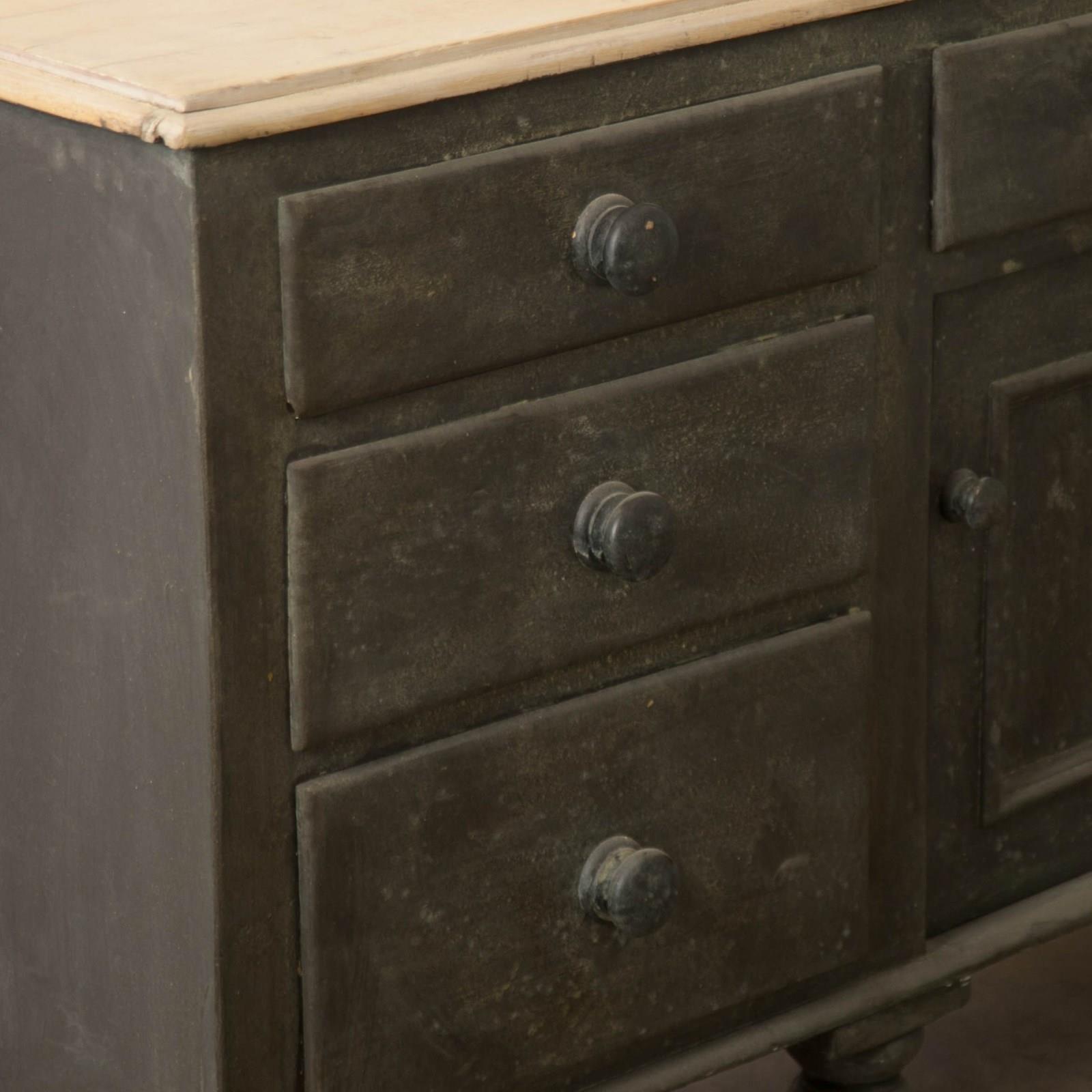 Painted pine English, Victorian dresser base. Consisting of 7 drawers and a central cupboard space. Raised on turned feet with a scrubbed pine top.