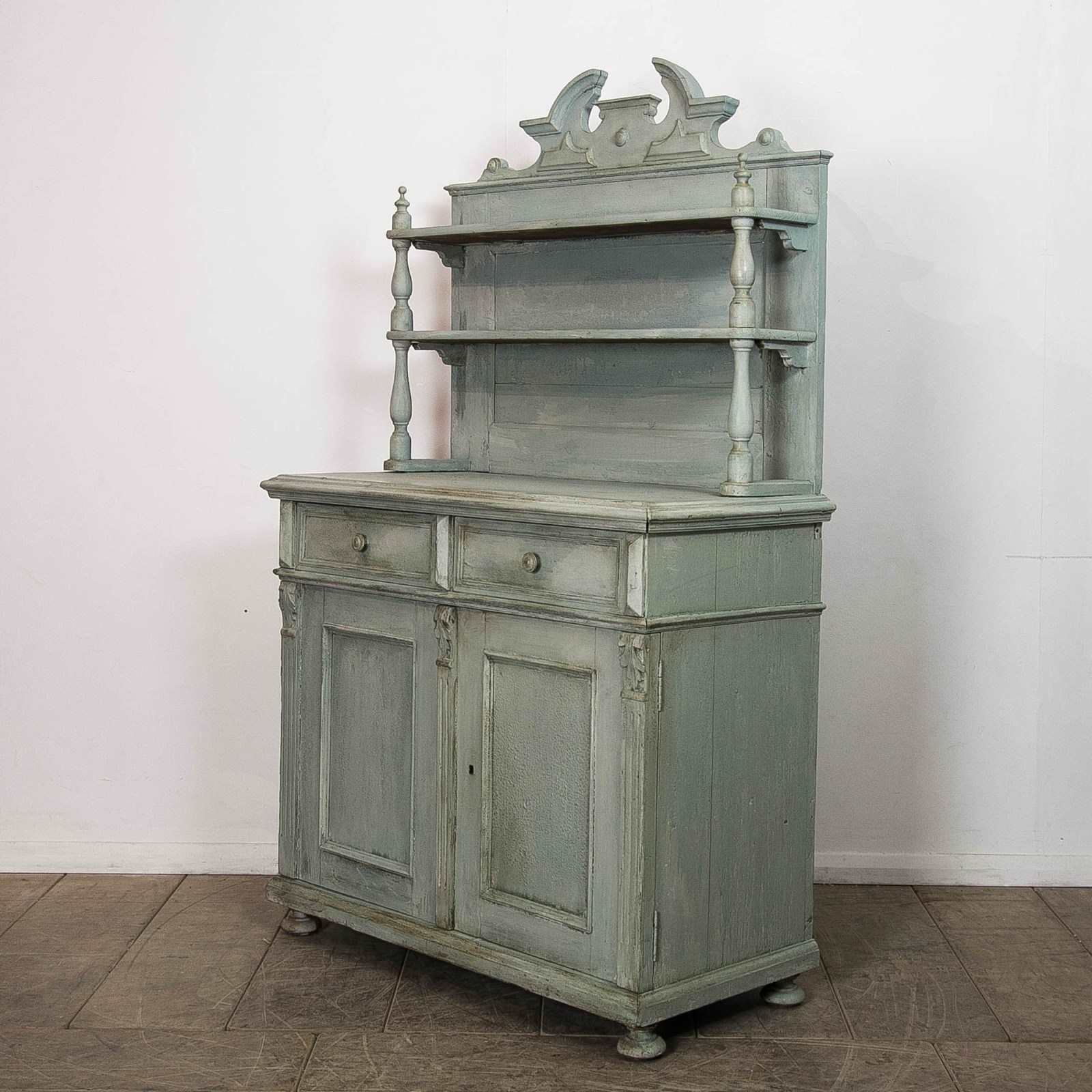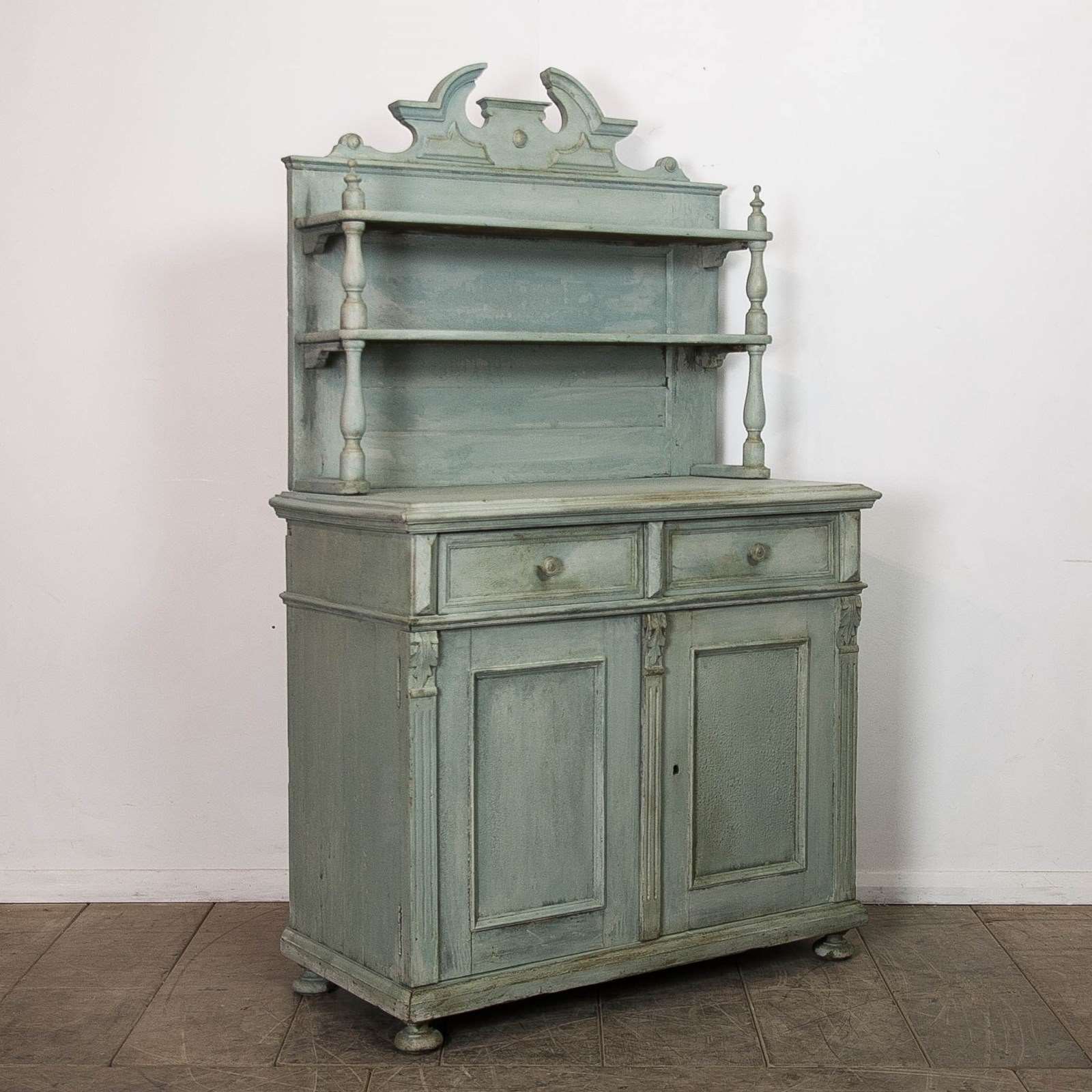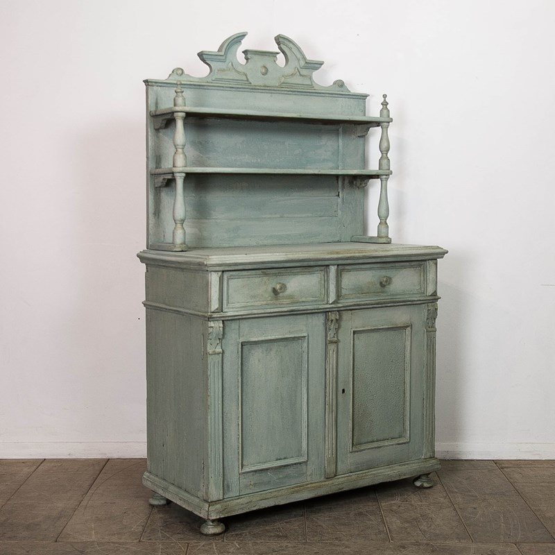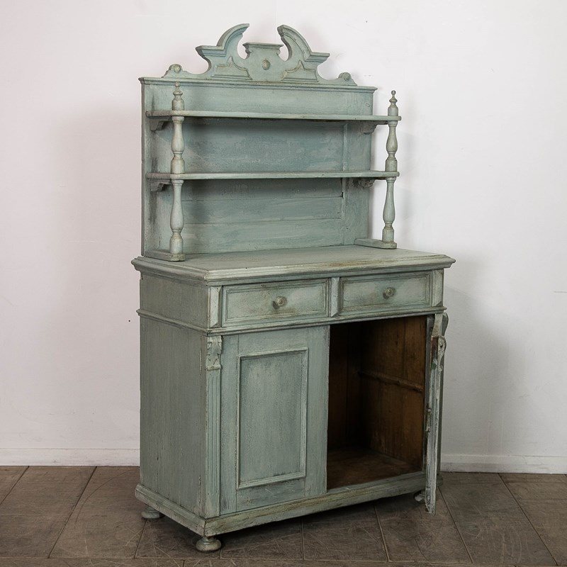 A painted pine, continental buffet/dresser. Consisting of 2 upper shelves above 2 drawers and a lower storage. Raised on bun feet