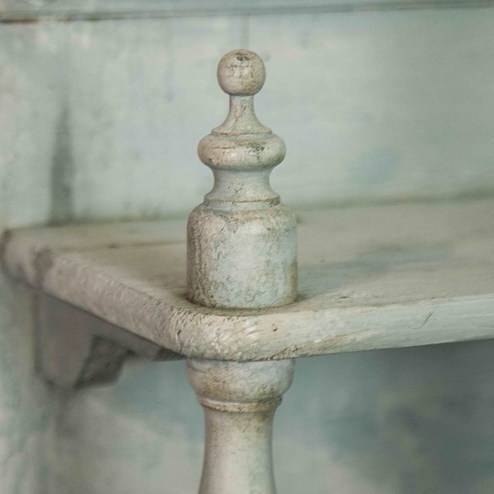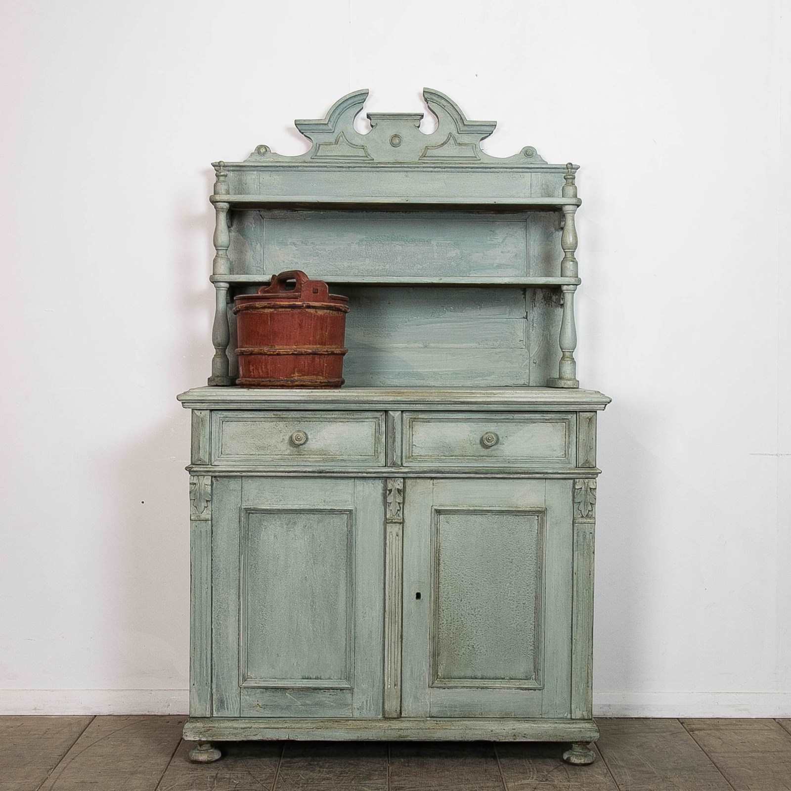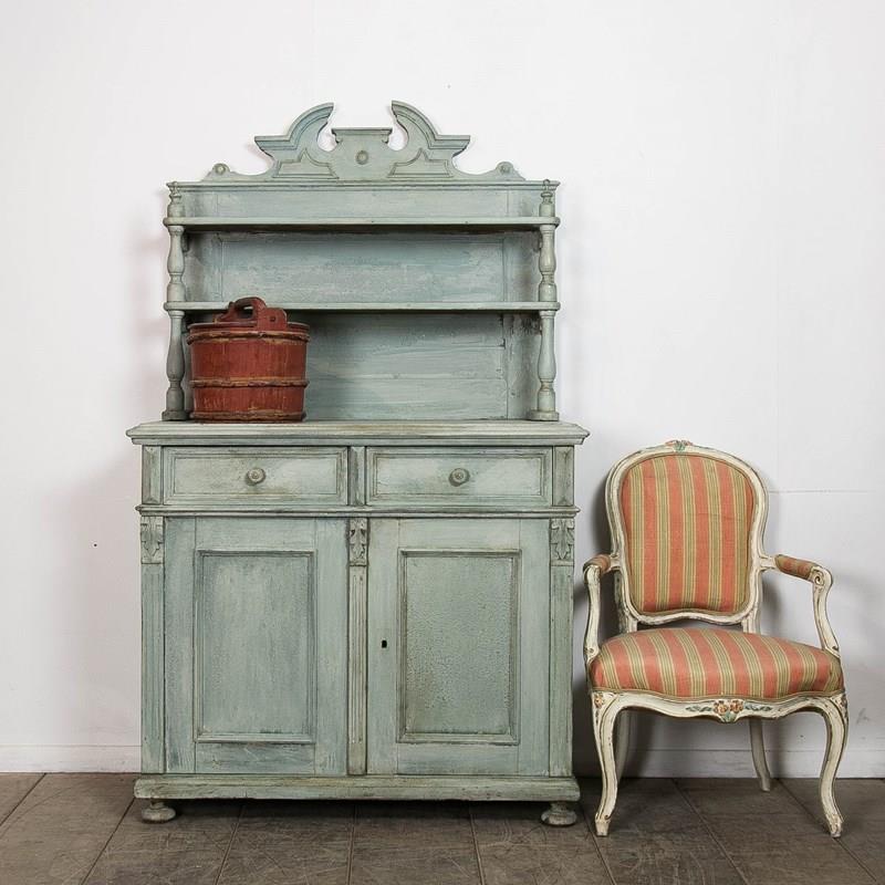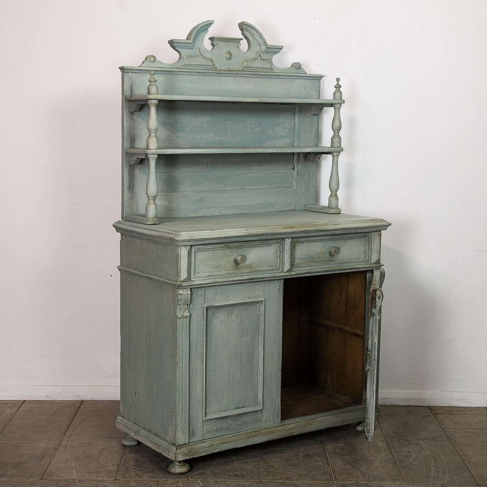 A painted pine, continental buffet/dresser. Consisting of 2 upper shelves above 2 drawers and a lower storage. Raised on bun feet