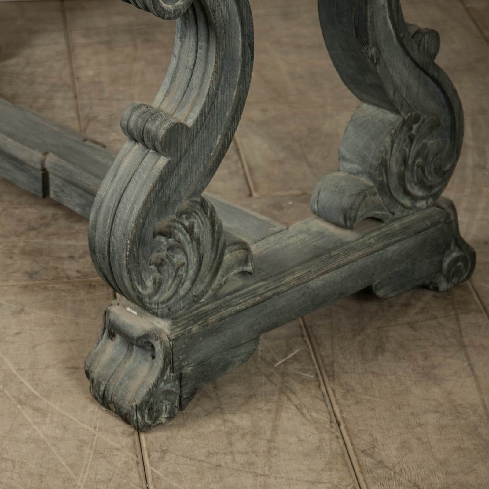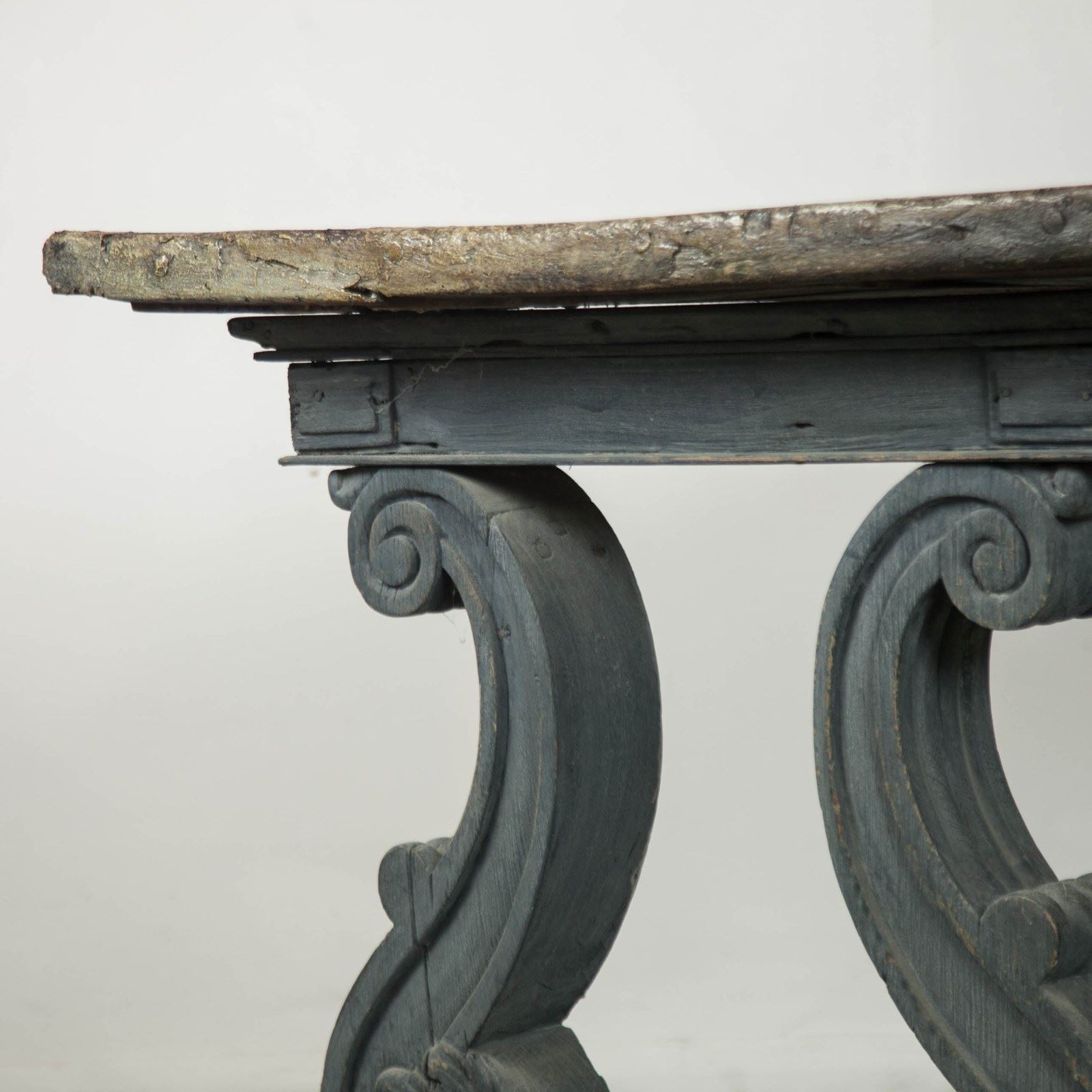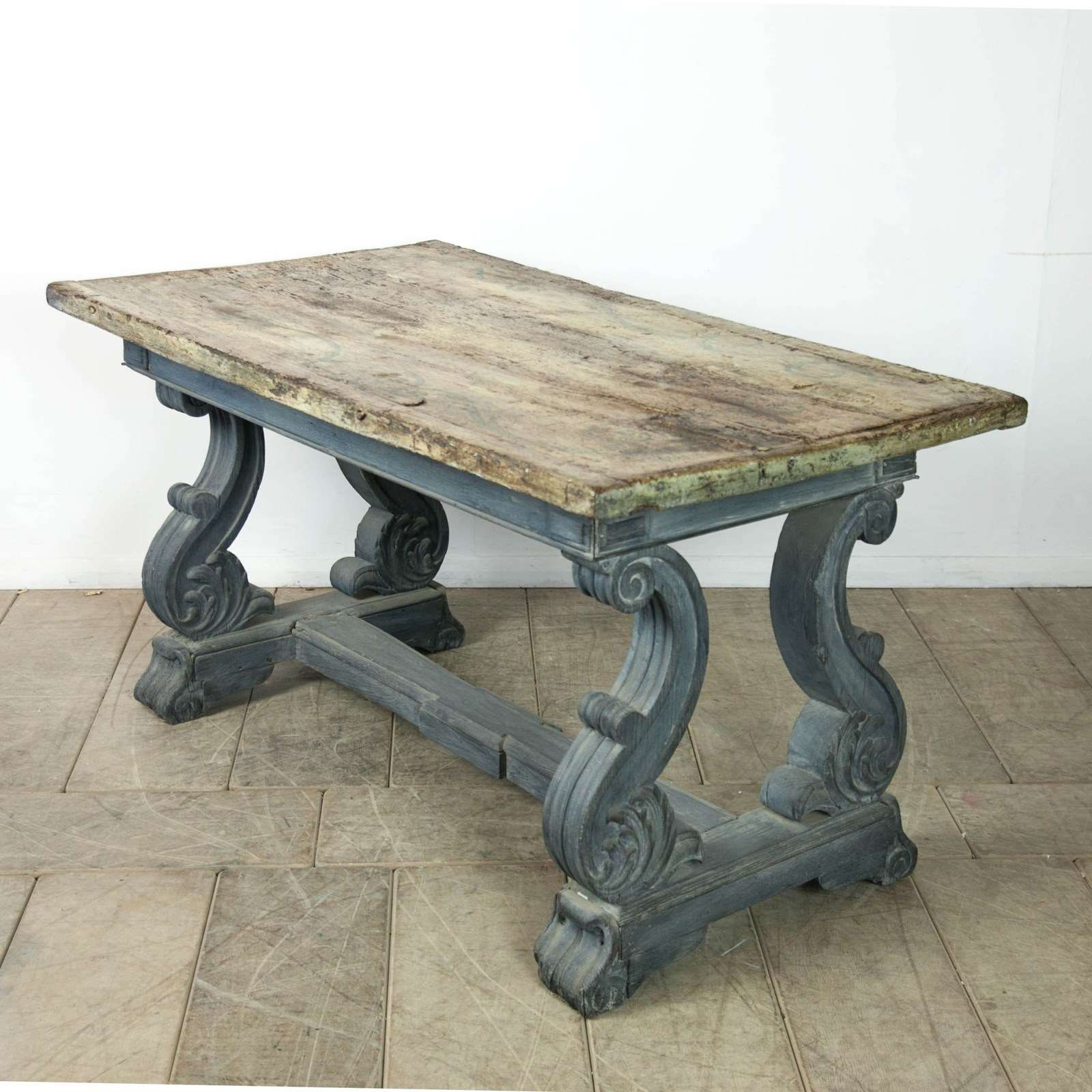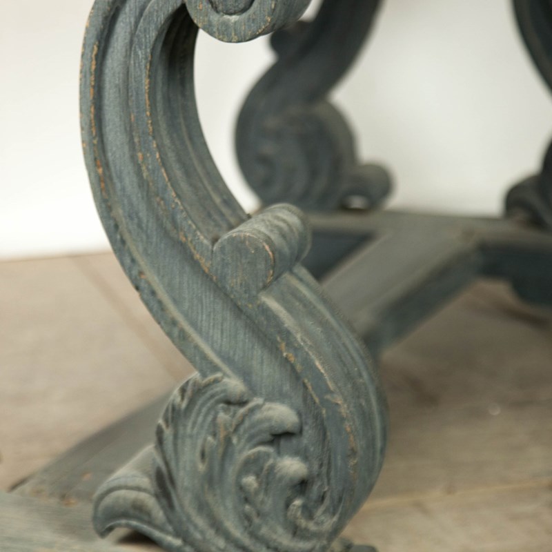 A rustic Tuscan centre table. Raised on carved legs with ascanthus leaf detail and scoll feet. Solid walnut painted top with painted scroll decoration.