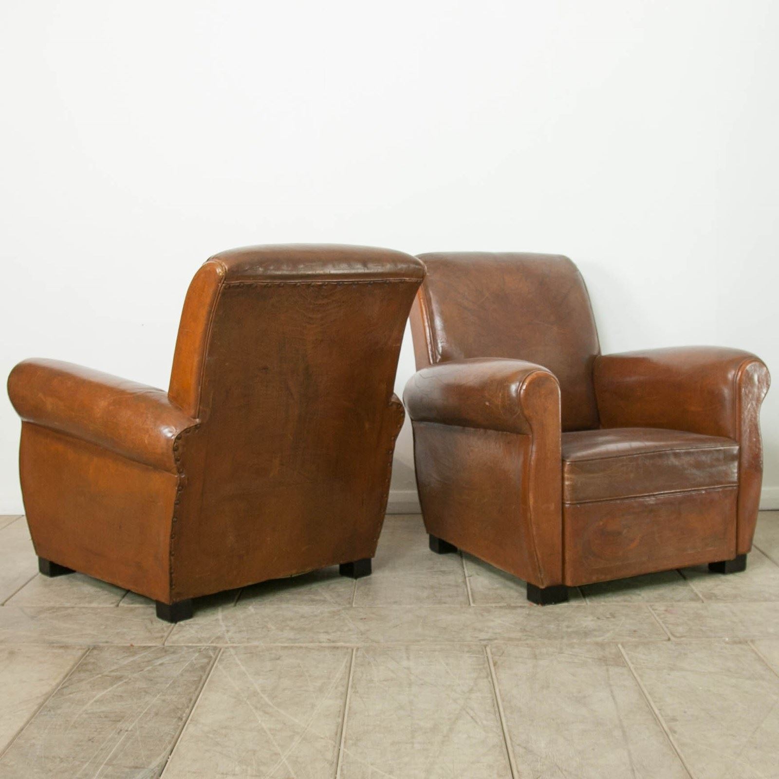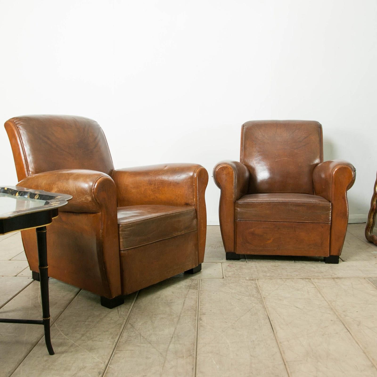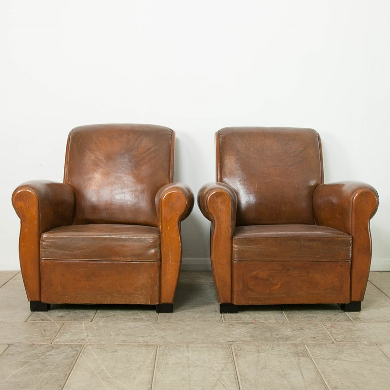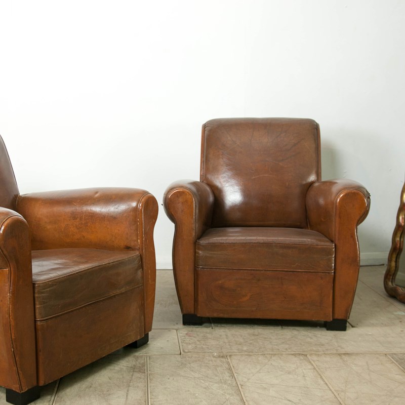 A good pair of French, leather club chairs. In very good order with ebonised block feet.