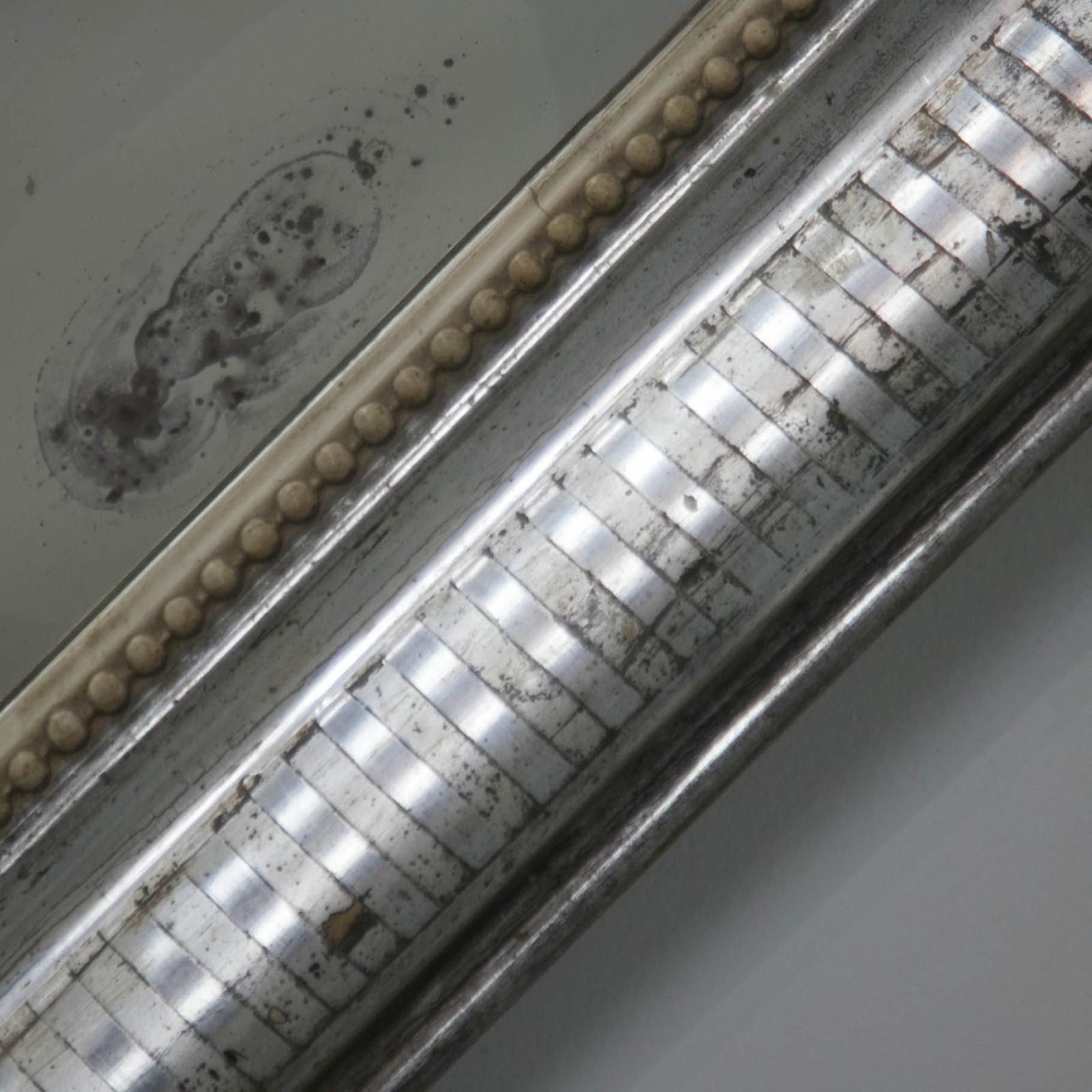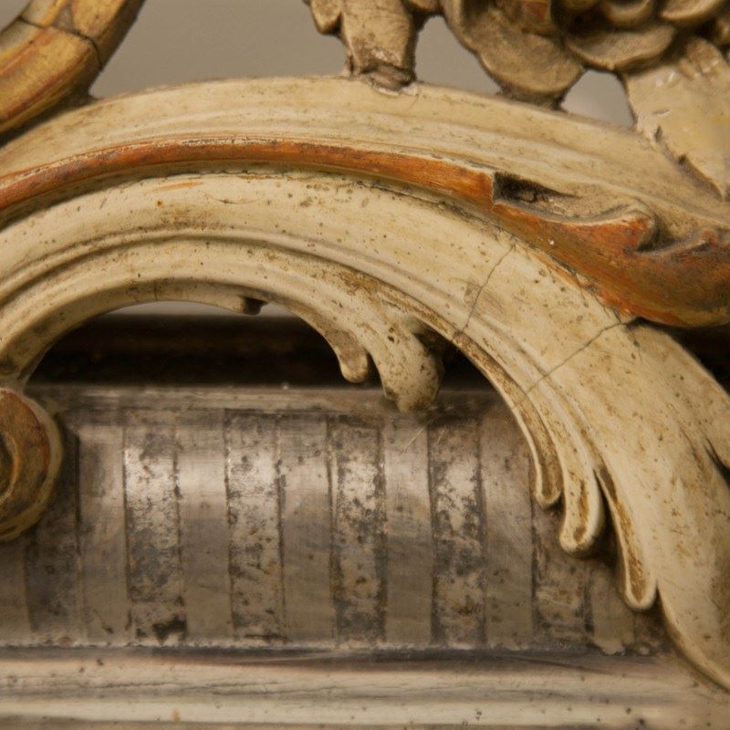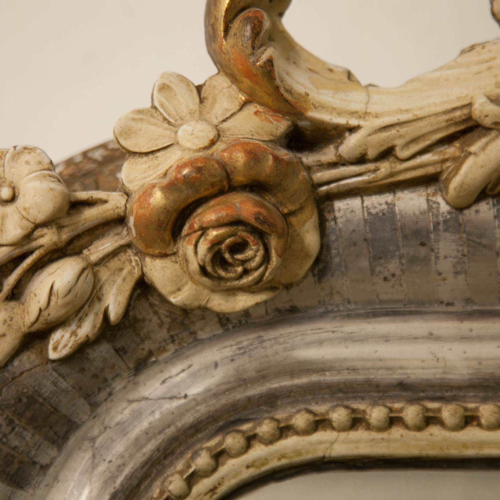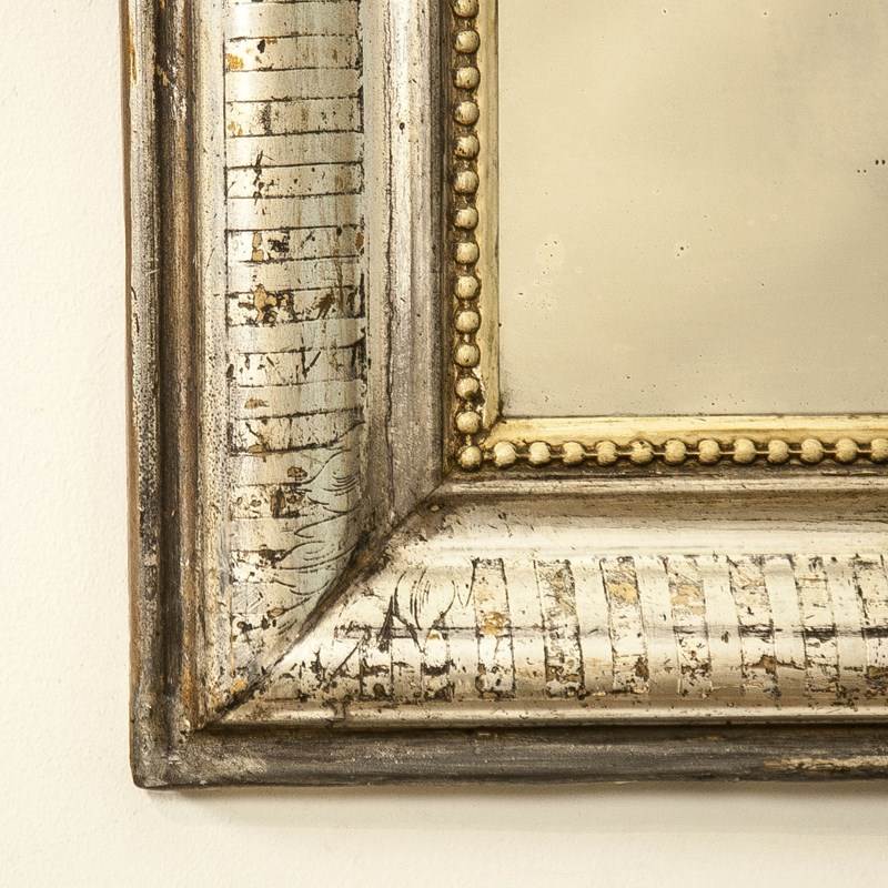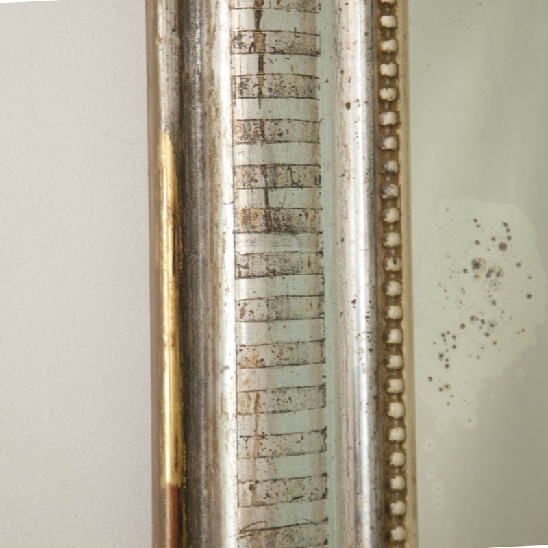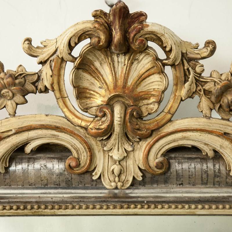 Silver leafed Louis Philippe mirror crested with a shell motif and swags and foliate decoration. Original mirror plate and backing.