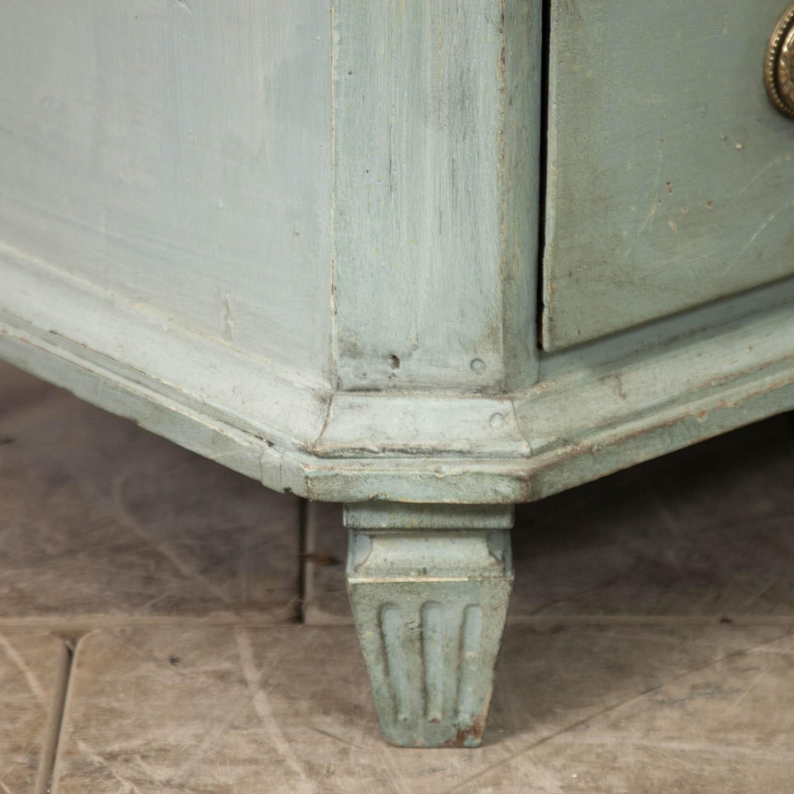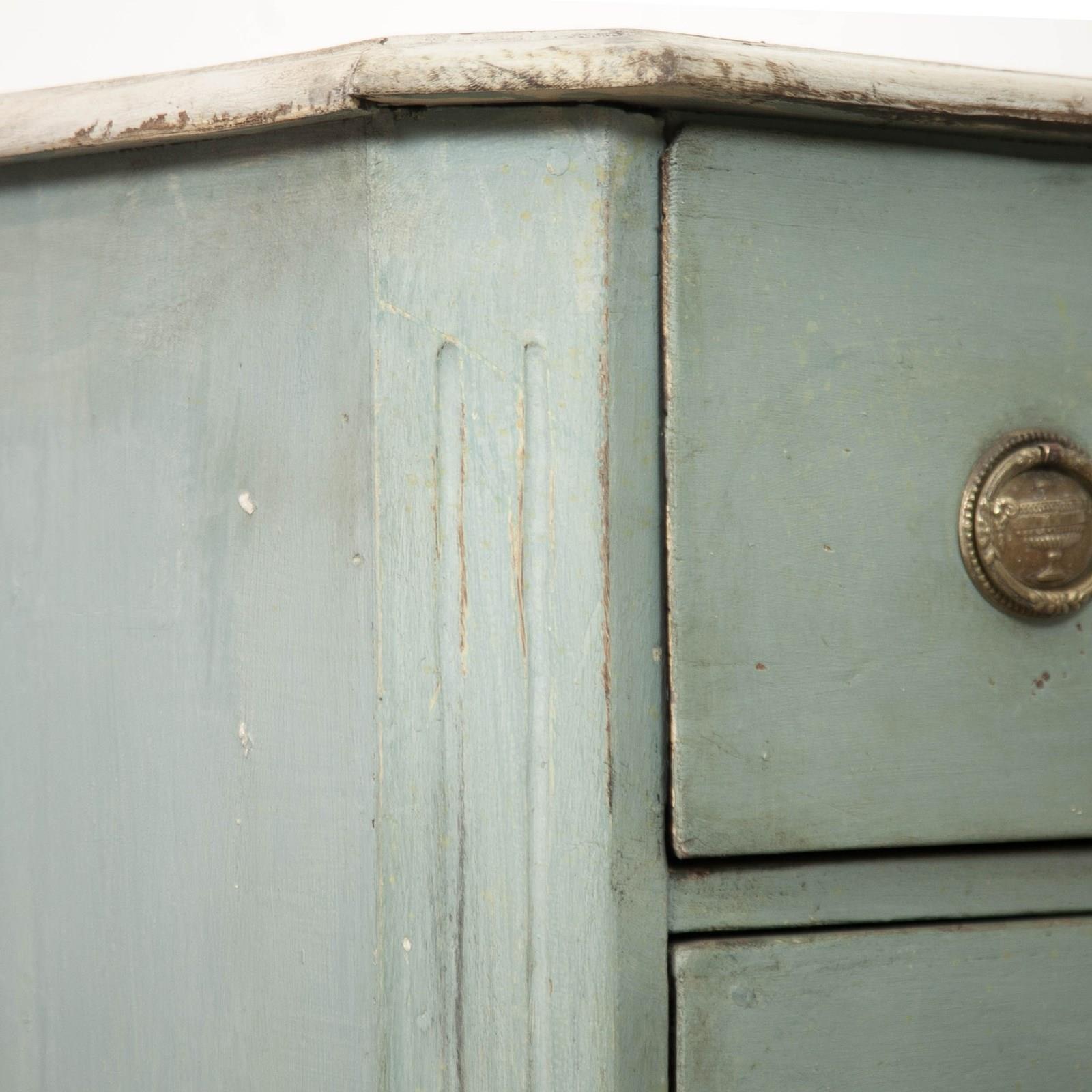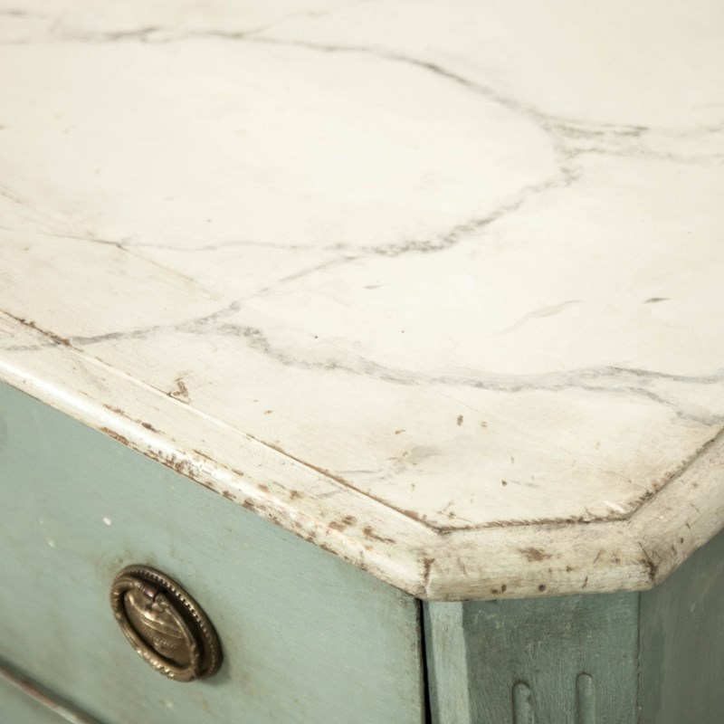 19th c Pine, Swedish commode. Comprising 3 long drawers, raised on short fluted feet, the body having canted corners with reeded detail. painted in a pale blue with a faux marble top.