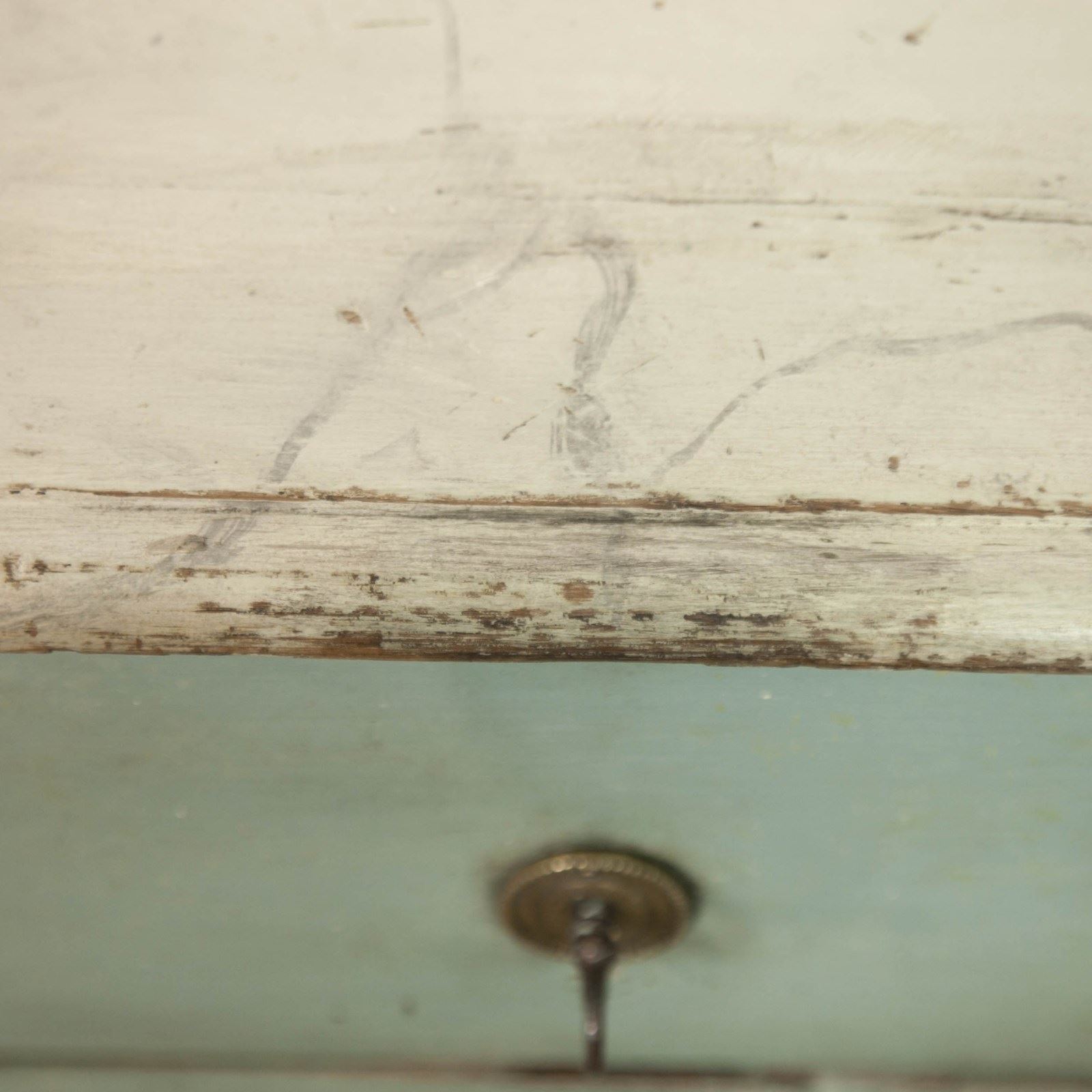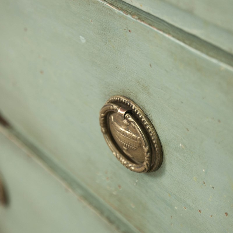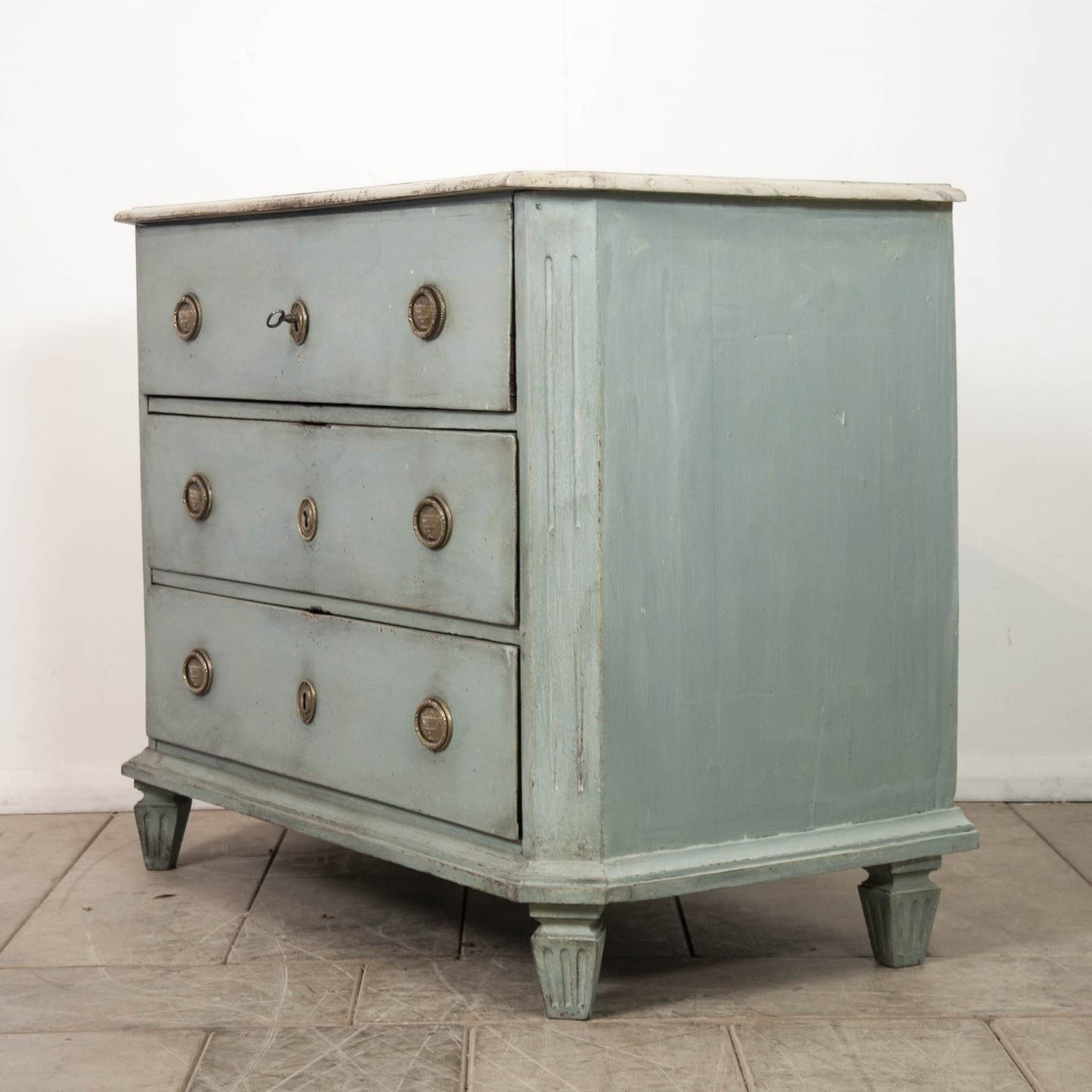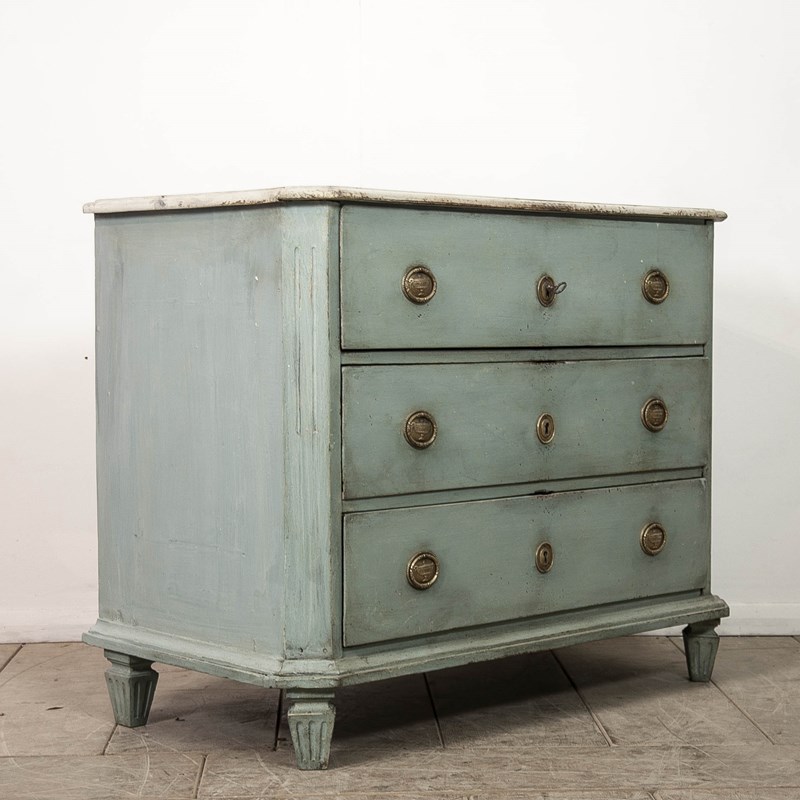 19th c Pine, Swedish commode. Comprising 3 long drawers, raised on short fluted feet, the body having canted corners with reeded detail. painted in a pale blue with a faux marble top.