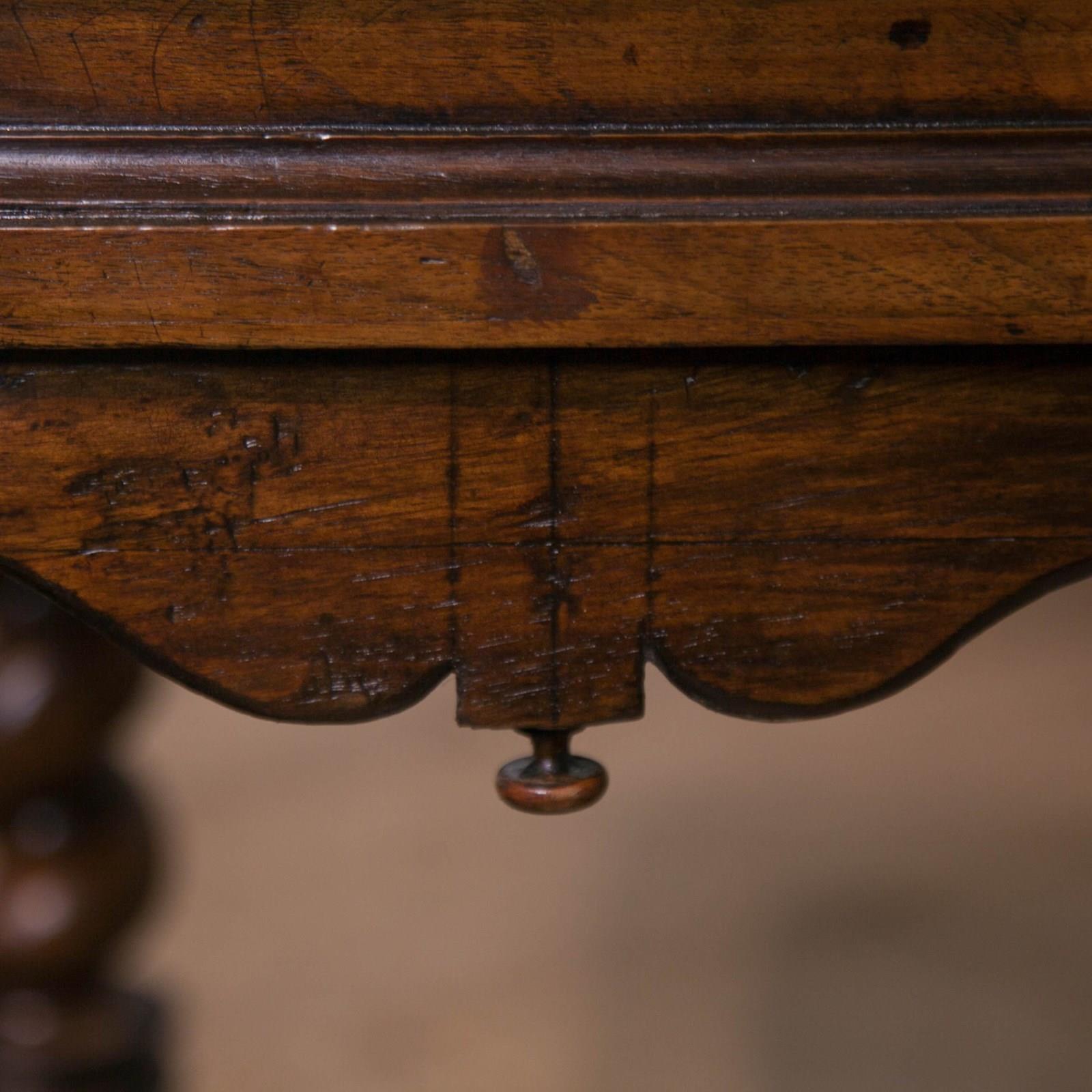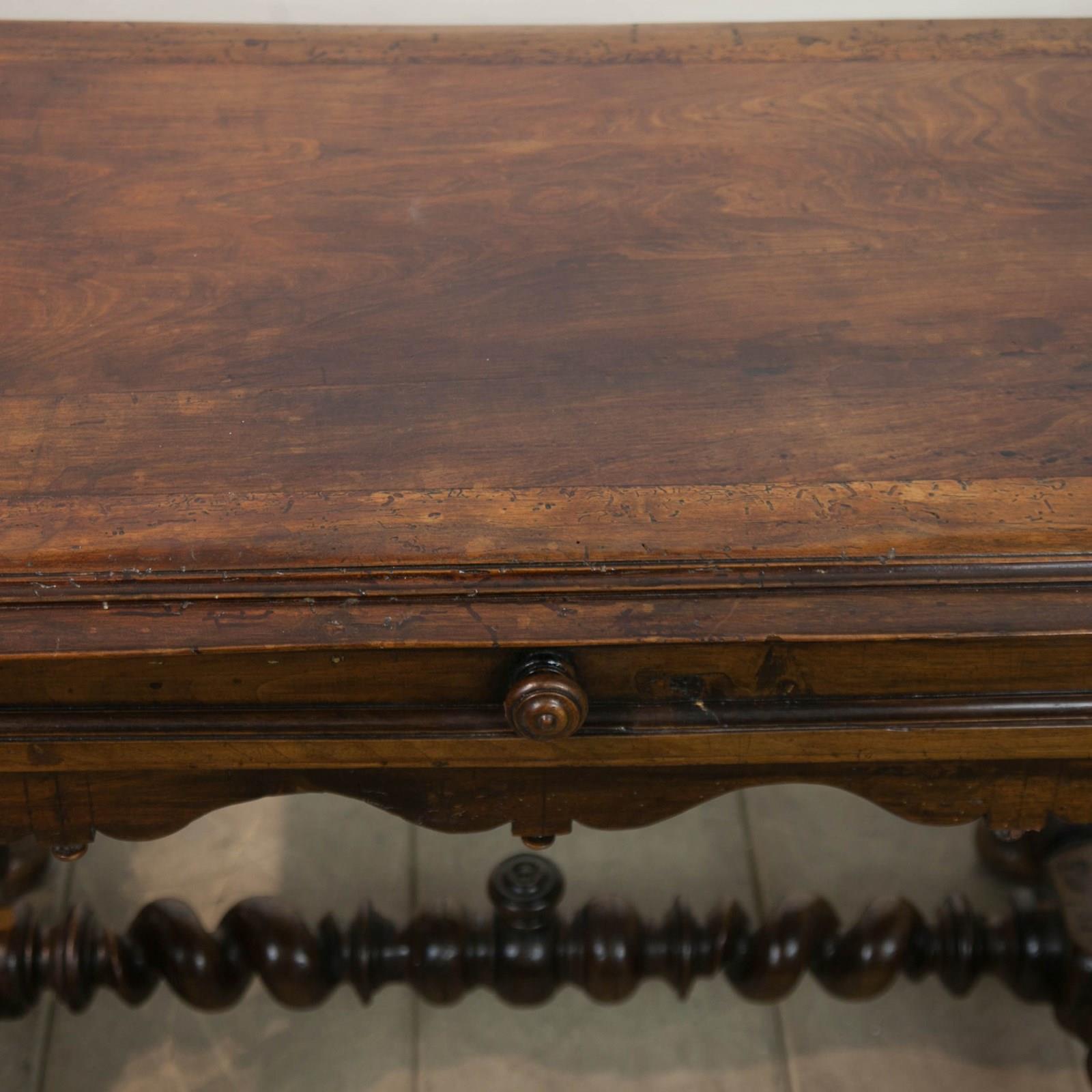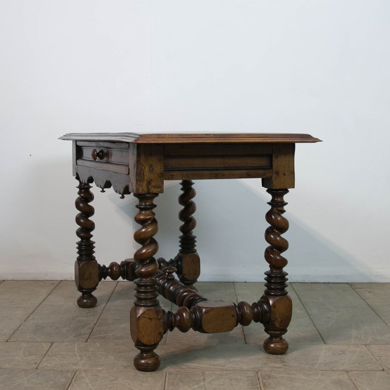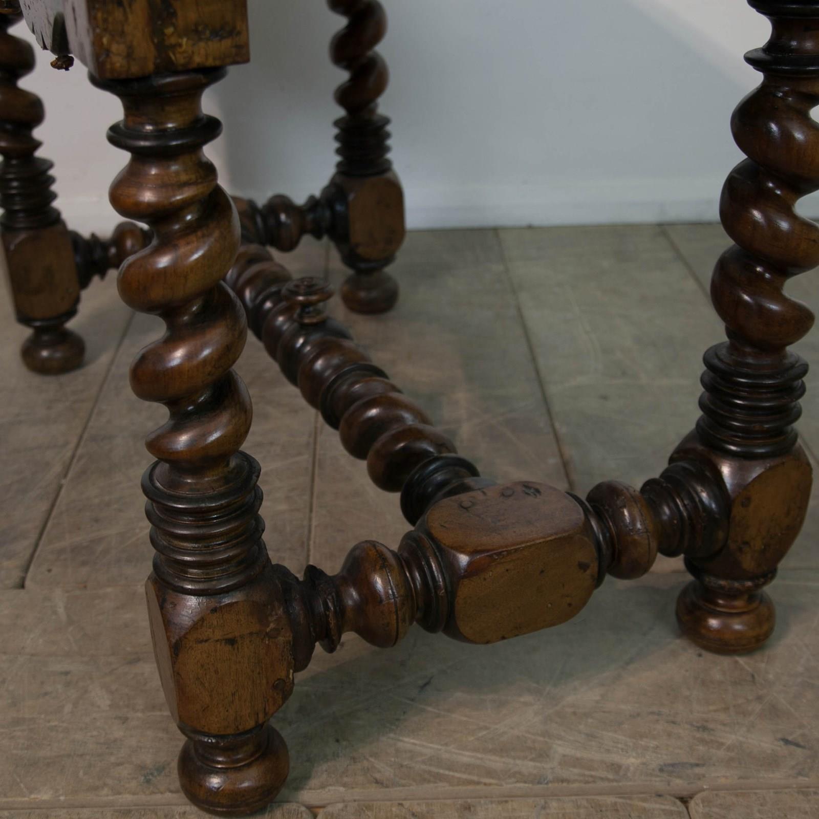 A French 17th century, Walnut side or console table. With robust, turned, barley twist legs raised on bun feet with barley twist stretchers. Having a single drawer with moulded detail and turned knob above a serpentine frieze with turned finials. The top constructed from cleated walnut planks.