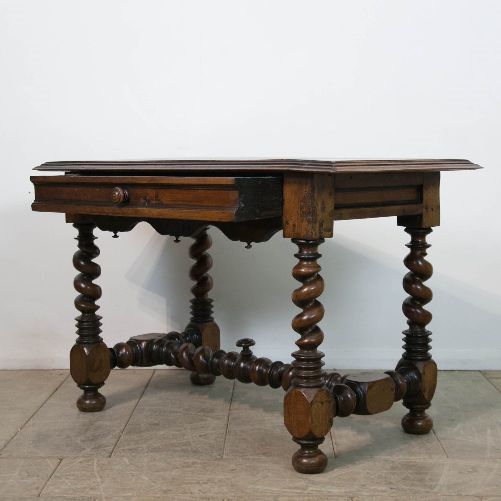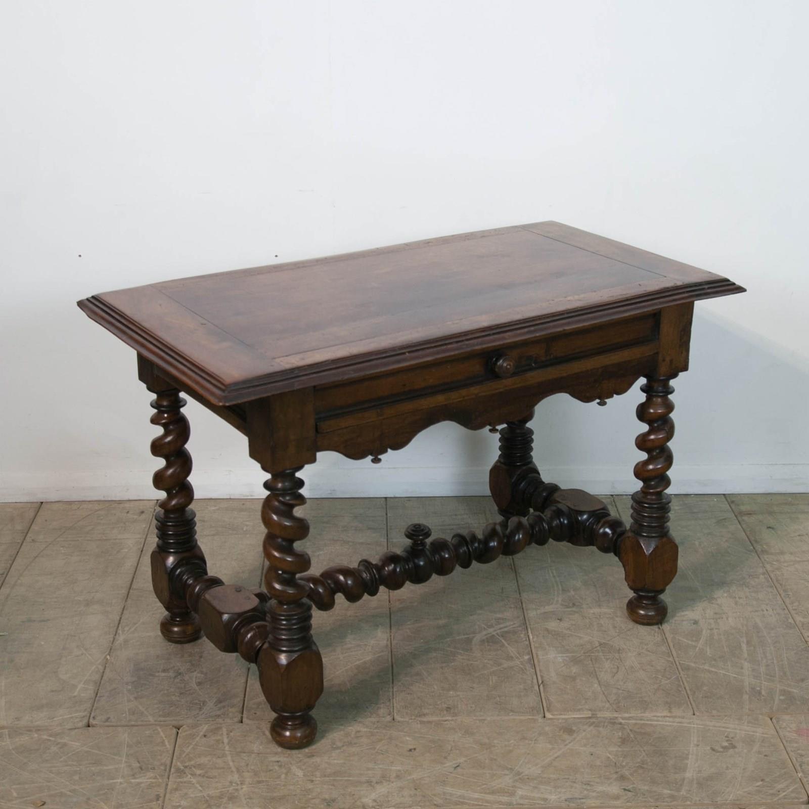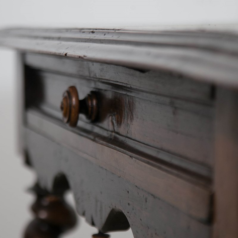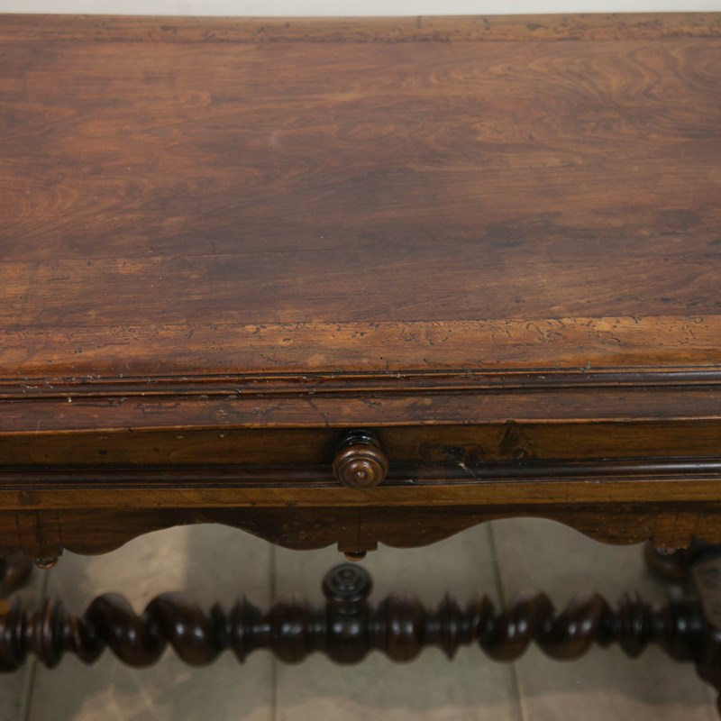A French 17th century, Walnut side or console table. With robust, turned, barley twist legs raised on bun feet with barley twist stretchers. Having a single drawer with moulded detail and turned knob above a serpentine frieze with turned finials. The top constructed from cleated walnut planks.