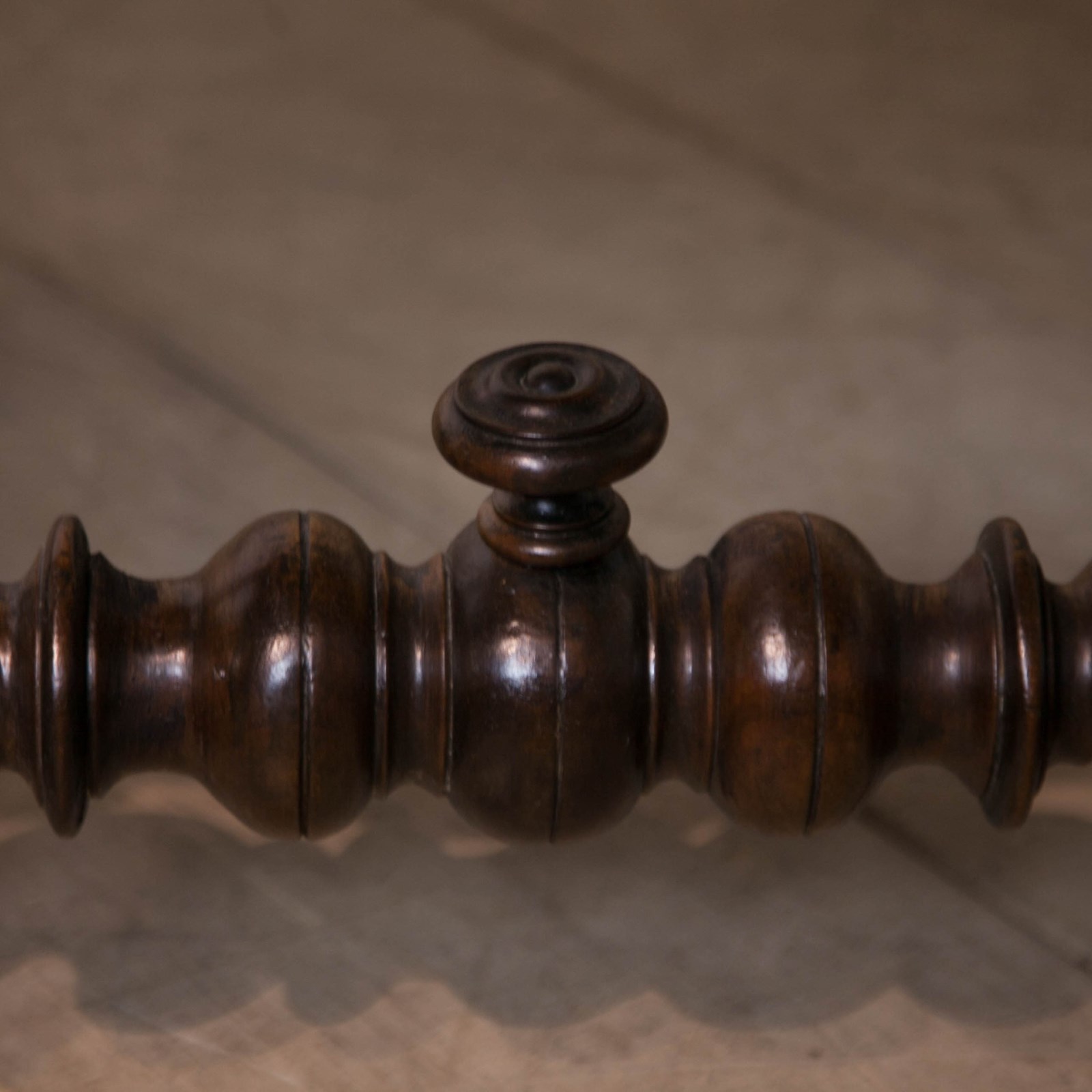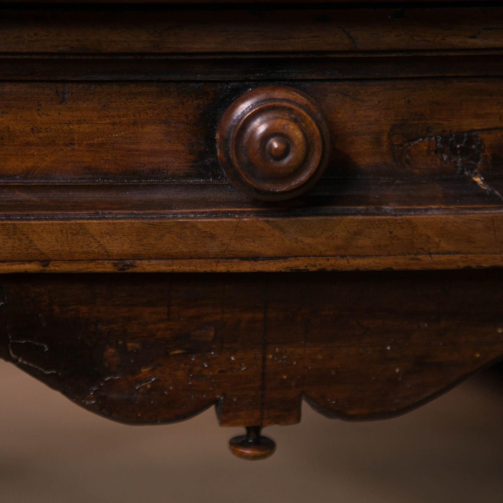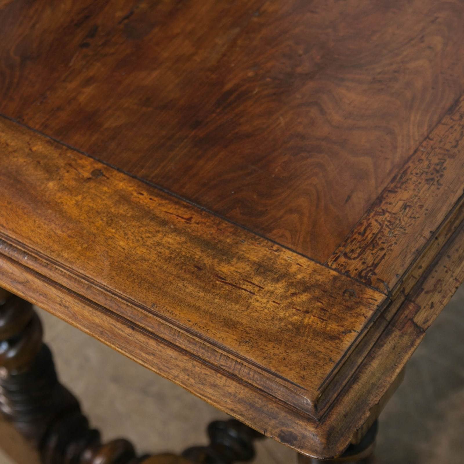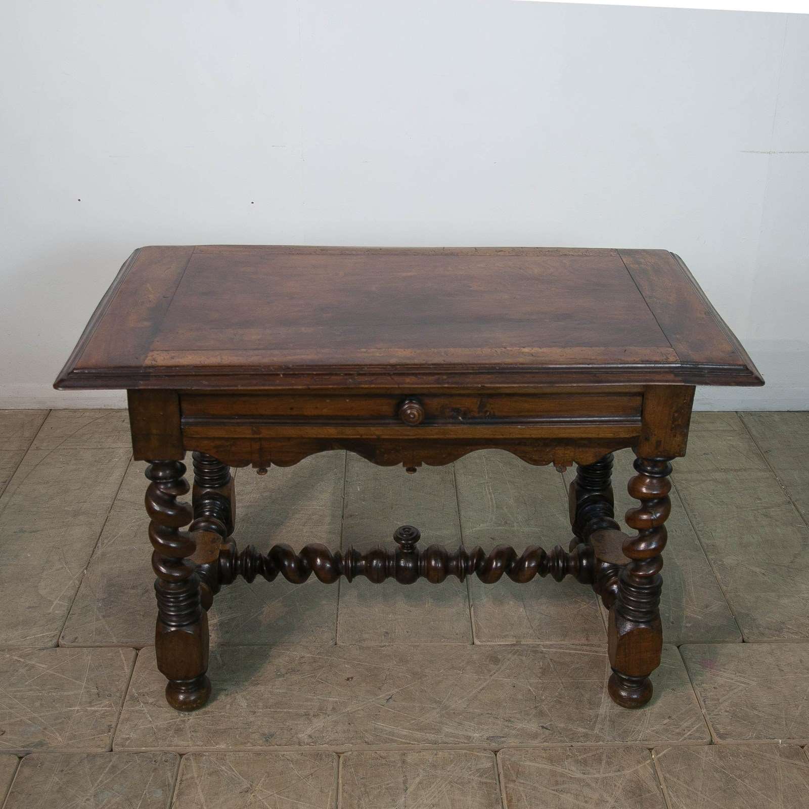 A French 17th century, Walnut side or console table. With robust, turned, barley twist legs raised on bun feet with barley twist stretchers. Having a single drawer with moulded detail and turned knob above a serpentine frieze with turned finials. The top constructed from cleated walnut planks.
