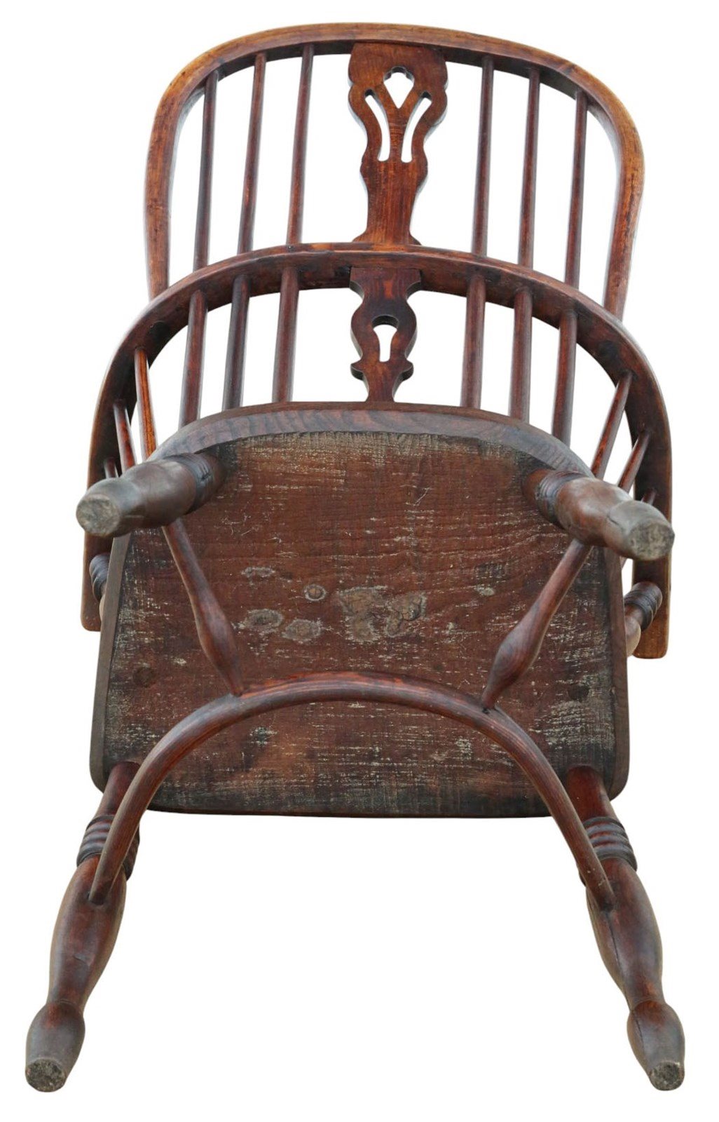 An antique 19th-century Windsor armchair crafted from ash and elm, full of age, character, and patina. This original English country chair is a fine example of traditional craftsmanship, structurally sound and practical for everyday use, while also serving as a decorative statement piece with timeless charm. A rare antique Windsor armchair that would suit a dining room, study, or period-inspired interior.