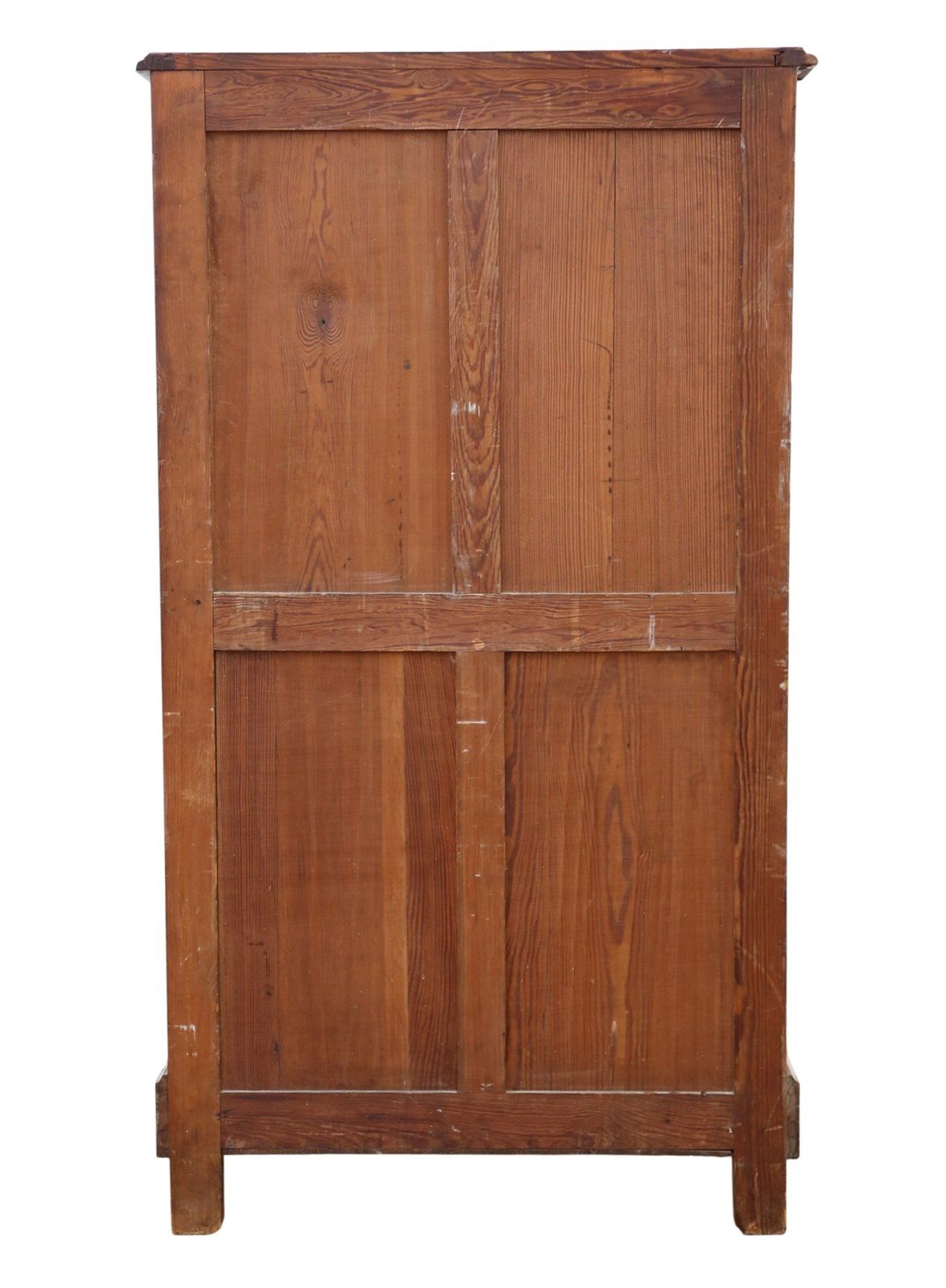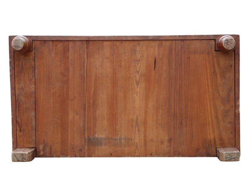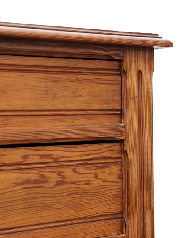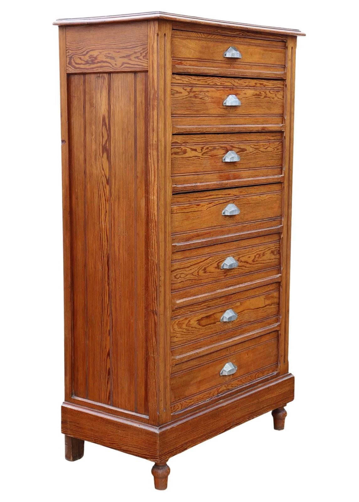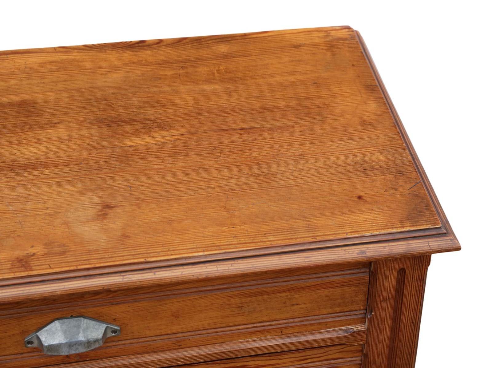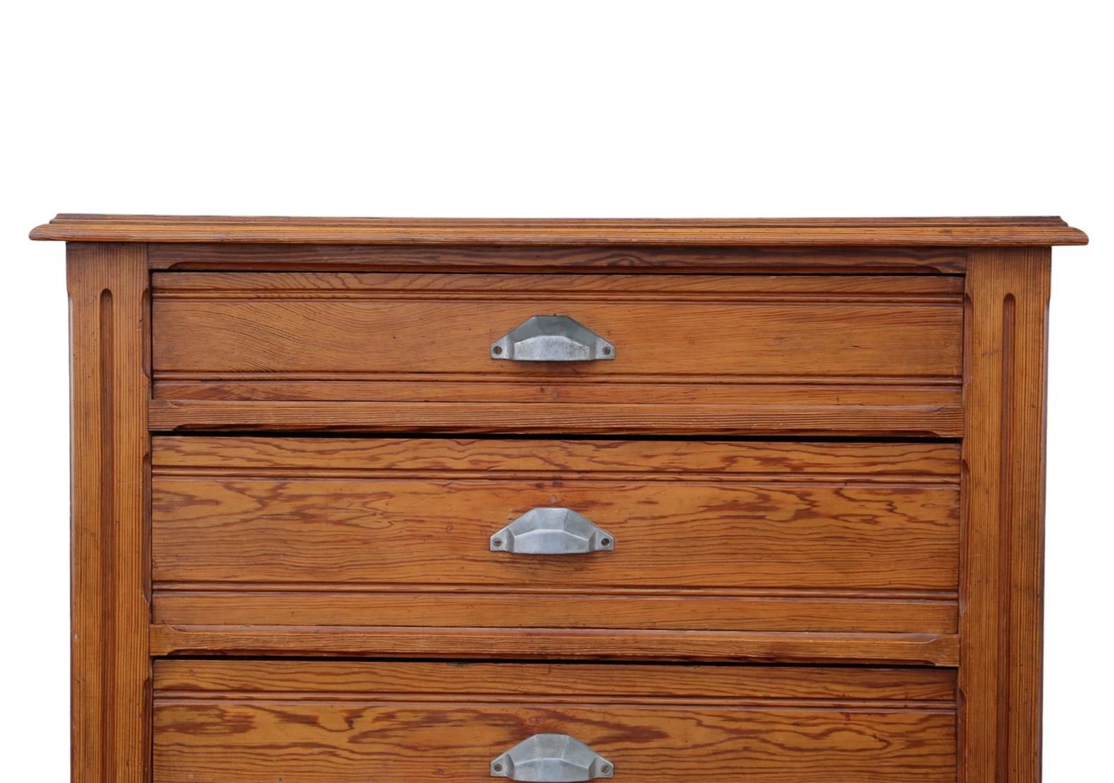 A substantial c.1900 pitch pine chest of drawers, full of lovely age, colour, and patina. While this rare decorative find offers a highly practical, capacious design that is rich in charm and character, it makes a wonderful practical and aesthetic addition to the right setting. Its simple yet robust construction gives it strong period presence and everyday usability.