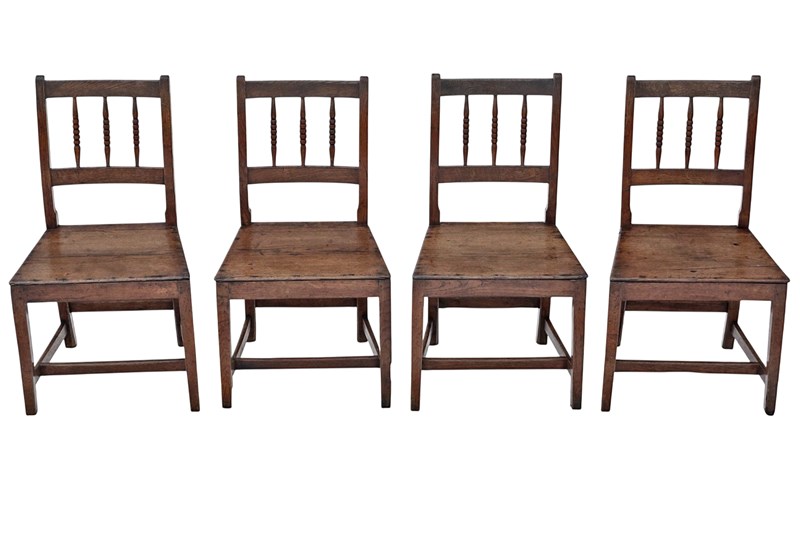 A brilliant opportunity to acquire this set of four fine-quality 18th-century oak dining chairs that combine timeless charm with everyday usability.