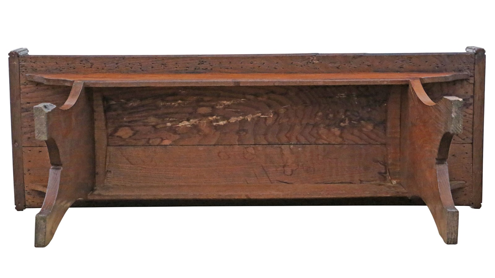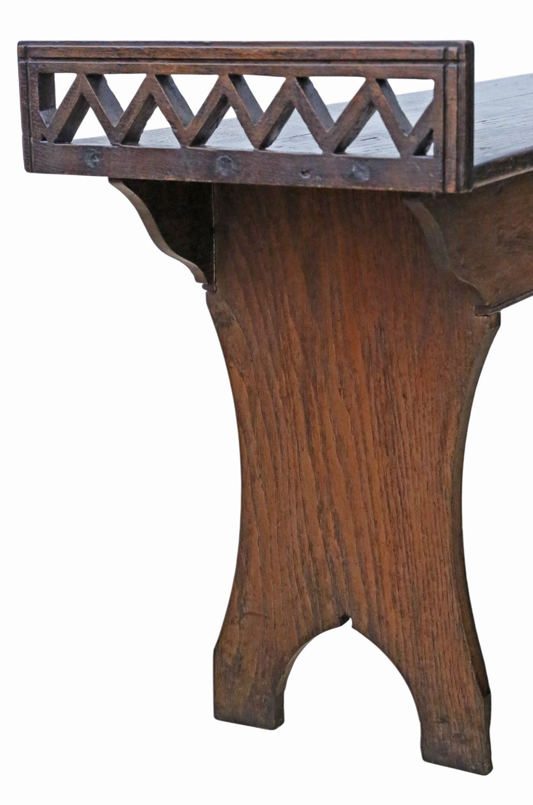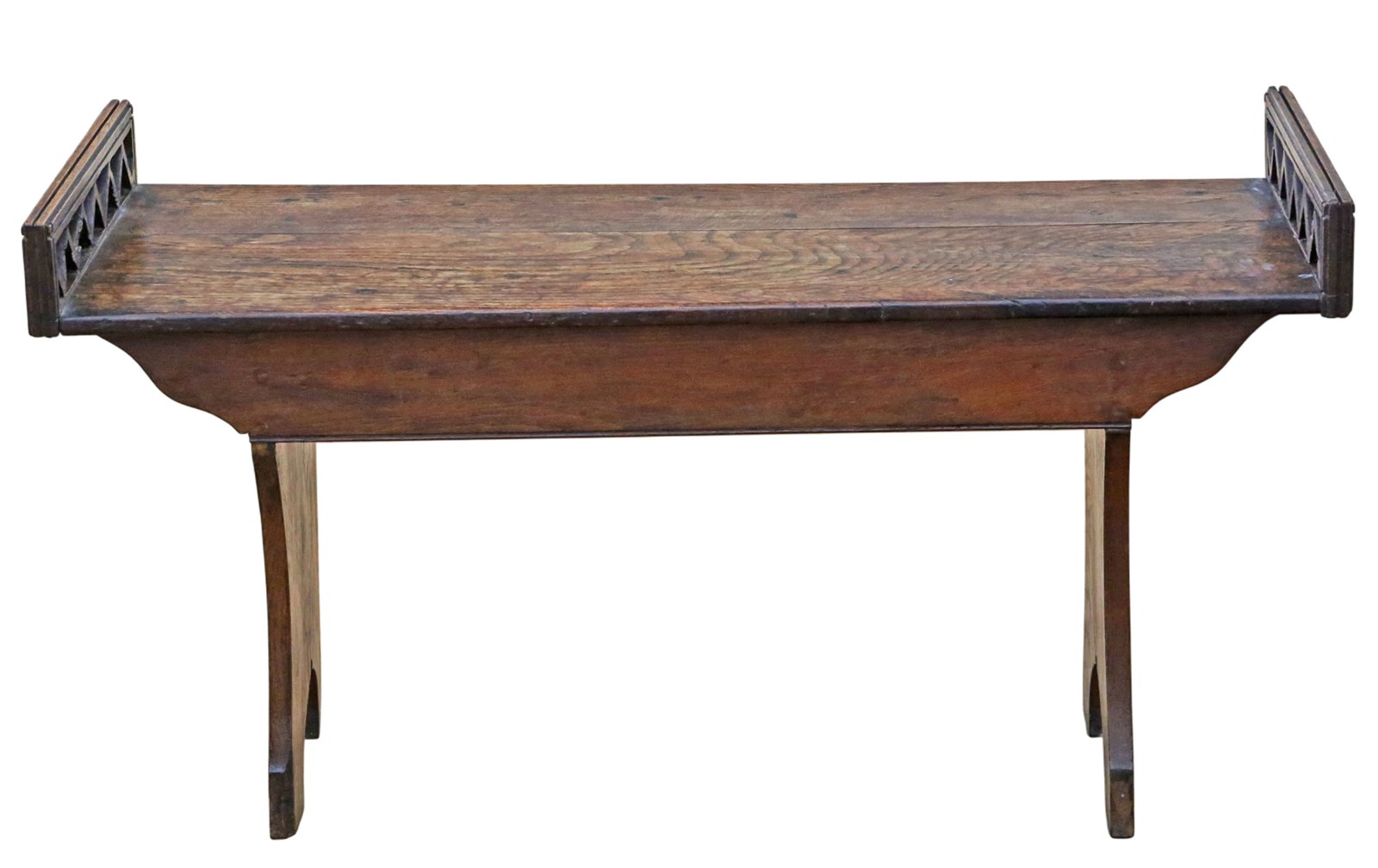 This fine quality late 19th Century window seat is a rare decorative find that emanates charm and character. Its attractive age, colour, and patina give it a warm, rustic presence that make it a striking addition to any period, country, or contemporary interior. The seat features lovely fret-cut chunky ends, showcasing the craftsmanship of the period.
