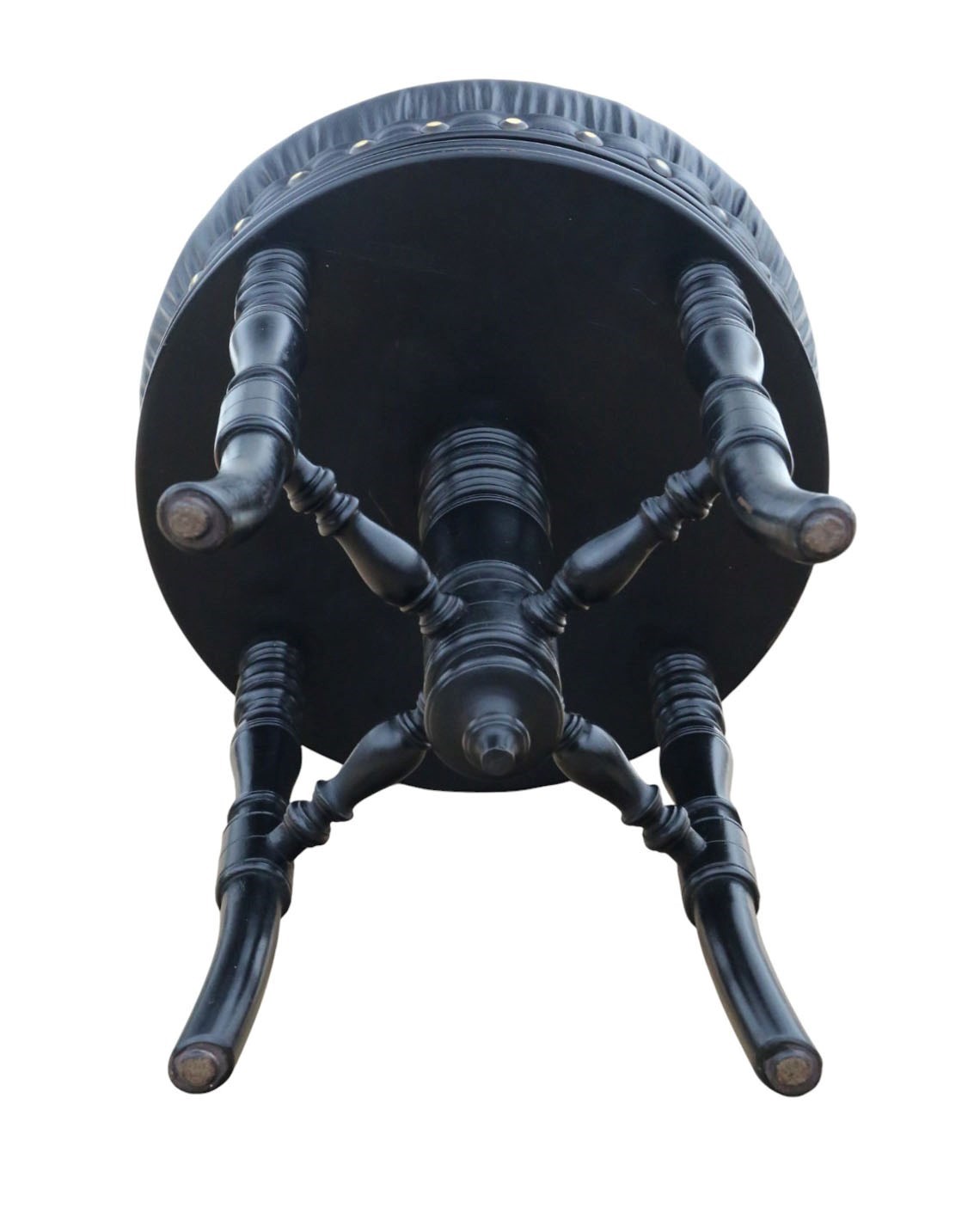 A rare decorative find, this 19th-century ebonised mahogany piano stool is full of age, colour, and patina. Featuring an adjustable revolving mechanism and a recently replaced high-quality leather/leatherette seat, it is structurally sound and practical for everyday use. It also serves as an elegant addition to a music room, study, or stylish interior.