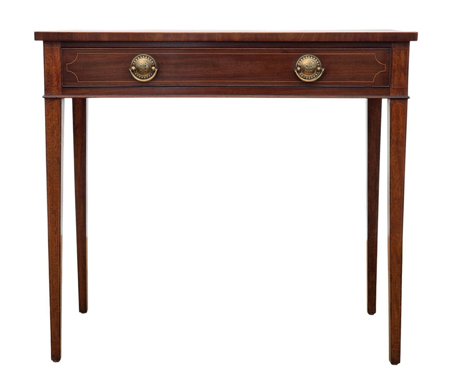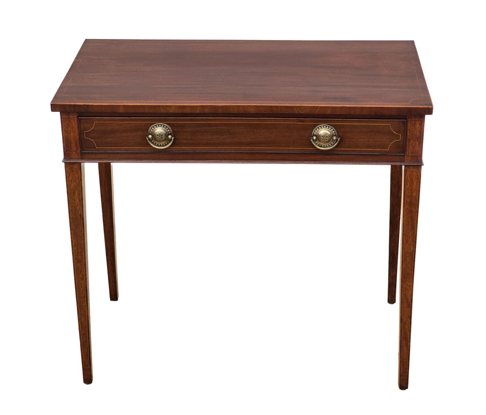 A fine-quality 19th-century inlaid mahogany writing or dressing table that is full of charm and character. This rare decorative find features beautiful boxwood line inlays that accent its simple, elegant lines. Rich with age, colour and patina, this table would make an ideal statement piece in a study, office, or period interior.