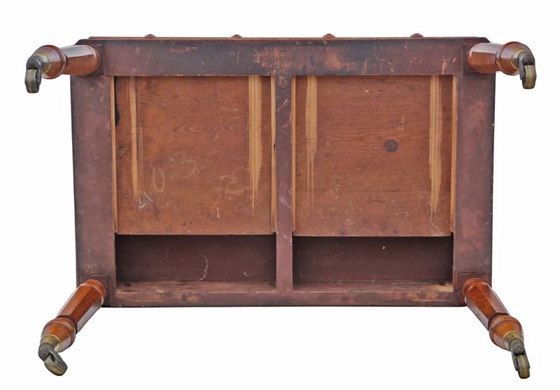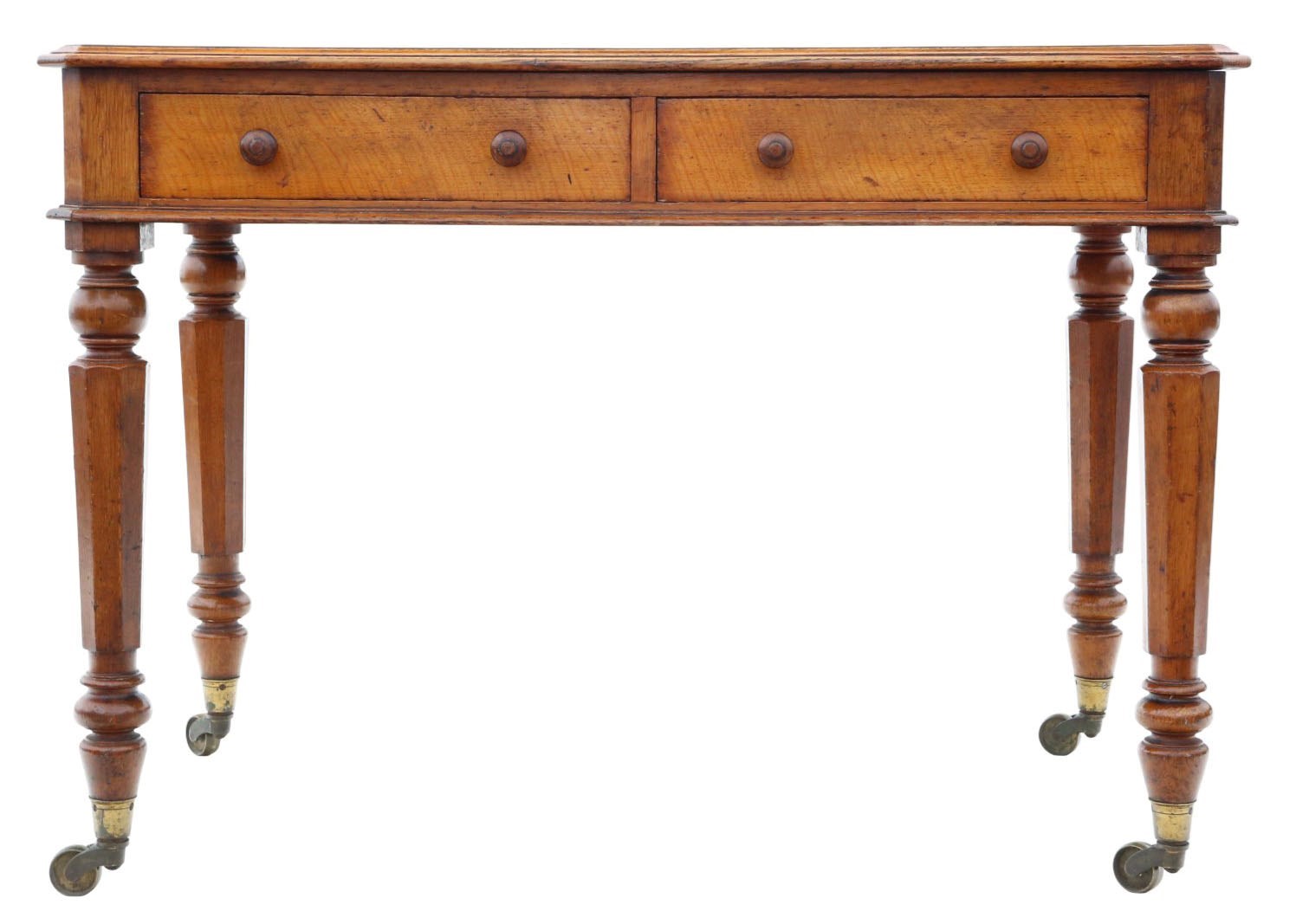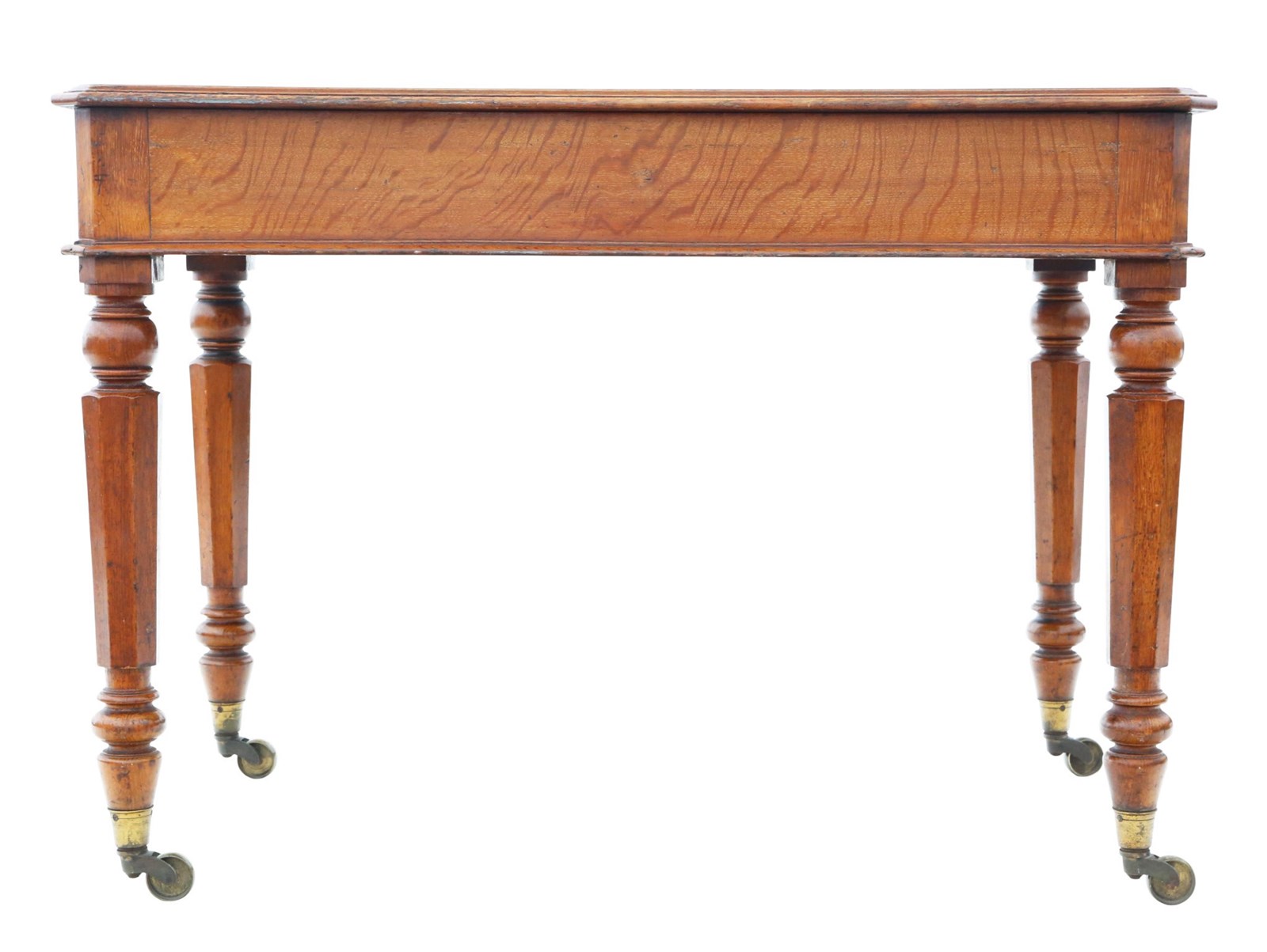 A rare decorative find featuring tapered octagonal legs on large period brass castors and a later fabricated tooled leather skiver. This c.1880 oak writing desk is full of age, character, and charm, with a lovely colour and patina that makes it a practical and attractive statement piece ideal for studies, offices, or period-inspired interiors.