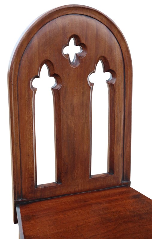 An antique 19th Century pair of mahogany Gothic hall chairs, full of age, character, and patina. These original English chairs are fine examples of traditional craftsmanship, structurally sound and practical for everyday use, while also serving as a decorative statement piece with timeless charm. A rare pair of antique hall chairs that would suit a hallway, bedroom, dining room, study, or period-inspired interior.