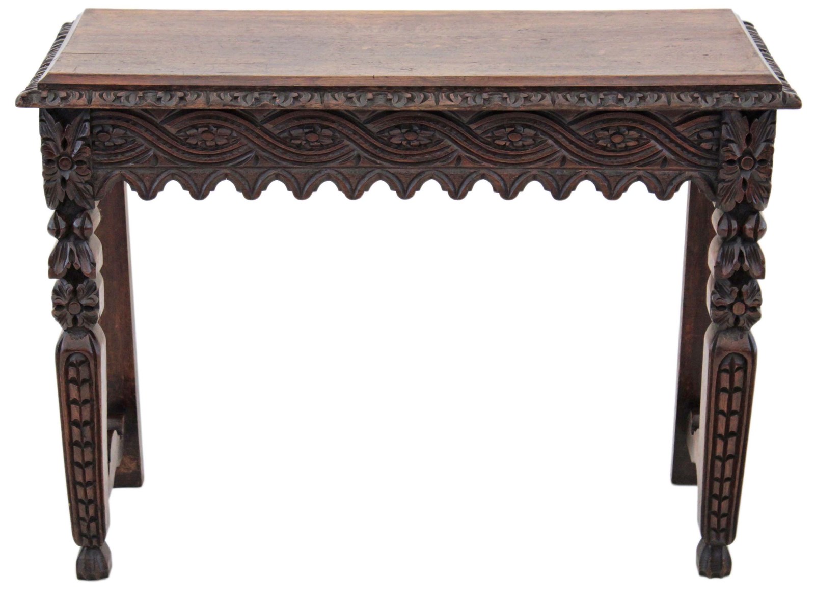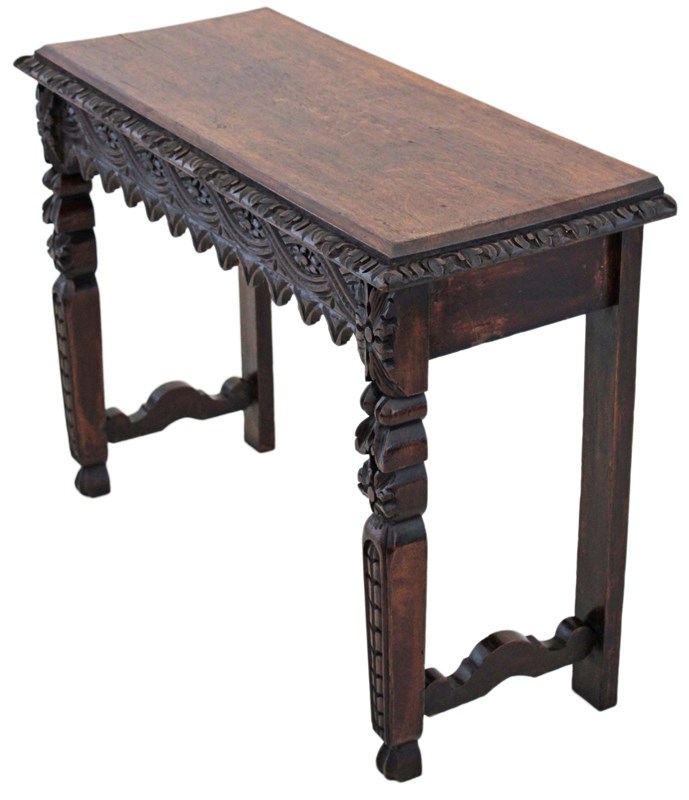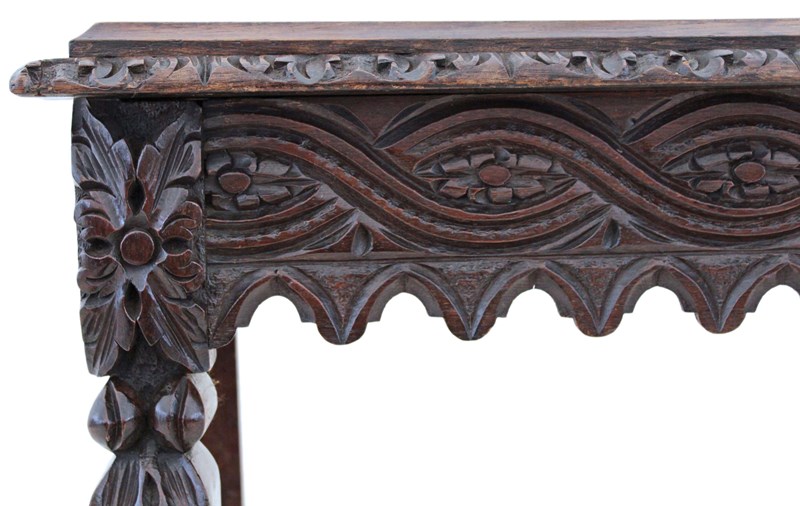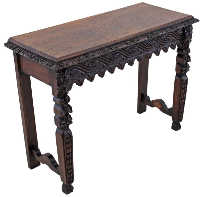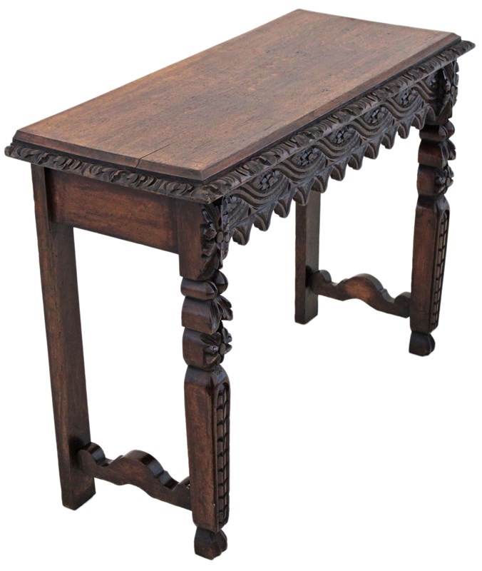 A striking 19th-century Victorian oak writing table, richly carved and full of charm and character. This is a particularly unusual and quite rare piece, showcasing bold craftsmanship and a strong sense of period style. The table has a wonderful colour, age, and patina, making it a standout decorative and practical addition to the right setting. With its versatile use as a hall, side, or writing table, it offers both beauty and functionality.