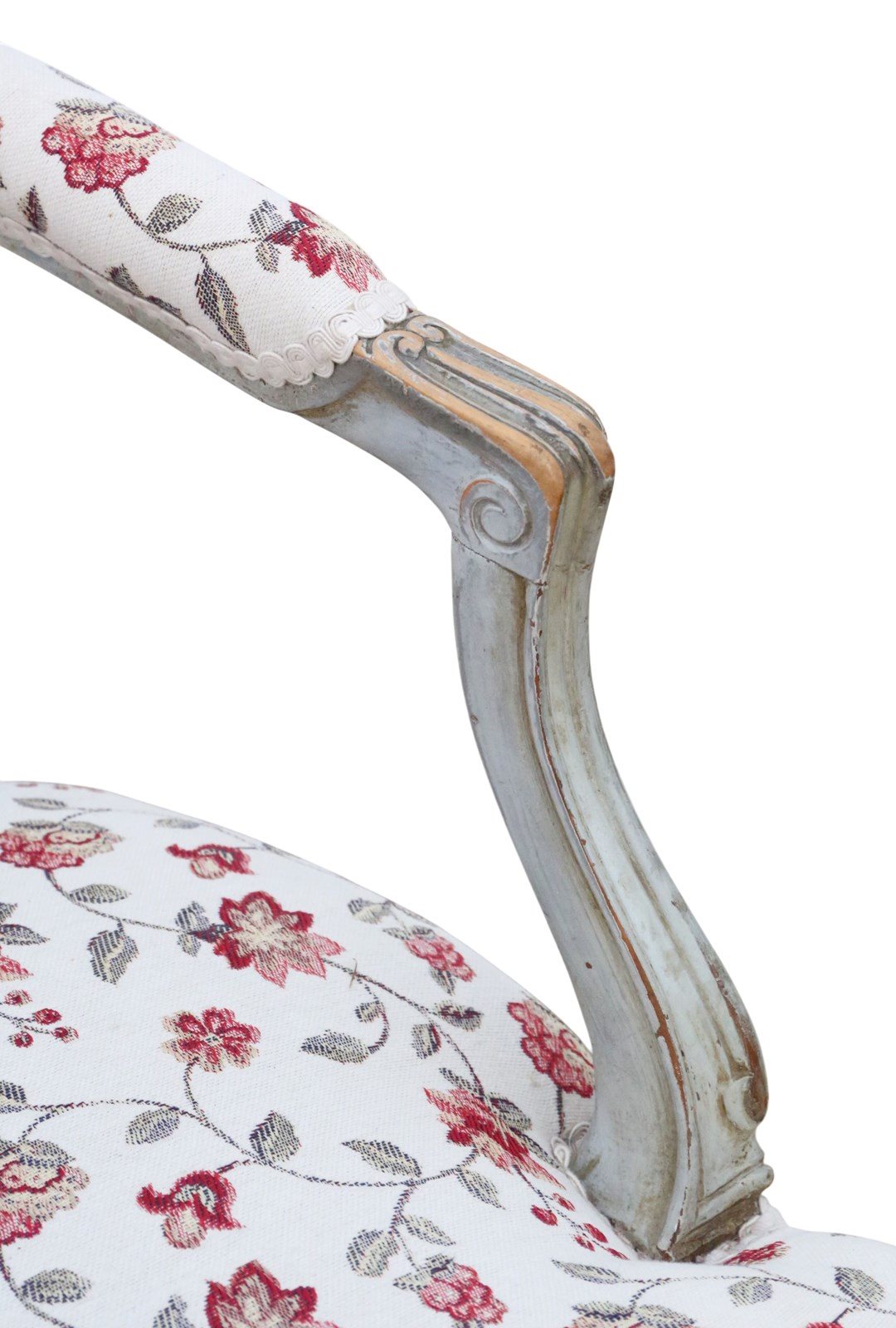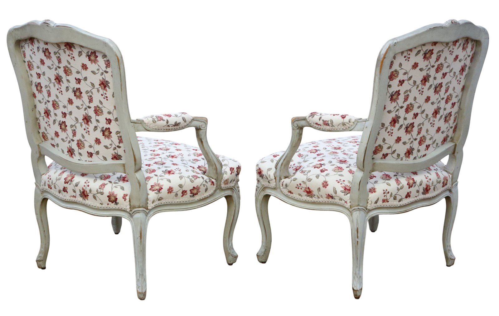 These elegant French armchairs, dating from around 1900, display attractive colour and patina through age-developed paintwork. Full of charm and character, they are in very good condition with no significant marks, and have been recently reupholstered; this makes them a rare decorative find that would enhance any period or eclectic interior.