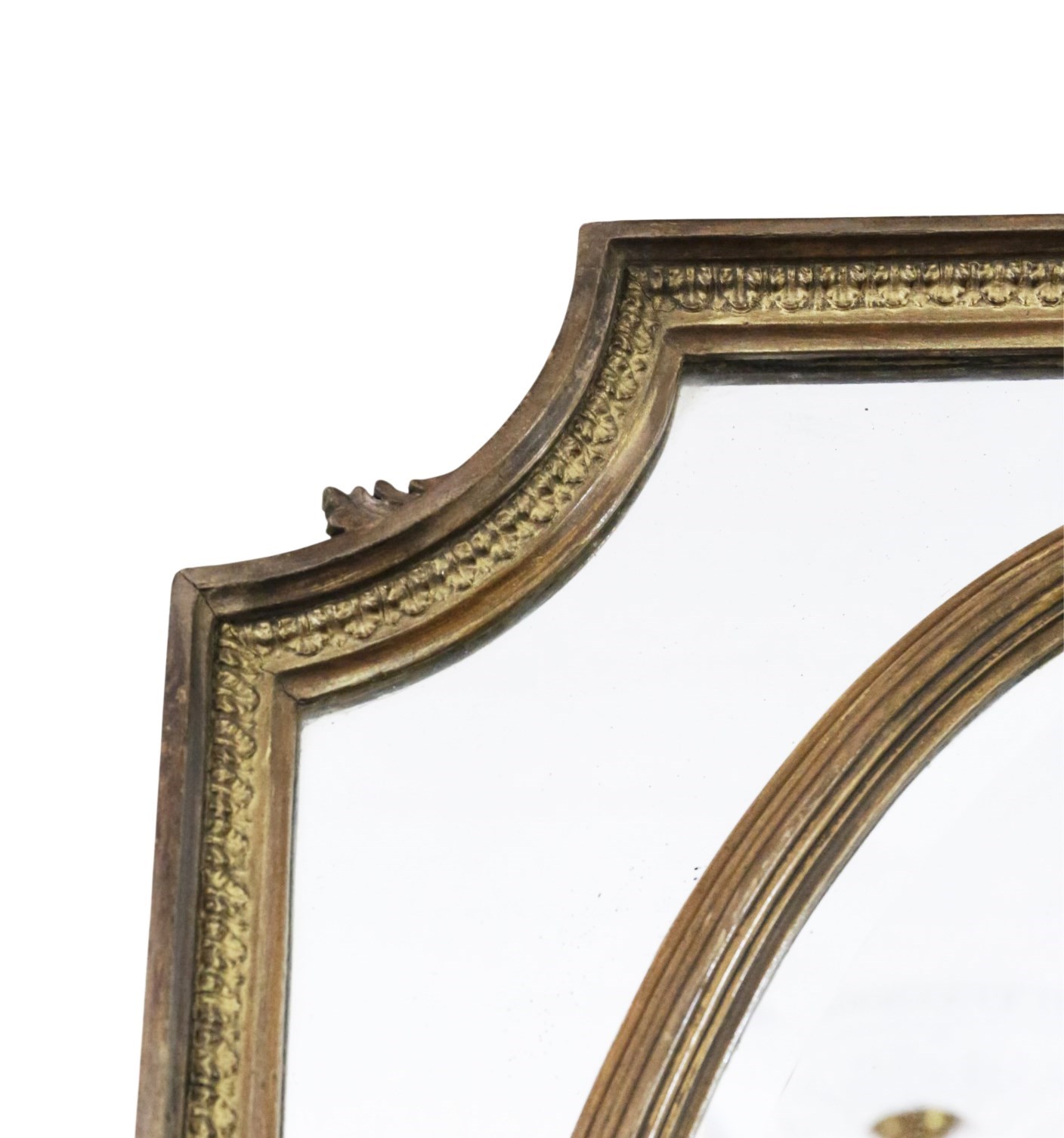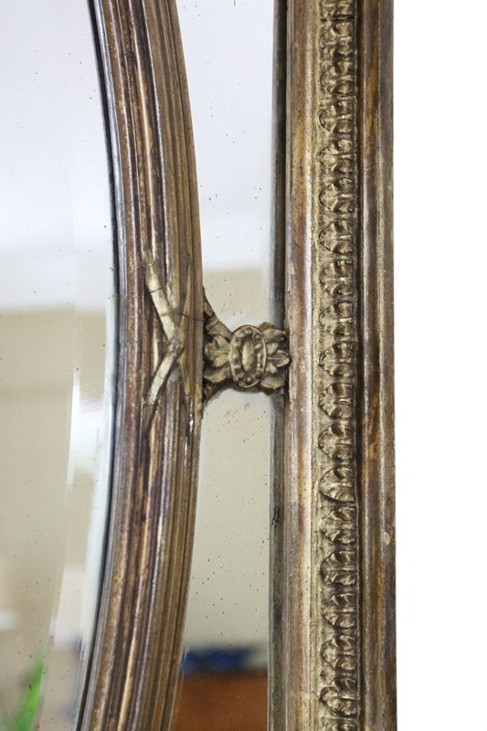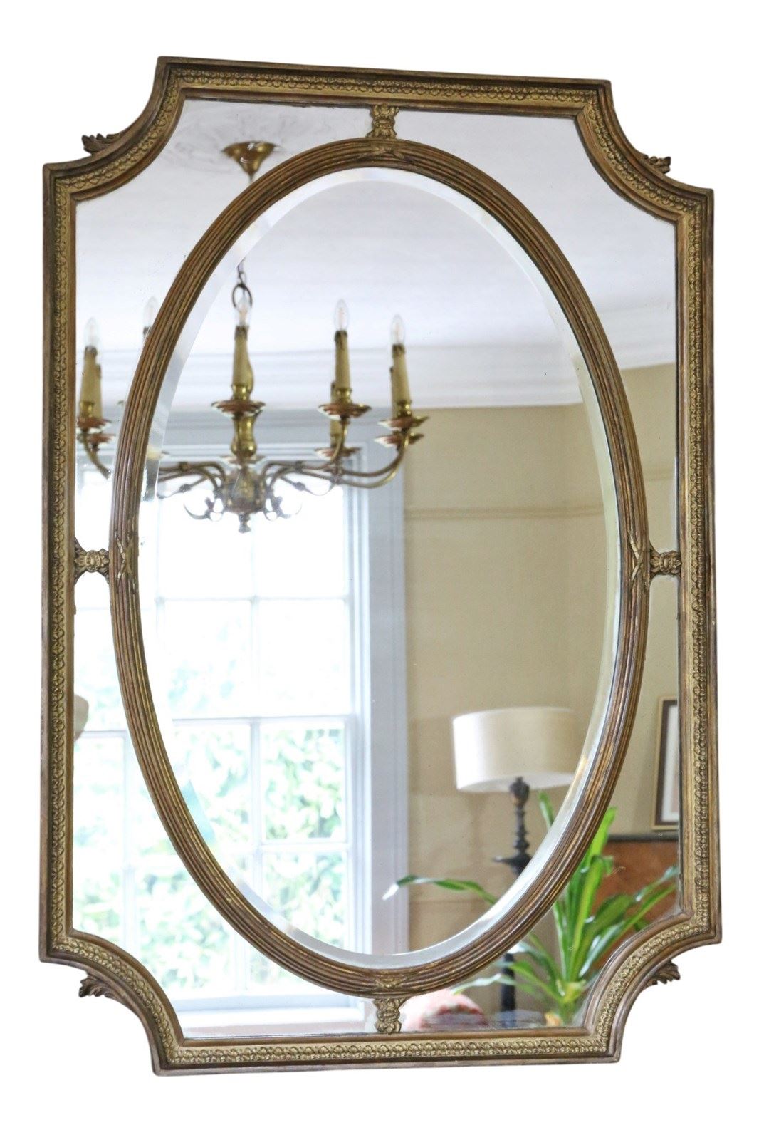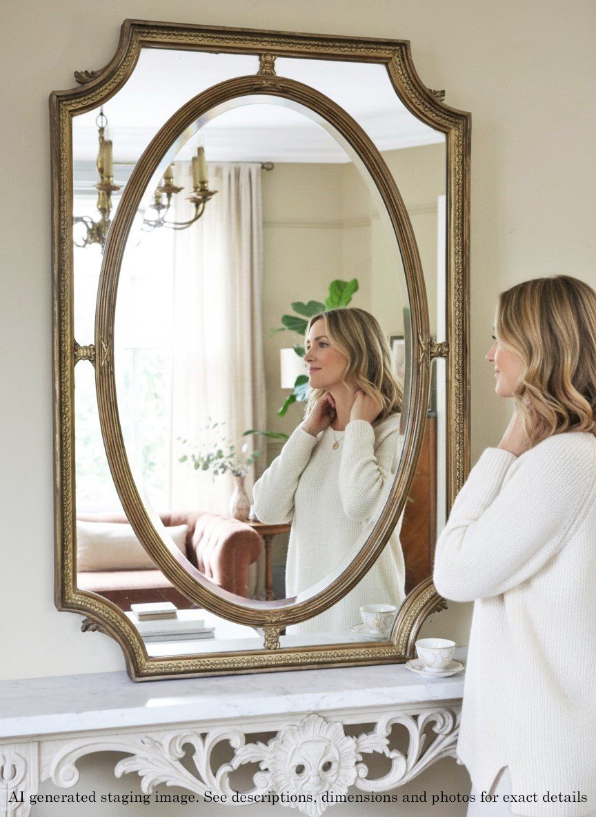 A beautifully ornate early 20th-century/ late 19th century overmantle mirror, with lovely aged finish. Full of charm and character, this rare decorative piece would make a stunning focal point in any room. The delicate frame features an oval inset within a rectangular surround, with elegant corner cutouts that create a refined and distinctive design. Can be hung portrait or landscape.